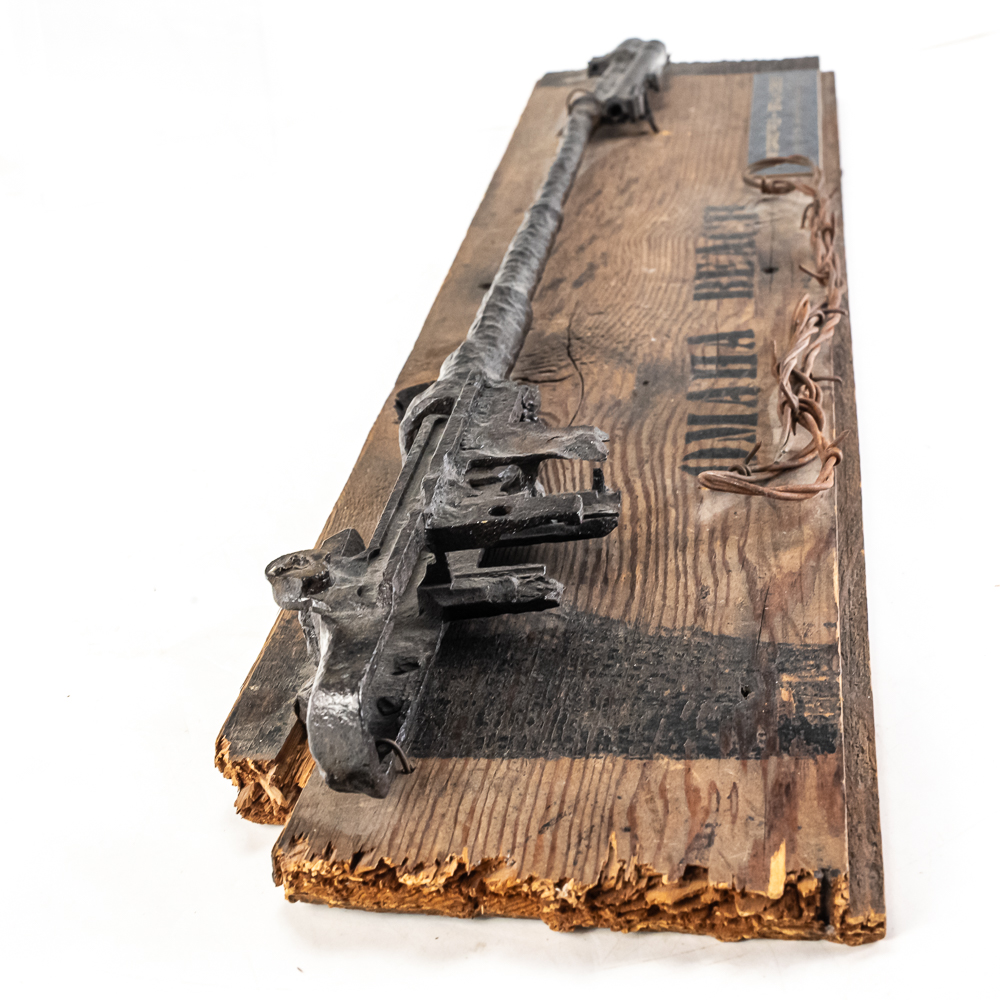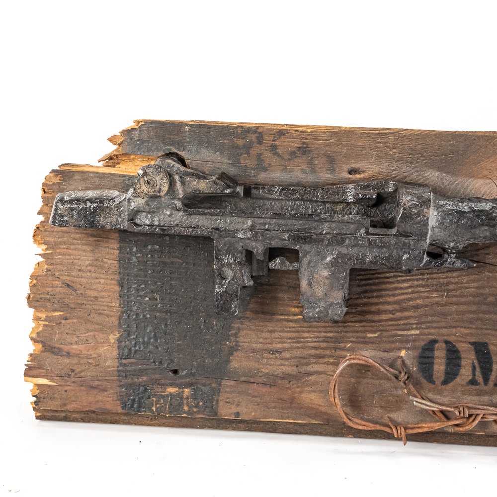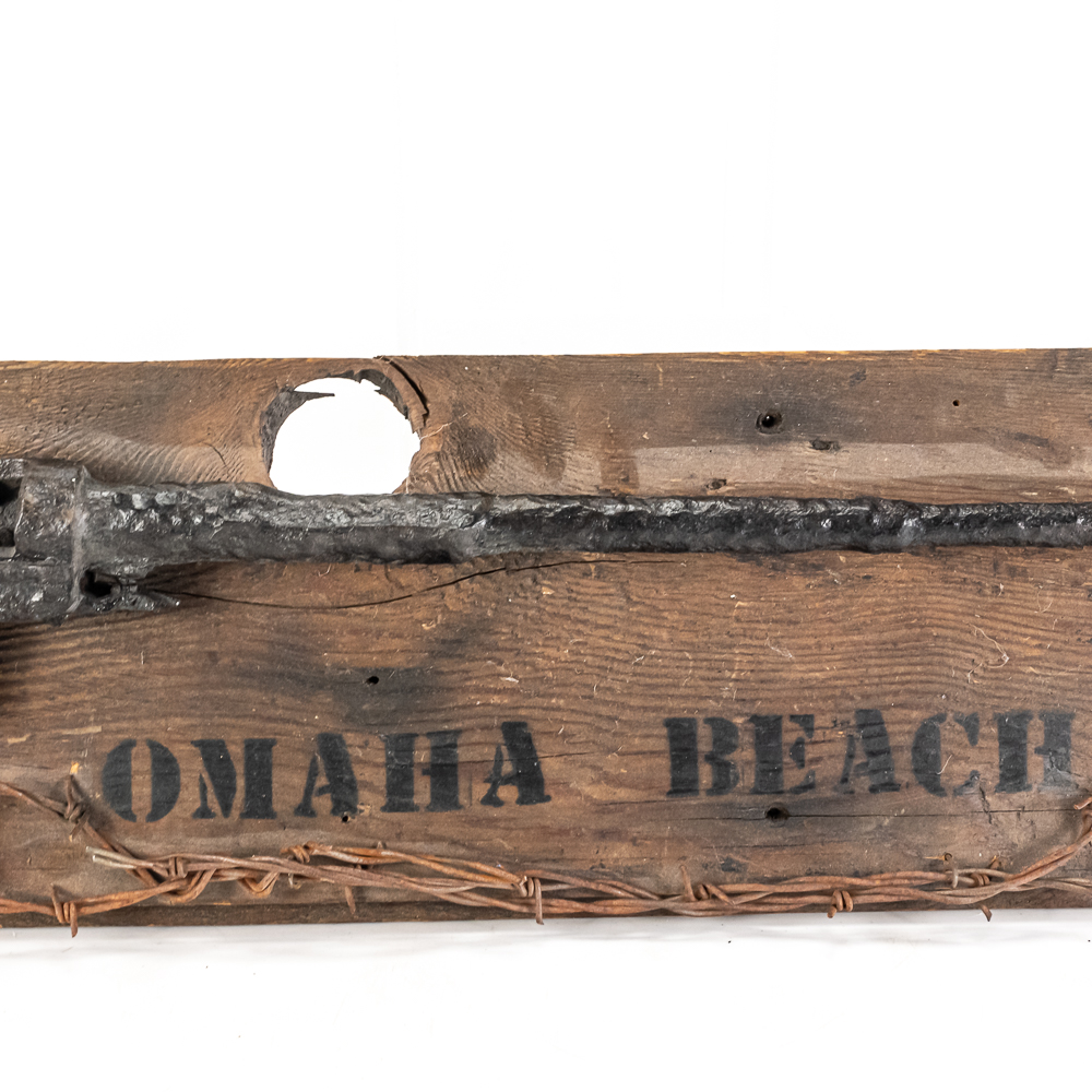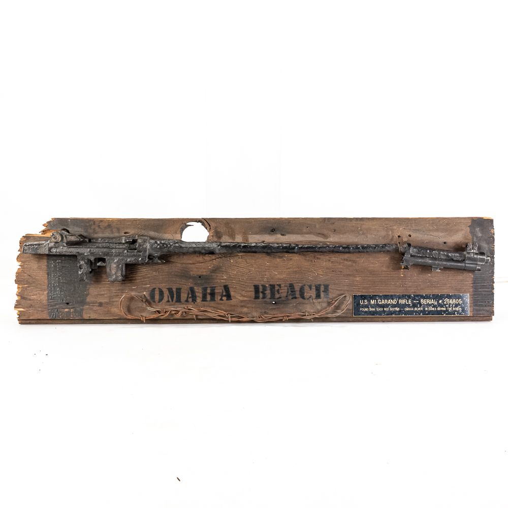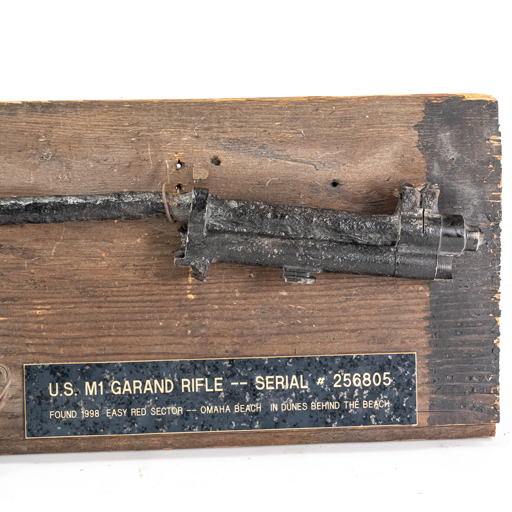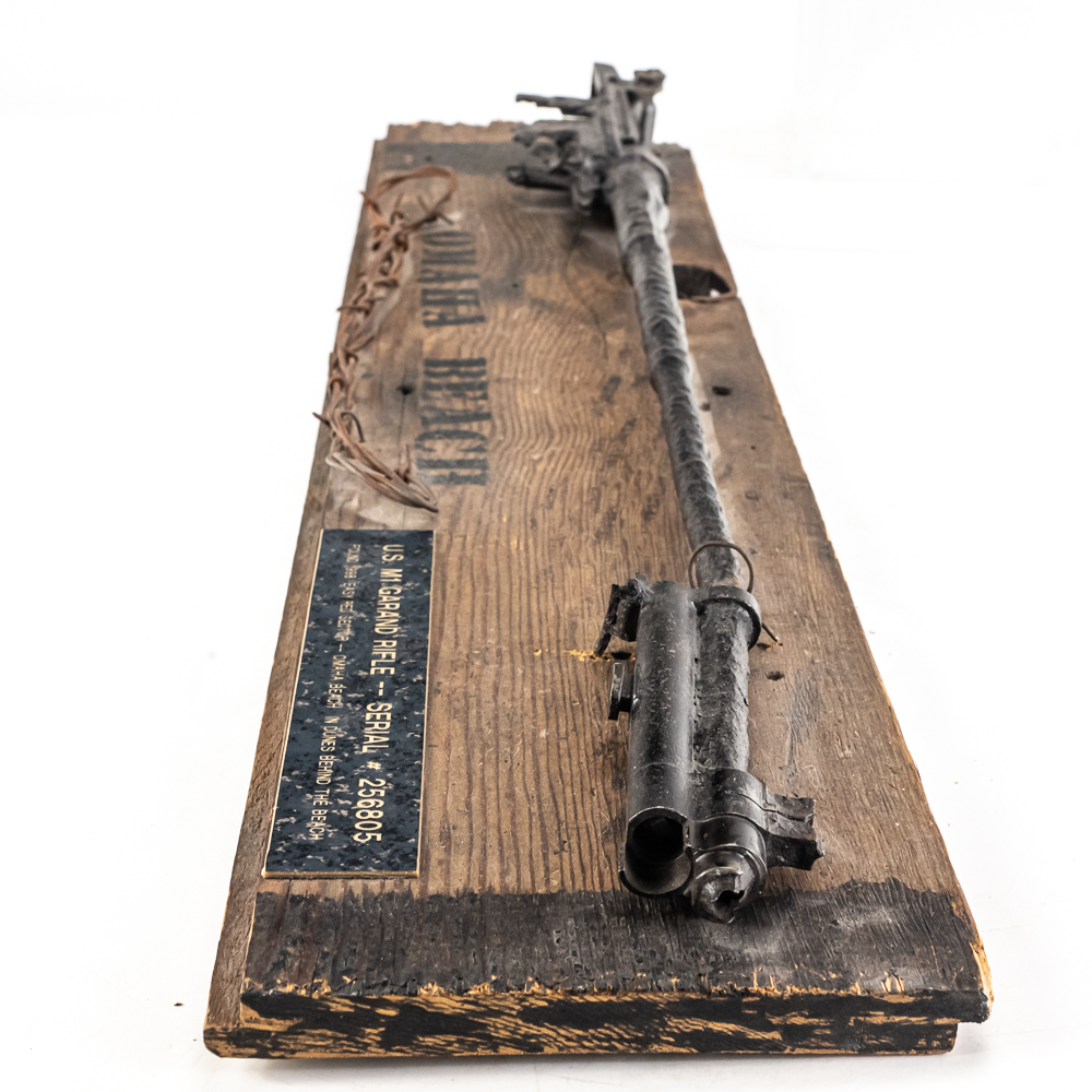Here we have a battlefield relic U.S. Springfield M1 Garand rifle receiver and barrel with serial number 256805. The serial number dates the rifles manufacture to January/February 1944. This relic was discovered in 1998 within the dunes of the Easy Red Sector of Omaha Beach—the site of some of the most intense fighting during the D-Day landings. The relic is mounted on a rustic wood plank “OMAHA BEACH” stenciling and a segment of period-style barbed wire. A plaque is attached to the display, describing the relic and its discovery. The metal components are heavily oxidized and pitted, consistent with long-term exposure to the coastal elements and sand, while the wooden stock is entirely absent, common with excavated battlefield finds. This piece represents a significant historical artifact of the 20th century’s most pivotal military operation. Please see photos for overall condition. Part of the John Bannister Collection. L 33″, W 7″, D 2.5″