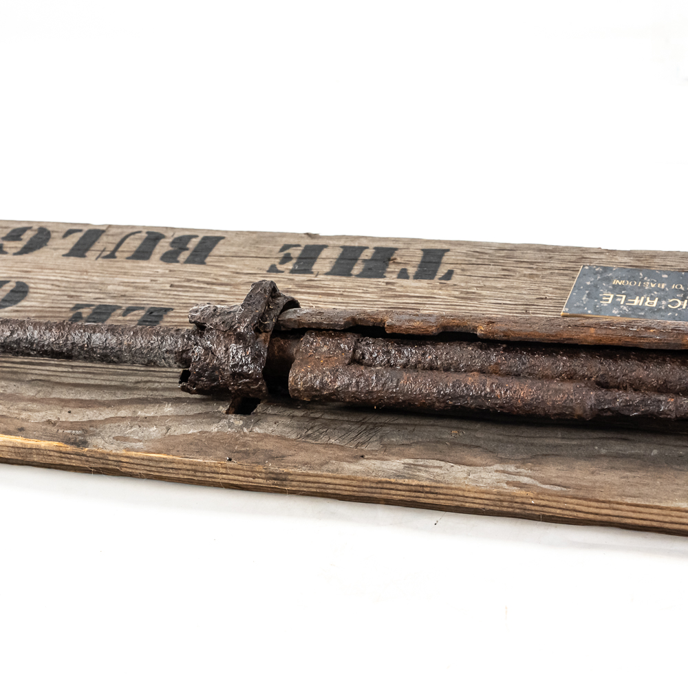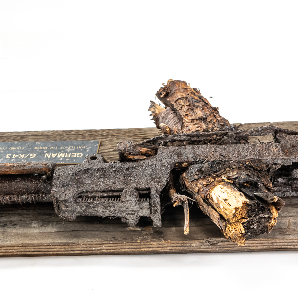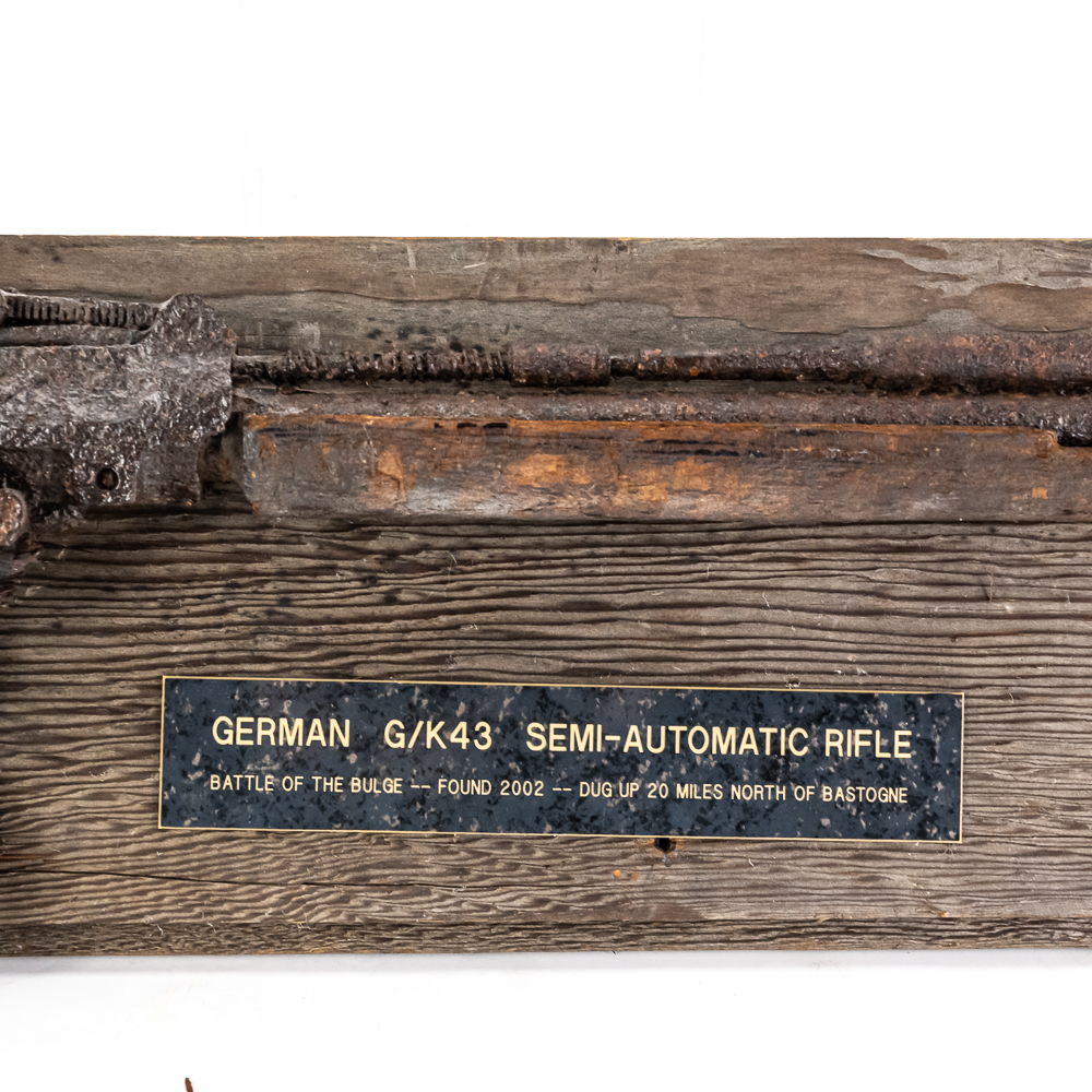 Here is a battlefield relic German G/K43 rifle receiver, trigger group and barrel, recovered from the historic Ardennes region. Mounted on a rustic wood plank, the piece features a descriptive plaque stating it was unearthed in 2002, approximately 20 miles north of Bastogne, firmly linking it to the Battle of the Bulge. The rifle exhibits heavy oxidation and significant metal loss consistent with being buried for over half a century. A tree root had grown through the receiver/bolt area. The wooden stock is almost entirely decomposed, with only the lower portion of the forward stock remaining. This is a great opportunity to obtain a battlefield recovered relic from the Ardennes Forest. Please see photos for overall condition. Part of the John Bannister Collection. L 33″, W 7.5″, D 3.5″.