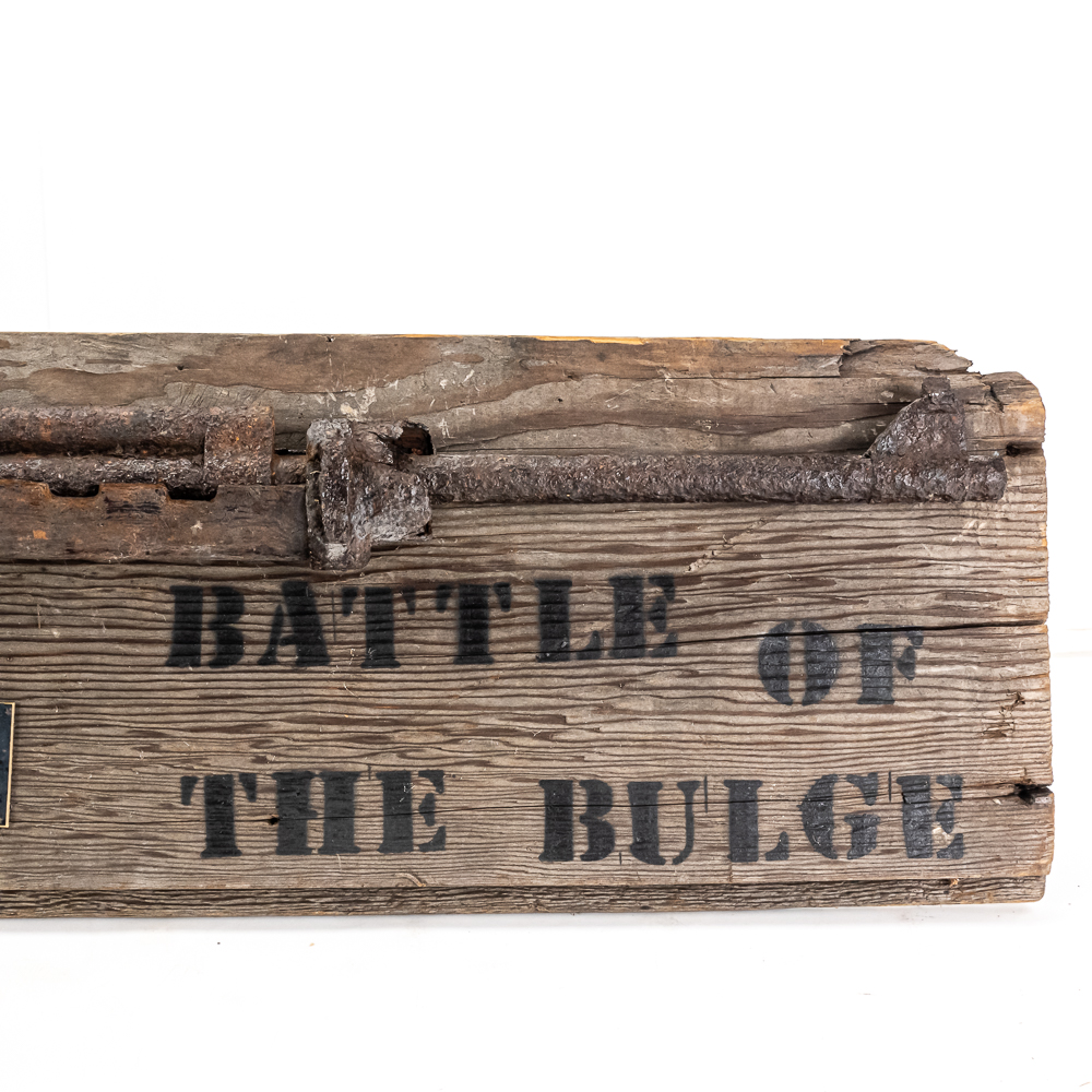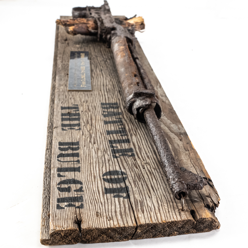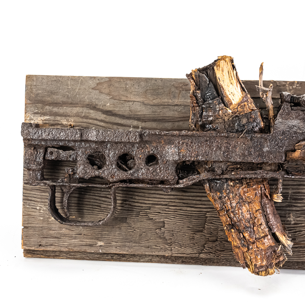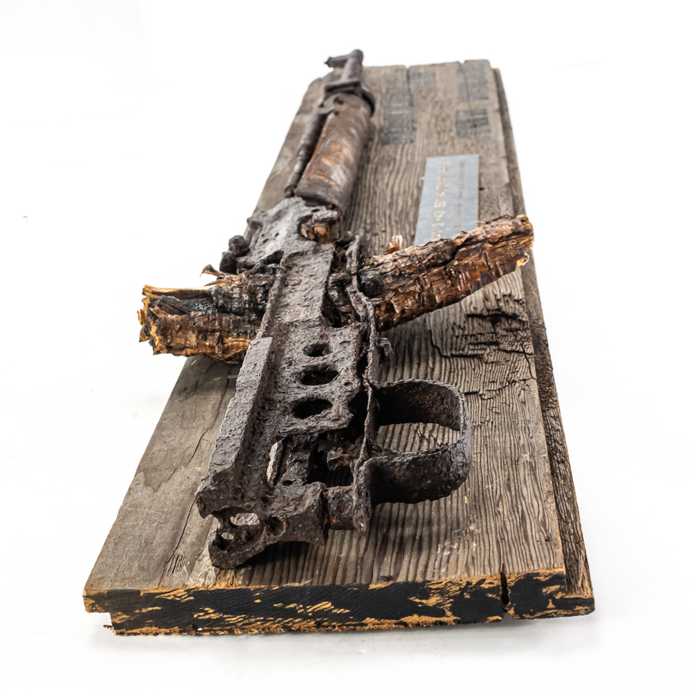 Here is a battlefield relic German G/K43 rifle receiver, trigger group and barrel, recovered from the historic Ardennes region. Mounted on a rustic wood plank, the piece features a descriptive plaque stating it was unearthed in 2002, approximately 20 miles north of Bastogne, firmly linking it to the Battle of the Bulge. The rifle exhibits heavy oxidation and significant metal loss consistent with being buried for over half a century. A tree root had grown through the receiver/bolt area. The wooden stock is almost entirely decomposed, with only the lower portion of the forward stock remaining. This is a great opportunity to obtain a battlefield recovered relic from the Ardennes Forest. Please see photos for overall condition. Part of the John Bannister Collection. L 33″, W 7.5″, D 3.5″.