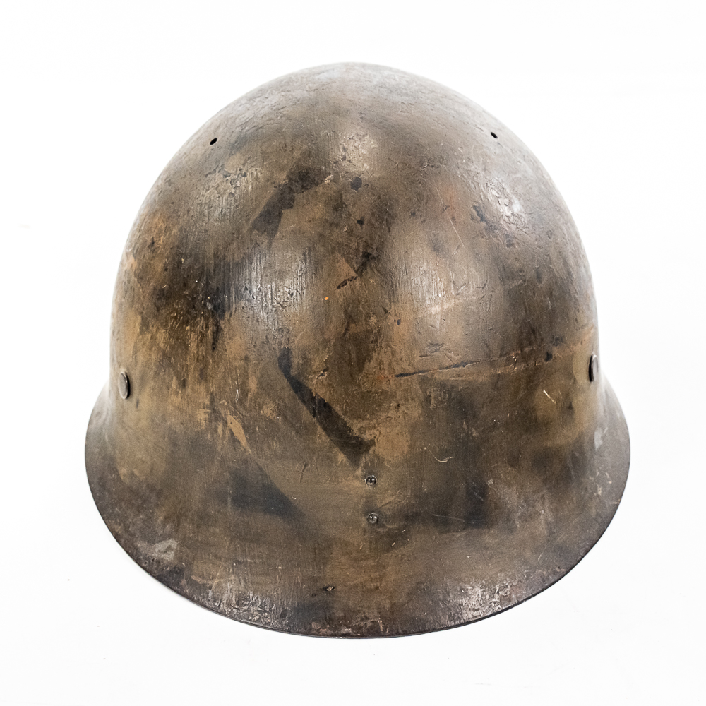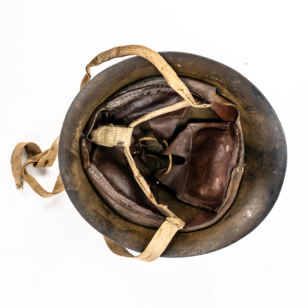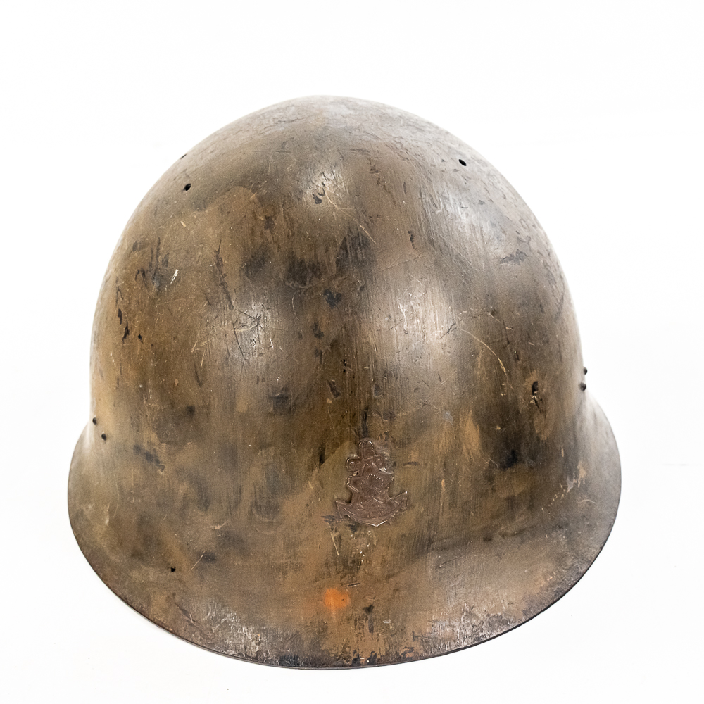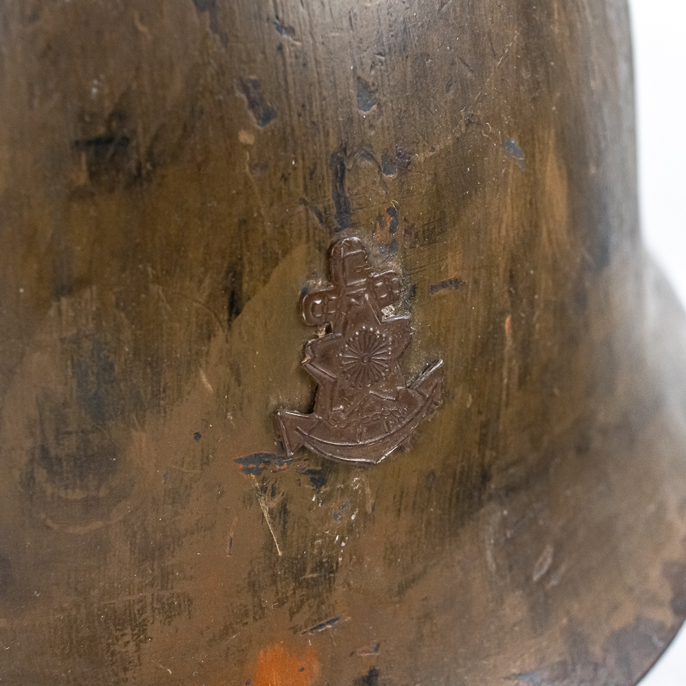 WWII Japanese Type 90 Naval Combat Helmet W/liner & Strap. Steel helmet retains a fair amount of the original paint. Metal Naval Landing Force insignia mounted on front. Leather liner exhibits honest wear. It is complete, supple and in very good condition overall. It has all the leather tabs present and the central rope threaded through them. The cloth chinstrap is present and complete, with some minor thread damage above left ear region. The interior has painted numerals “3659” on the top. Dimensions: 9.5 in wide x 11 in deep x 6 in tall. Each chin strap is approximately 22 in long. A very nice helmet. Please see photos for condition.