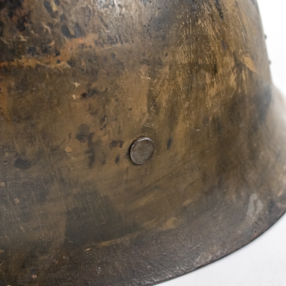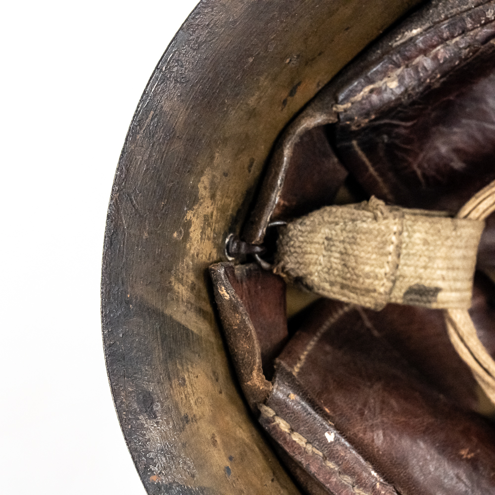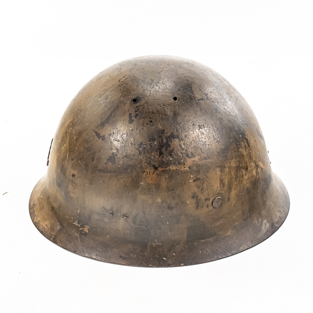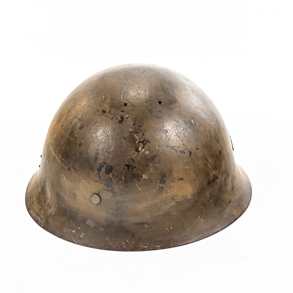 WWII Japanese Type 90 Naval Combat Helmet W/liner & Strap. Steel helmet retains a fair amount of the original paint. Metal Naval Landing Force insignia mounted on front. Leather liner exhibits honest wear. It is complete, supple and in very good condition overall. It has all the leather tabs present and the central rope threaded through them. The cloth chinstrap is present and complete, with some minor thread damage above left ear region. The interior has painted numerals “3659” on the top. Dimensions: 9.5 in wide x 11 in deep x 6 in tall. Each chin strap is approximately 22 in long. A very nice helmet. Please see photos for condition.