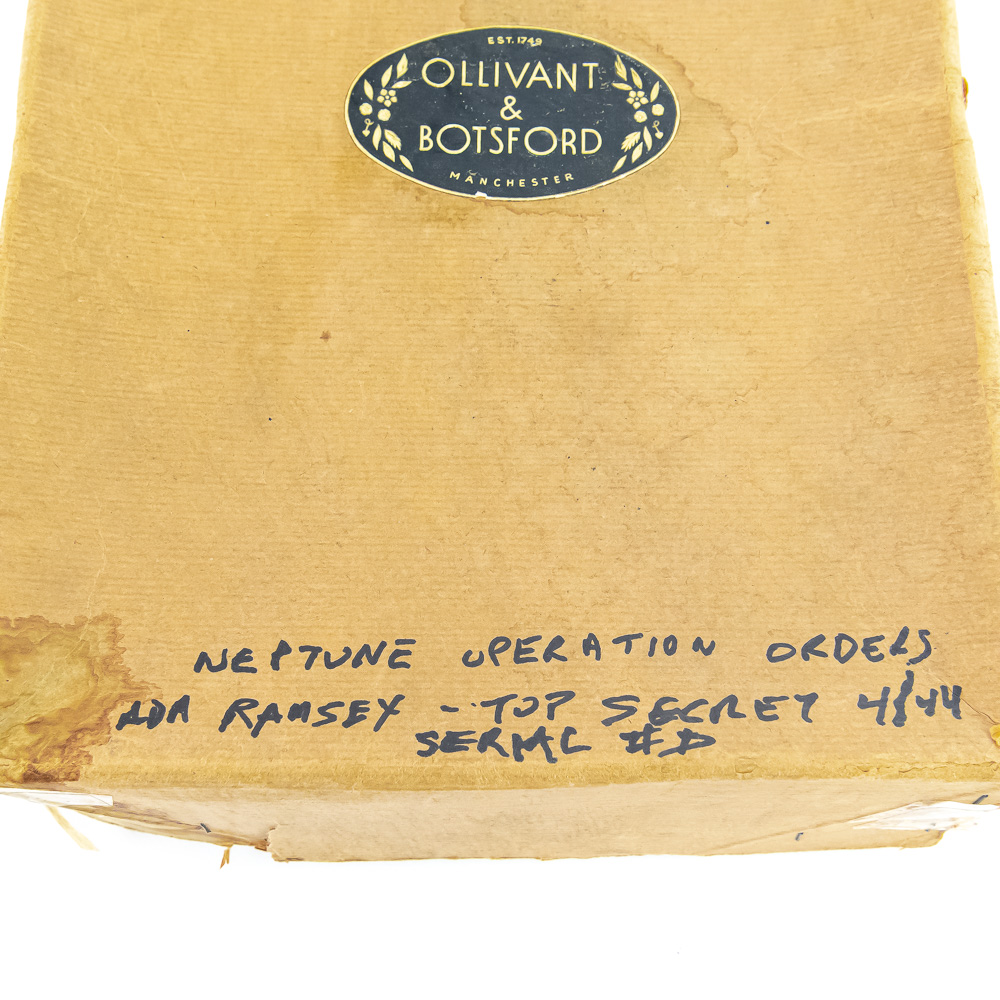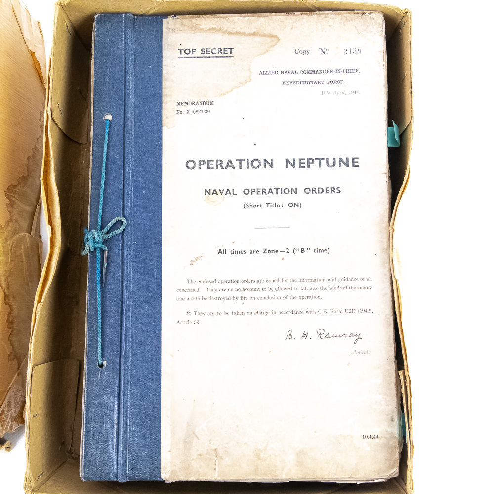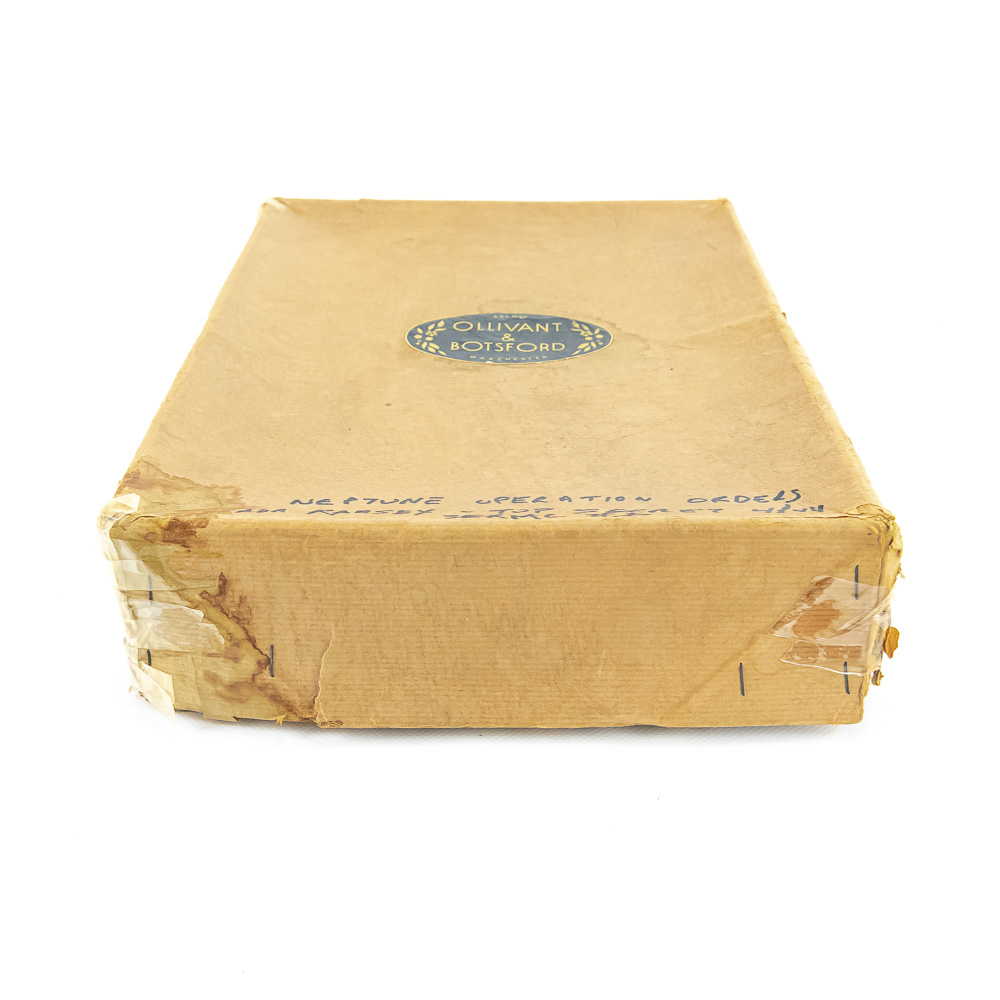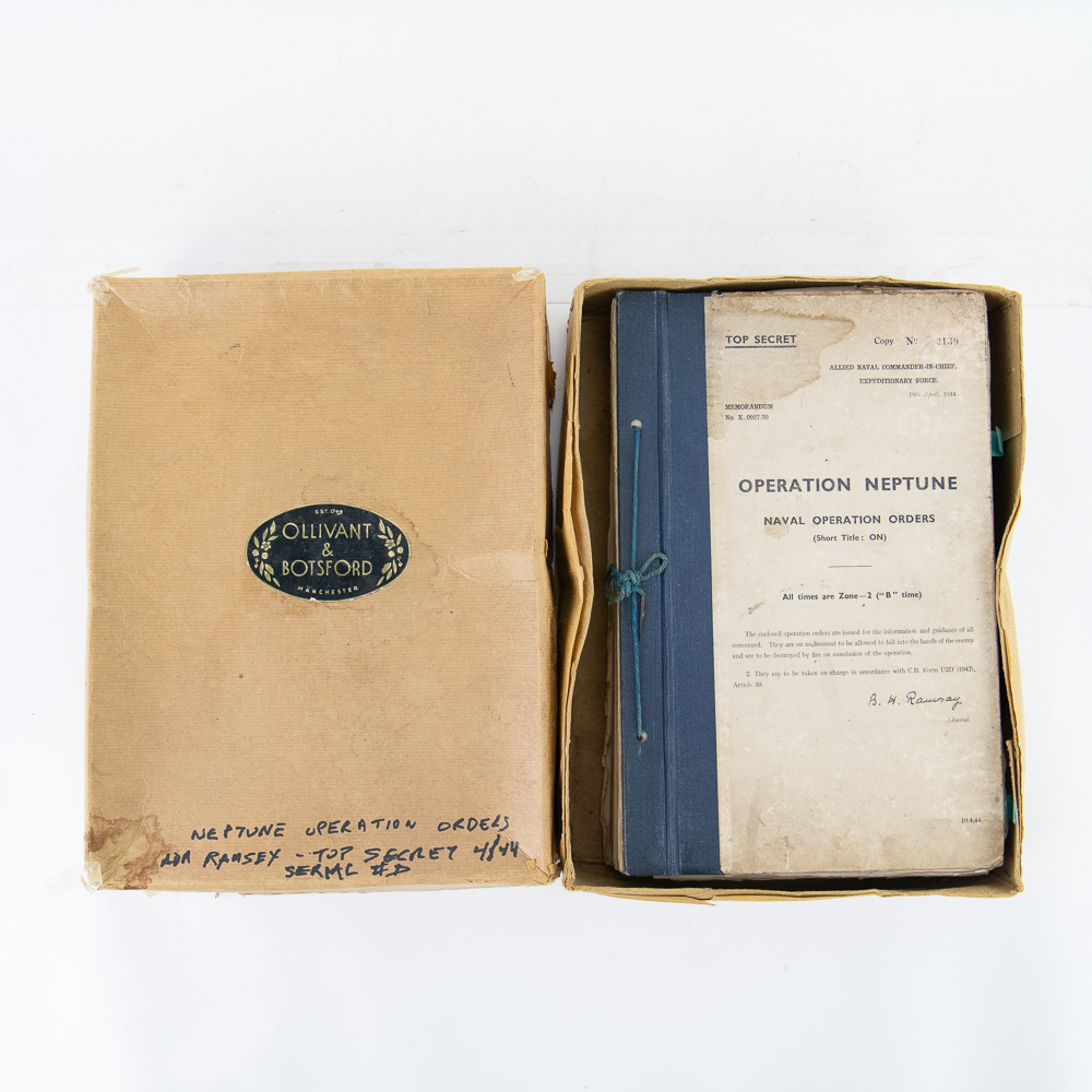This is a profoundly rare and historically significant primary source artifact: the original “TOP SECRET” Naval Orders for Operation Neptune, the naval component of the D-Day landings. Issued in April 1944 by the Allied Naval Commander-in-Chief, Expeditionary Force, this comprehensive command memorandum represents the tactical “blueprint” for the largest amphibious invasion in human history. This specific copy, numbered 2139, is housed in a period original “Ollivant & Botsford” storage box on which someone wrote the name of “ADM RAMSEY” (Admiral Sir Bertram Ramsay), the architect of the Dunkirk evacuation and the Allied Naval Commander-in-Chief for Overlord. The document is a masterpiece of military logistics, containing the “General Outline of the Operation” (ON 1) and exhaustive appendices that dictated the movement of thousands of vessels. The Table of Contents within this “TOP SECRET” dossier acts as the master key to the most complex naval operation ever executed. Labeled as the “Contents List” for the Naval Operation Orders (Short Title: ON), it enumerates 22 distinct sections that governed every facet of the Allied invasion. Key highlights from this list include ON 1 (General Outline of the Operation), providing the strategic framework; ON 2 (Operation MAPLE), detailing the critical minelaying plan; and ON 6, which provided the exhaustive instructions for minesweeping necessary to clear the “spouts” or channels for the invasion fleet. The list further details specialized tactical instructions such as ON 16, covering the establishment of GOOSEBERRIES (blockship shelters) and MULBERRIES (artificial ports), and ON 21, which details the top-secret Operation PLUTO for the underwater fuel pipeline. Perhaps most fascinating to collectors is the inclusion of ON 20, “Mickey Mouse Diagrams,” which refers to the simplified, highly visual tactical maneuver charts used by landing craft skippers. Within its pages are the precise geographical coordinates for the division of the Normandy coast into sectors—Utah, Omaha, Gold, Juno, Sword, and Band—along with detailed allocation lists of battleships like the Nevada, Texas, and Warspite. Most compelling is the “Certificate of Insertion of Amendments,” which shows hand-signed updates by staff officers as late as June 4, 1944, capturing the final, frantic adjustments made just 48 hours before the invasion. This set is a definitive piece of WWII history, offering an unfiltered look at the command-level planning that changed the course of the 20th century. The item exhibits expected age-related toning, minor edge fraying to the covers, and water staining to the exterior box and memorandum spine; however, the internal pages, technical diagrams, and critical coastal charts remain in excellent, legible condition. H 13″, W 9″, D 2.5″ Part of the John Bannister Collection. John acquired over a lifetime of collecting. Please see photos.
