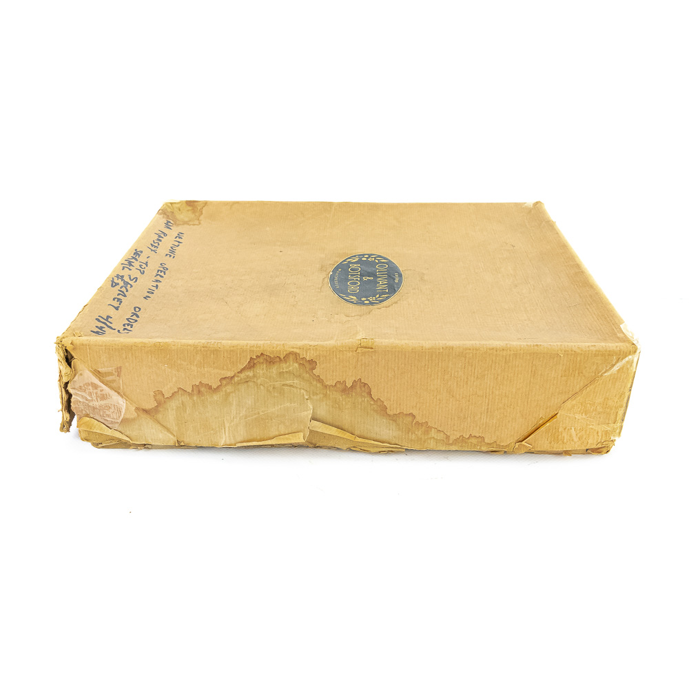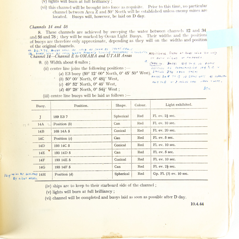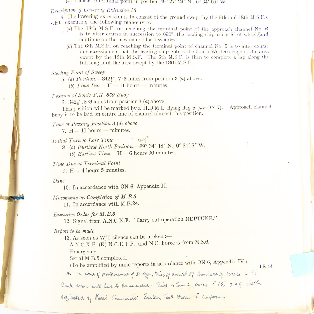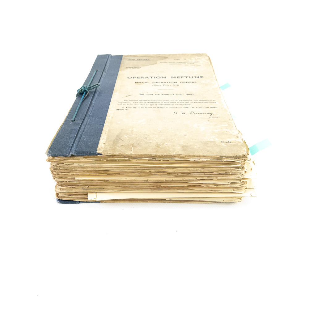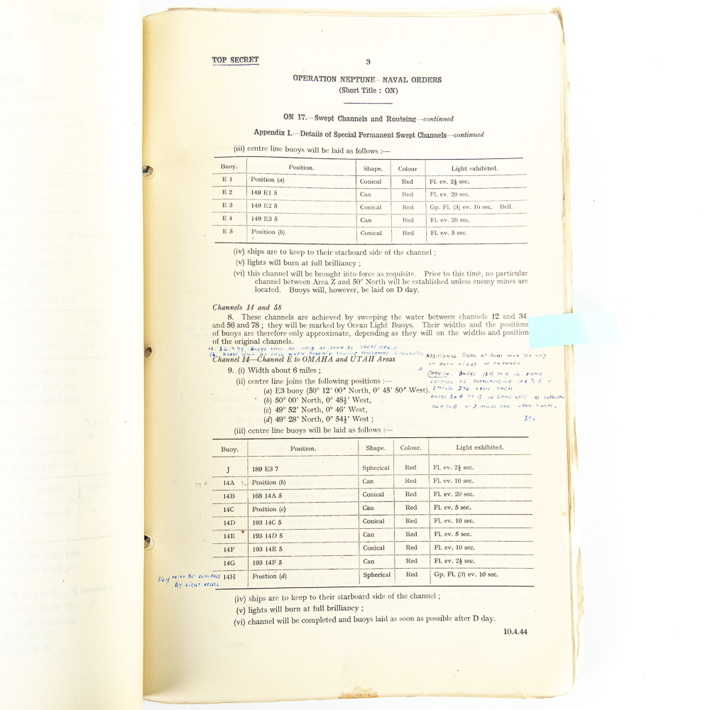 This is a profoundly rare and historically significant primary source artifact: the original “TOP SECRET” Naval Orders for Operation Neptune, the naval component of the D-Day landings. Issued in April 1944 by the Allied Naval Commander-in-Chief, Expeditionary Force, this comprehensive command memorandum represents the tactical “blueprint” for the largest amphibious invasion in human history. This specific copy, numbered 2139, is housed in a period original “Ollivant & Botsford” storage box on which someone wrote the name of “ADM RAMSEY” (Admiral Sir Bertram Ramsay), the architect of the Dunkirk evacuation and the Allied Naval Commander-in-Chief for Overlord. The document is a masterpiece of military logistics, containing the “General Outline of the Operation” (ON 1) and exhaustive appendices that dictated the movement of thousands of vessels. The Table of Contents within this “TOP SECRET” dossier acts as the master key to the most complex naval operation ever executed. Labeled as the “Contents List” for the Naval Operation Orders (Short Title: ON), it enumerates 22 distinct sections that governed every facet of the Allied invasion. Key highlights from this list include ON 1 (General Outline of the Operation), providing the strategic framework; ON 2 (Operation MAPLE), detailing the critical minelaying plan; and ON 6, which provided the exhaustive instructions for minesweeping necessary to clear the “spouts” or channels for the invasion fleet. The list further details specialized tactical instructions such as ON 16, covering the establishment of GOOSEBERRIES (blockship shelters) and MULBERRIES (artificial ports), and ON 21, which details the top-secret Operation PLUTO for the underwater fuel pipeline. Perhaps most fascinating to collectors is the inclusion of ON 20, “Mickey Mouse Diagrams,” which refers to the simplified, highly visual tactical maneuver charts used by landing craft skippers. Within its pages are the precise geographical coordinates for the division of the Normandy coast into sectors—Utah, Omaha, Gold, Juno, Sword, and Band—along with detailed allocation lists of battleships like the Nevada, Texas, and Warspite. Most compelling is the “Certificate of Insertion of Amendments,” which shows hand-signed updates by staff officers as late as June 4, 1944, capturing the final, frantic adjustments made just 48 hours before the invasion. This set is a definitive piece of WWII history, offering an unfiltered look at the command-level planning that changed the course of the 20th century. The item exhibits expected age-related toning, minor edge fraying to the covers, and water staining to the exterior box and memorandum spine; however, the internal pages, technical diagrams, and critical coastal charts remain in excellent, legible condition. H 13″, W 9″, D 2.5″ Part of the John Bannister Collection. John acquired over a lifetime of collecting. Please see photos.