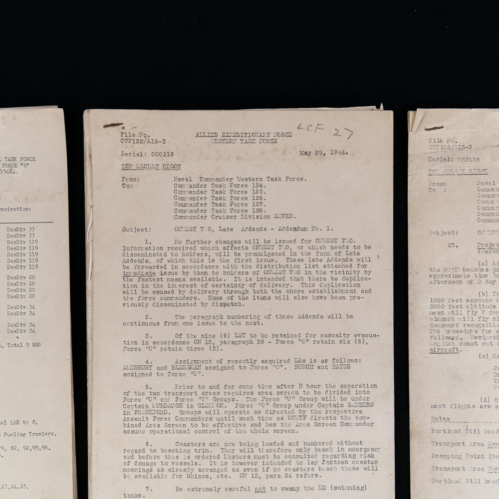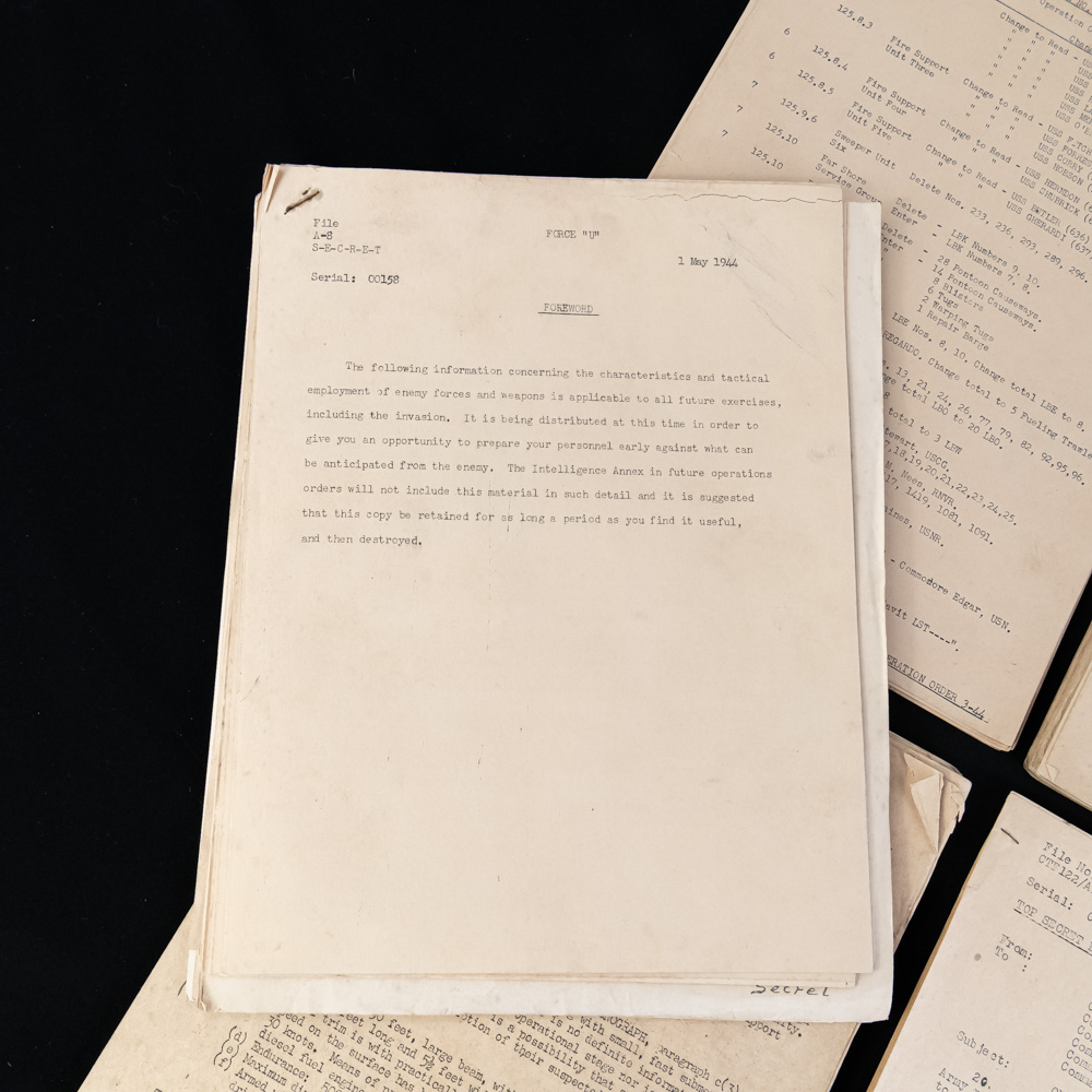 This expanded and historically significant archive consists of twelve distinct paper groupings of “TOP SECRET – BIGOT” intelligence documents, almost exclusively dated April and May 1944. Many of these documents likely refer to Operation Tiger, a major full-scale rehearsal for Utah Beach assault during the D-Day invasion of Normandy. Conducted From April 22nd through the 30th 1944 it involved around 30,000 American troops from U.S. Force “U” which was part of the 7th core. The location was slapped in sands in Devon, England, chosen because of its gravel beach, backing land, and nearby lagoon that closely resembled Utah beach in Normandy’s Cotentin peninsula. This exercise simulated every phase from embarkation to channel crossing to naval bombardment and amphibious landing using live ammunition for realism under general Dwight D Eisenhower’s orders. Exercise tiger encountered multiple failures including friendly fire an attack of German E boats on the nights of April 27th and 28th with the sinking of several LST’s period overall there is a accepted figure of 749 American servicemen that were killed in the operation comma much more than we’re actually killed on the Utah beach invasion of the Normandy coast period. The value of this operation is immense in that it allowed allied forces to learn from these costly mistakes and make the invasion of the Normandy coast a success. The documents in this grouping, served as the essential tactical foundation for the final planning phase of Operation NEPTUNE, issued to high-ranking personnel just weeks before the June 6th invasion. The archive features an impressive array of intelligence, including technical bulletins on German “E-Boat” tactics, “Marder” midget submarines, and the Henschel Hs 293 radio-controlled glider bomb, complete with instructional sketches. Crucially, the collection includes detailed diagrams of “Atlantic Wall” beach defenses like “Czech Hedgehogs” and “Belgian Gates,” which were vital for the demolition teams clearing paths for the landing craft. Also present are the specific Task Organization orders for Assault Force “U” (Utah Beach) under Rear Admiral Don P. Moon, logistical data for “Mulberry” artificial harbors, hourly tide tables, and medical evacuation plans for “ineffectives.” A hallmark of their extreme sensitivity and restricted distribution is the presence of individual serialization; many of these documents bear low-digit control numbers such as 000126, 000119, 00144, 00047, 000134, 00611, 00158, and 00191. Because the “BIGOT” security classification was even higher than Top Secret—granted only to those with specific knowledge of the D-Day date and location—these documents were printed in extremely small batches and often carried strict mandates for their immediate destruction following use. This rare survival of operational intelligence provides an unfiltered look at the immense complexity and secrecy of the Allied assault. The collection is in fair to good vintage condition, exhibiting expected age-toning, minor peripheral edge wear, foxing, and oxidation from original staples consistent with 80-year-old field intelligence. Some of the documents may be missing pages. Four groupings of documents measure H 10.5″ x W 8.5″ and eight groupings of documents measure H 13.5″ x W 8.5″. 1) Serial: 000126. Dated 30 May 1944. TOP SECRET BIGOT. Subj: ONWEST TWO, Late Addenda-Addendum No. 3. T2) Serial: 000119. Dated 29 May 1944. TOP SECRET BIGOT. Subj: ONWEST TWO, Late Addenda-Addendum No. 1. Total of 5 pages, stapled. “LCF 27” written in pencil.3)Serial: 00144. TWO packets, both also dated 21 April 1944. TOP SECRET BIGOT-NEPTUNE. Subj: ANNEX “A” TO OPERATION PLAN NO. 2-44. Intelligence Plan. Total of 17 pages, stapled and 3 pages stapled. 4)Serial:00047. Dated 24 May 1944. TOP SECRET BIGOT NEPTUNE. WESTERN NAVAL TASK FORCE “U”. Operation 3-44. Change No 2. Total of 15 pages, stapled.5) Serial: 000134. Dated 31 May 1944. TOP SECRET BIGOT. ALLIED EXPEDITIONARY FORCE WESTERN TASK FORCE. File No CTF 122/A16-3. Total of 3 pages, stapled.6) Serial 00611. Dated 9 May 1944. CONFIDENTIAL. Eleventh Amphibious Force. Force Training Memorandum No. T2-44. Total of 5 pages, stapled. 7) Serial: 00158. Dated 1 May 1944. S-E-C-R-E-T. “Force“U“. File A-8. Total of 25 pages, stapled.8) Serial: 00191. Dated 26 May 1944. TOP-SECRET-BIGOT-NEPTUNE. ALLIED EXPEDITIONARY FORCE WESRTERN NAVAL TASK FORCE ASSAULT FORCE “U”. TASK GROUP 125.7 LCH 209 HEADQUARTERS SHIP PLYMOUTH, DEVON. Total of 32 pages, stapled. Marked “No. 22” in ink on top right corner. 9)Reg No.:FM329-1. No date. BIGOT-TOP SECRET. PORT “MULBERRY” INFORMATION. Total of 16 pages. Bottom 15 are stapled. 10) NOWTF INTELLIGENCE BULLETIN NO. 1 21 MAY 1944. TOP SECRET-BIGOT. Total of 13 pages stapled Includes pages from the NEPTUNE MONOGRAPH CTF122. With two maps-Order of Battle Map 18 ending 17 May 1944 and Optimum movements of enemy reinforcements into the Neptune Area on D Day 12 May 1944 and Tide charts. 11)PORT FACILITIES AVAILABLE. BIGOT-TOP SECRET. Page 3 of a document. Features Medical and Salvage directives.
