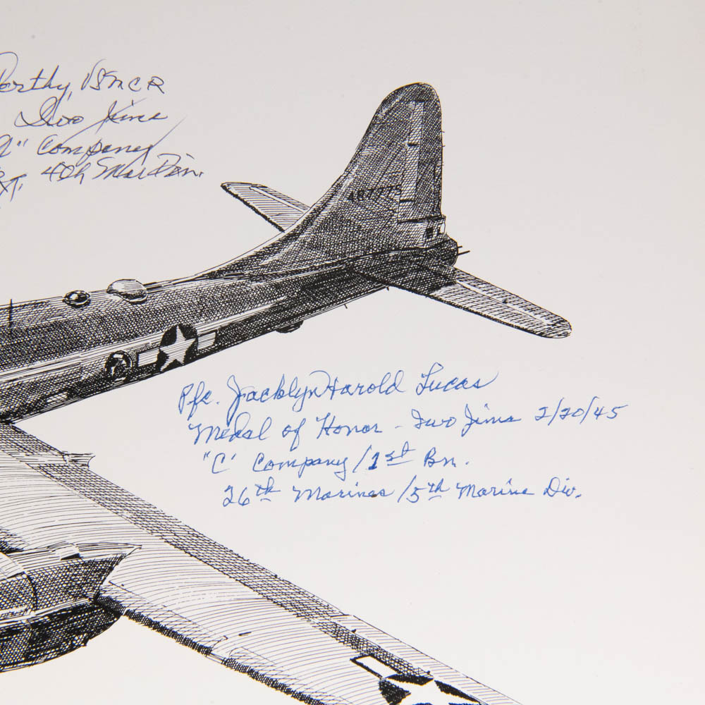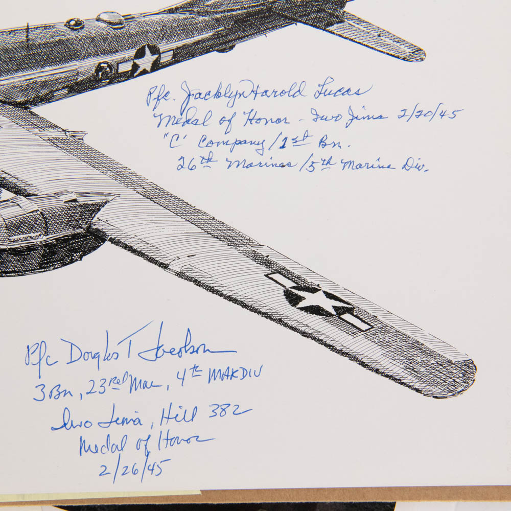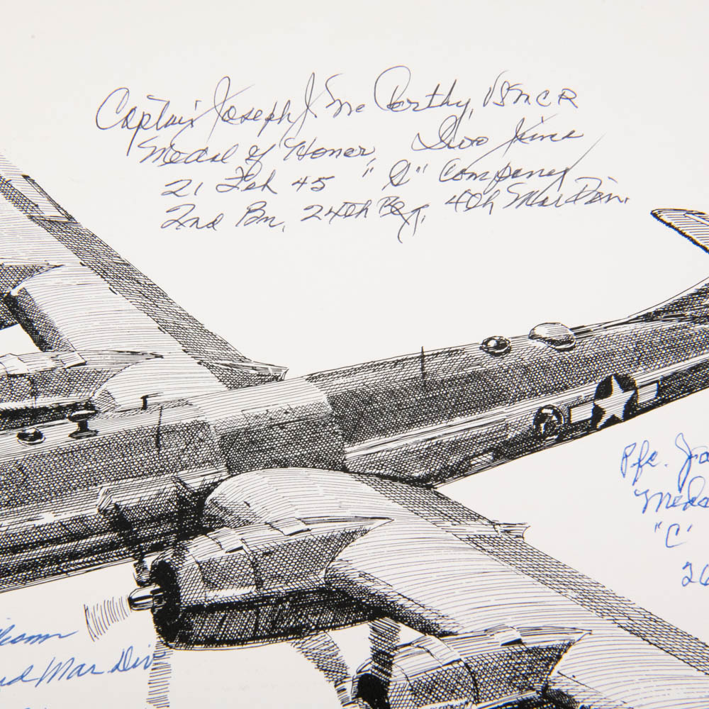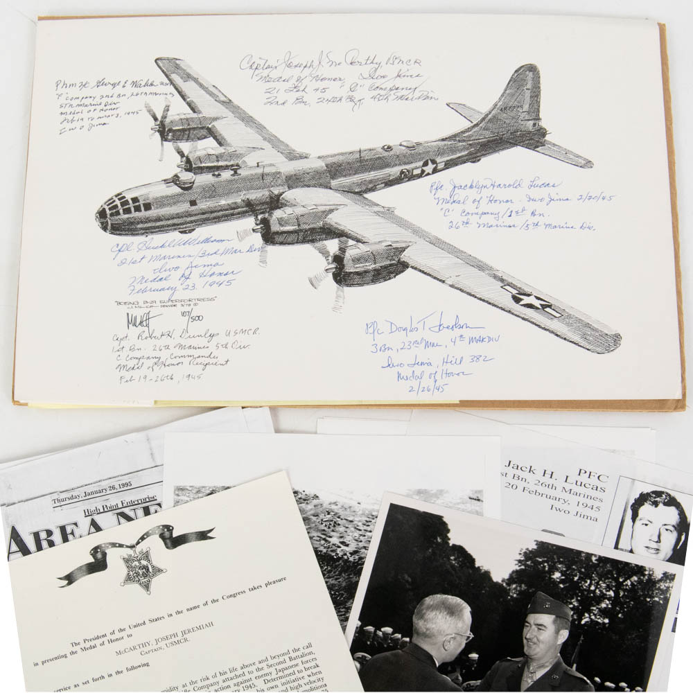This is an extraordinary archive of WWII memorabilia, specifically focusing on Medal of Honor (MOH) recipients from the brutal Battle of Iwo Jima. The centerpiece is a limited edition, numbered print (107/500) of a Boeing B-29 Superfortress by an artist named Millett (dated 1978, Denver, CO). This print is not signed by B-29 pilots, as one might first assume, but is instead a unique collaborative piece signed by six Iwo Jima Medal of Honor recipients, all of whom are mentioned in the accompanying notes and documents: Capt. Robert H. Dunlap (USMCR), Cpl. Hershel W. Williams (USMCR), Capt. Joseph J. McCarthy (USMCR), Pfc. Douglas T. Jacobson (USMCR), Pfc. Jacklyn Harold Lucas (USMCR, the youngest MOH recipient since the Civil War), and PhM 3/c George E. Wahlen (USNR). Also included is a pivotal black-and-white photograph depicting President Harry S. Truman presenting the Medal of Honor to Capt. Joseph J. McCarthy on October 5, 1945, at the White House, which is signed by Captain McCarthy below the image. A White House document (likely a certificate or letter), bearing what appears to be a printed Harry Truman signature, details the MOH citation for McCarthy. The collection further includes numerous autograph note cards from the veterans (including one from Lucas mentioning his wife, Ruby), and original newspaper clippings detailing their heroic actions. The items are primarily paper and photographic prints, exhibiting light age-related toning and expected creasing on the newspaper clippings, but the signatures are bold and clear on the B-29 print, which itself is in very good condition. This is an unparalleled collection of WWII valor. Part of the John Bannister Collection. H 18″, W 24″, D 0.25″ Please see photos.