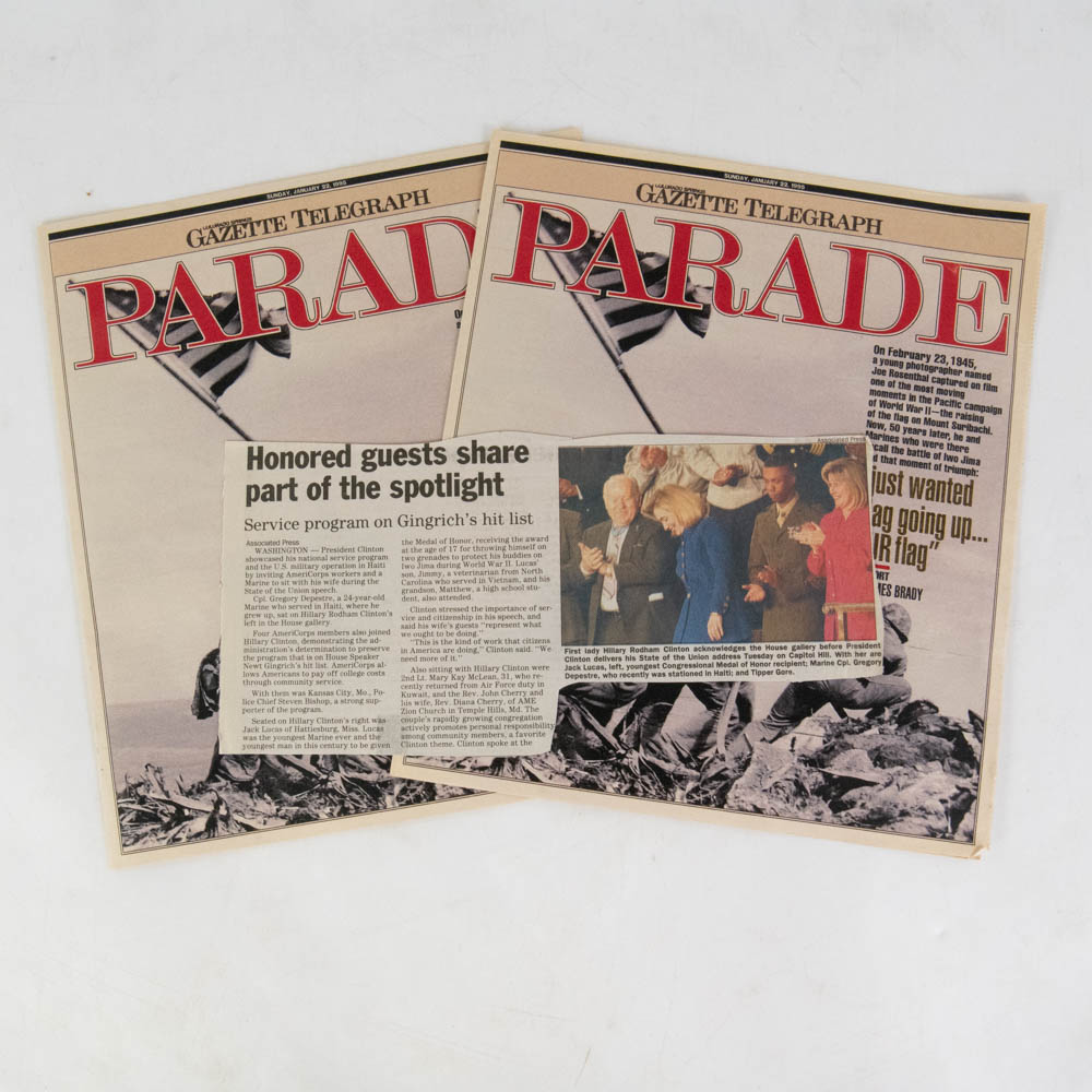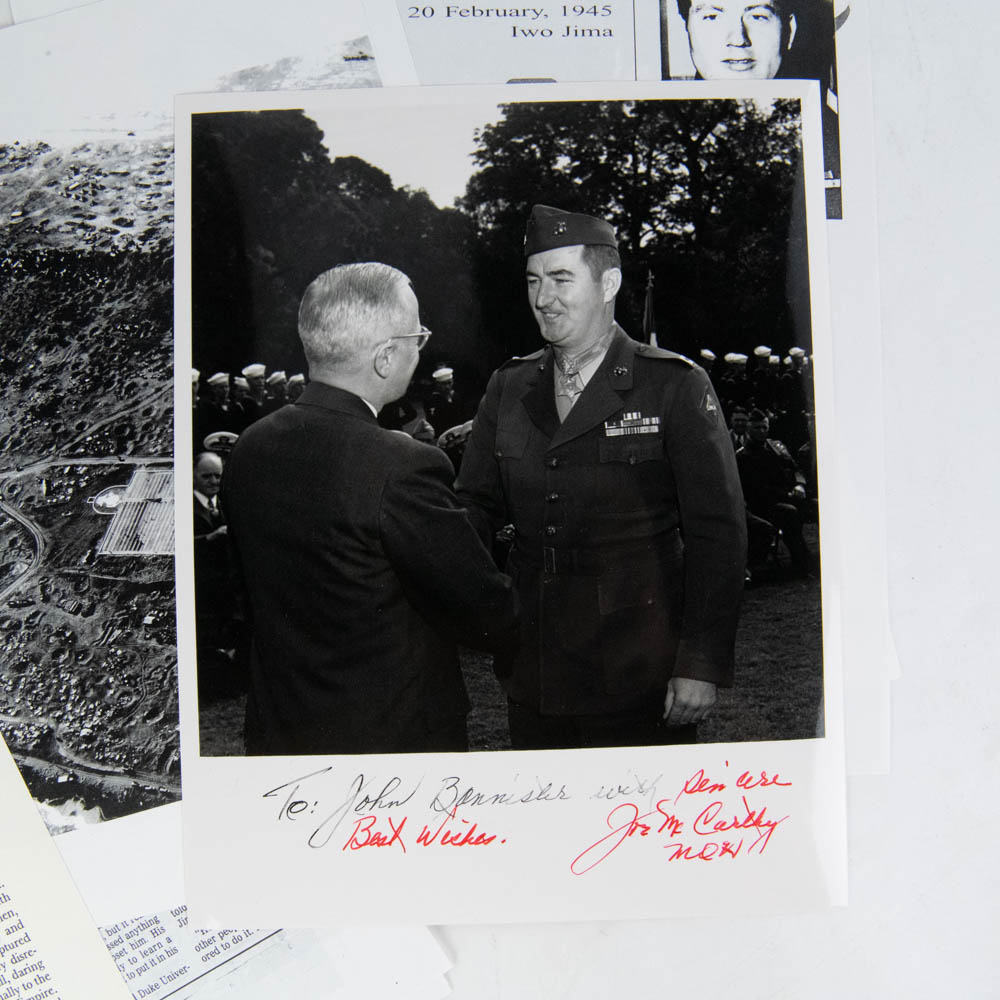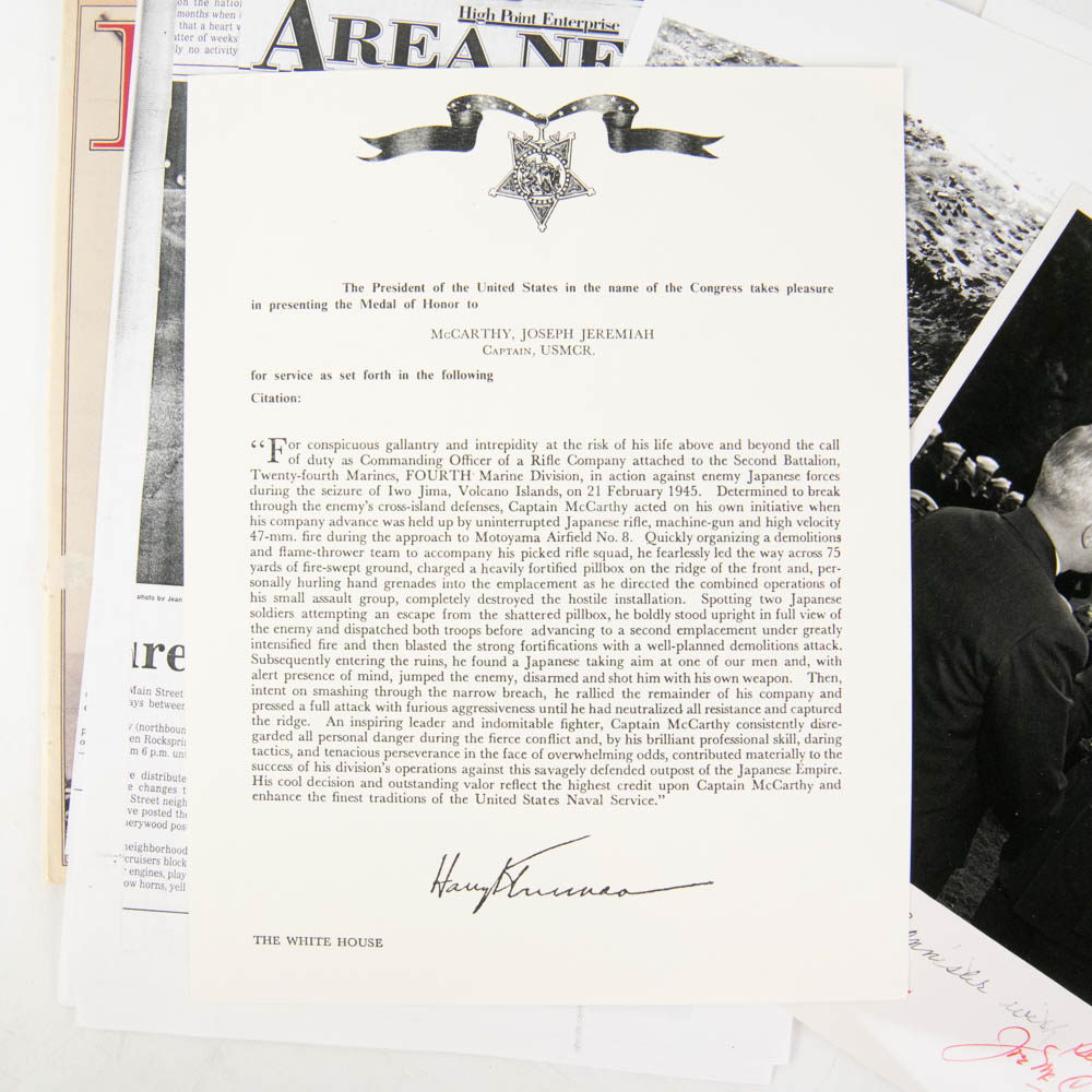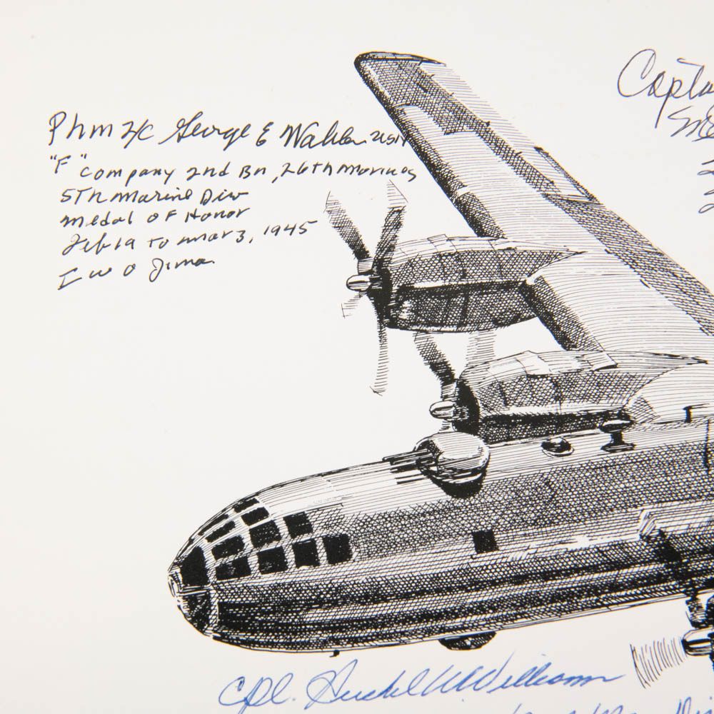 This is an extraordinary archive of WWII memorabilia, specifically focusing on Medal of Honor (MOH) recipients from the brutal Battle of Iwo Jima. The centerpiece is a limited edition, numbered print (107/500) of a Boeing B-29 Superfortress by an artist named Millett (dated 1978, Denver, CO). This print is not signed by B-29 pilots, as one might first assume, but is instead a unique collaborative piece signed by six Iwo Jima Medal of Honor recipients, all of whom are mentioned in the accompanying notes and documents: Capt. Robert H. Dunlap (USMCR), Cpl. Hershel W. Williams (USMCR), Capt. Joseph J. McCarthy (USMCR), Pfc. Douglas T. Jacobson (USMCR), Pfc. Jacklyn Harold Lucas (USMCR, the youngest MOH recipient since the Civil War), and PhM 3/c George E. Wahlen (USNR). Also included is a pivotal black-and-white photograph depicting President Harry S. Truman presenting the Medal of Honor to Capt. Joseph J. McCarthy on October 5, 1945, at the White House, which is signed by Captain McCarthy below the image. A White House document (likely a certificate or letter), bearing what appears to be a printed Harry Truman signature, details the MOH citation for McCarthy. The collection further includes numerous autograph note cards from the veterans (including one from Lucas mentioning his wife, Ruby), and original newspaper clippings detailing their heroic actions. The items are primarily paper and photographic prints, exhibiting light age-related toning and expected creasing on the newspaper clippings, but the signatures are bold and clear on the B-29 print, which itself is in very good condition. This is an unparalleled collection of WWII valor. Part of the John Bannister Collection. H 18″, W 24″, D 0.25″ Please see photos.