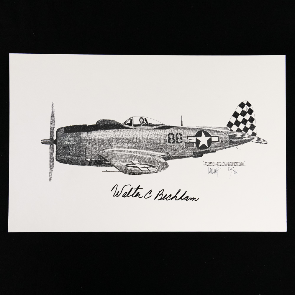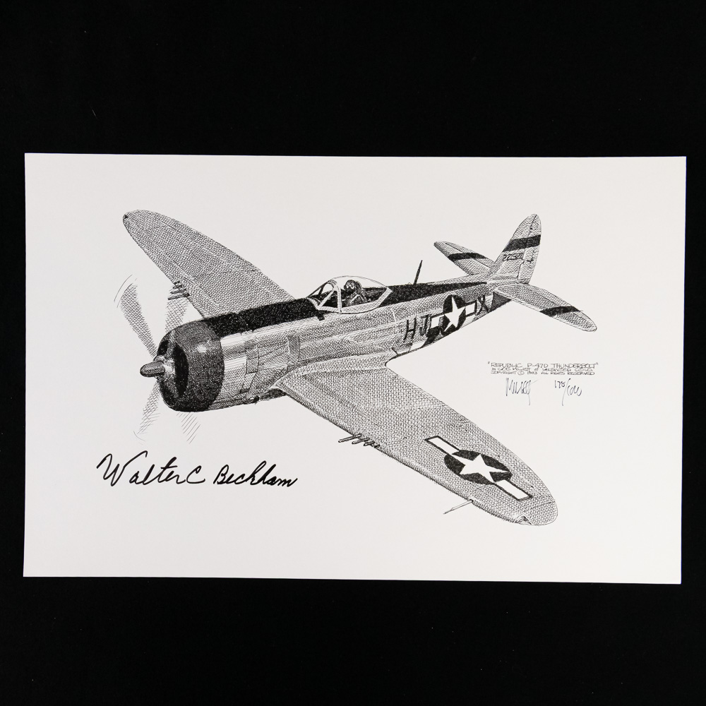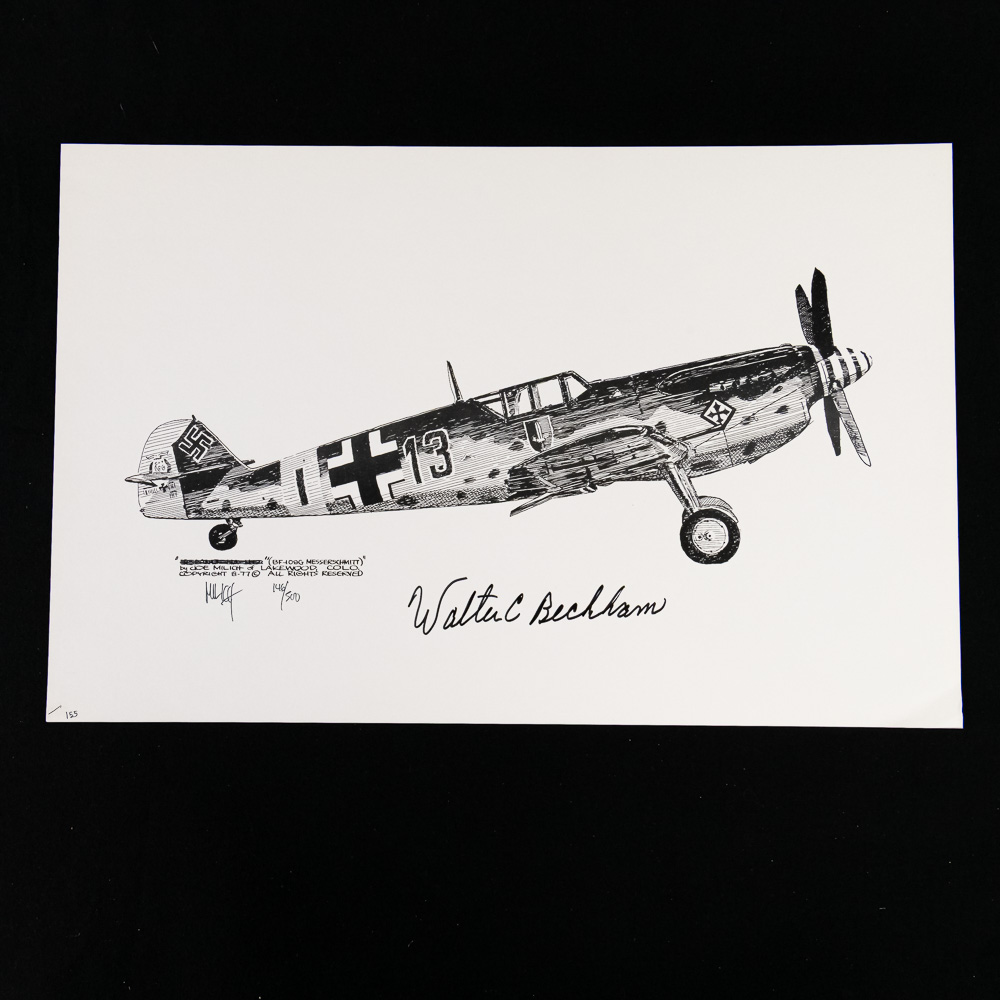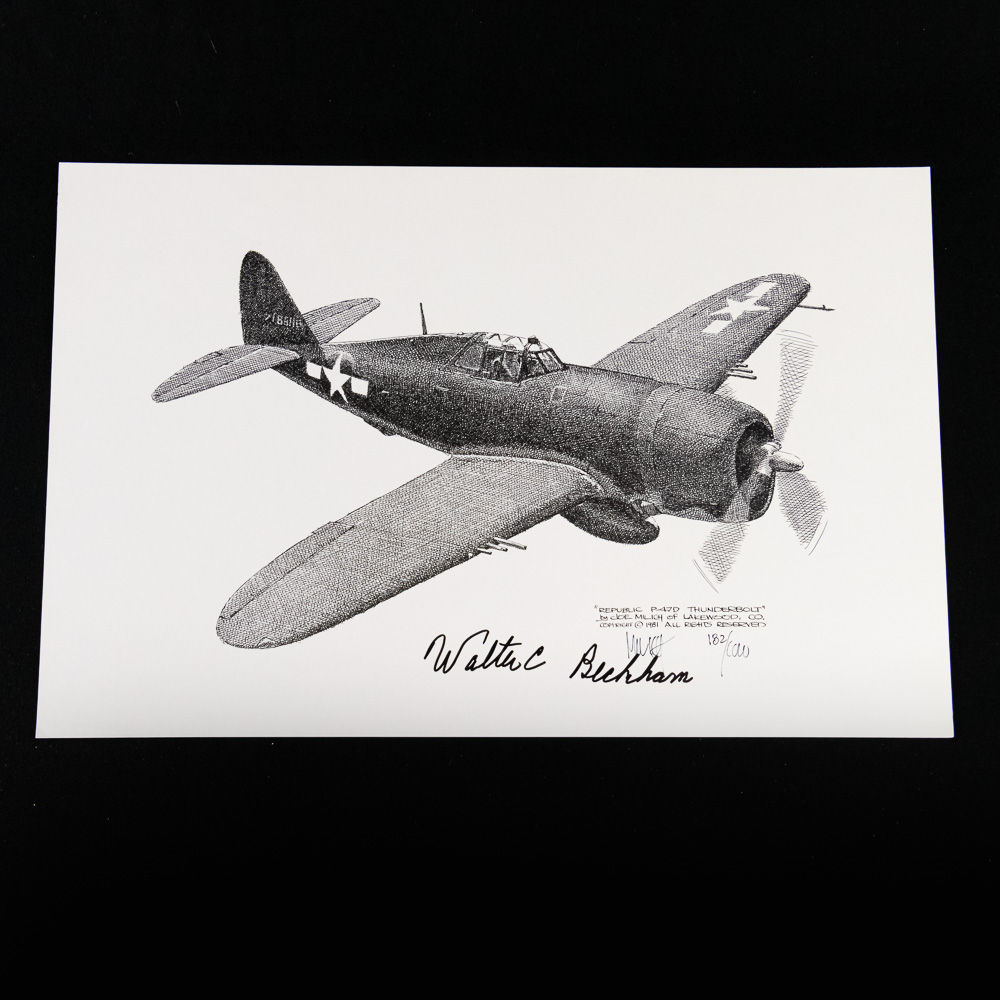 This is a fantastic lot for the aviation historian, featuring four original pen-and-ink-style limited edition prints, all signed by the esteemed Colonel Walter R. Beckham, WWII P-47 Triple Ace (18 confirmed victories). The set includes four iconic WWII fighter planes: a German Messerschmitt Bf 109 , and three variants of the American Republic P-47 Thunderbolt, the very aircraft Beckham flew into combat. Each piece is personally signed by Beckham and marked as a limited edition, indicating they were part of a numbered run. The aesthetic is highly detailed, emphasizing the mechanical complexity of these fighters. The condition is excellent; the prints are crisp, and the paper appears clean with sharp edges, showing no visible rips, creases, or fading. Part of the John Bannister Collection. H 11″, W 17″. See photos.