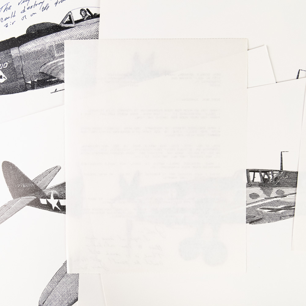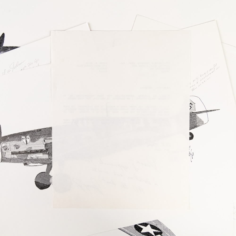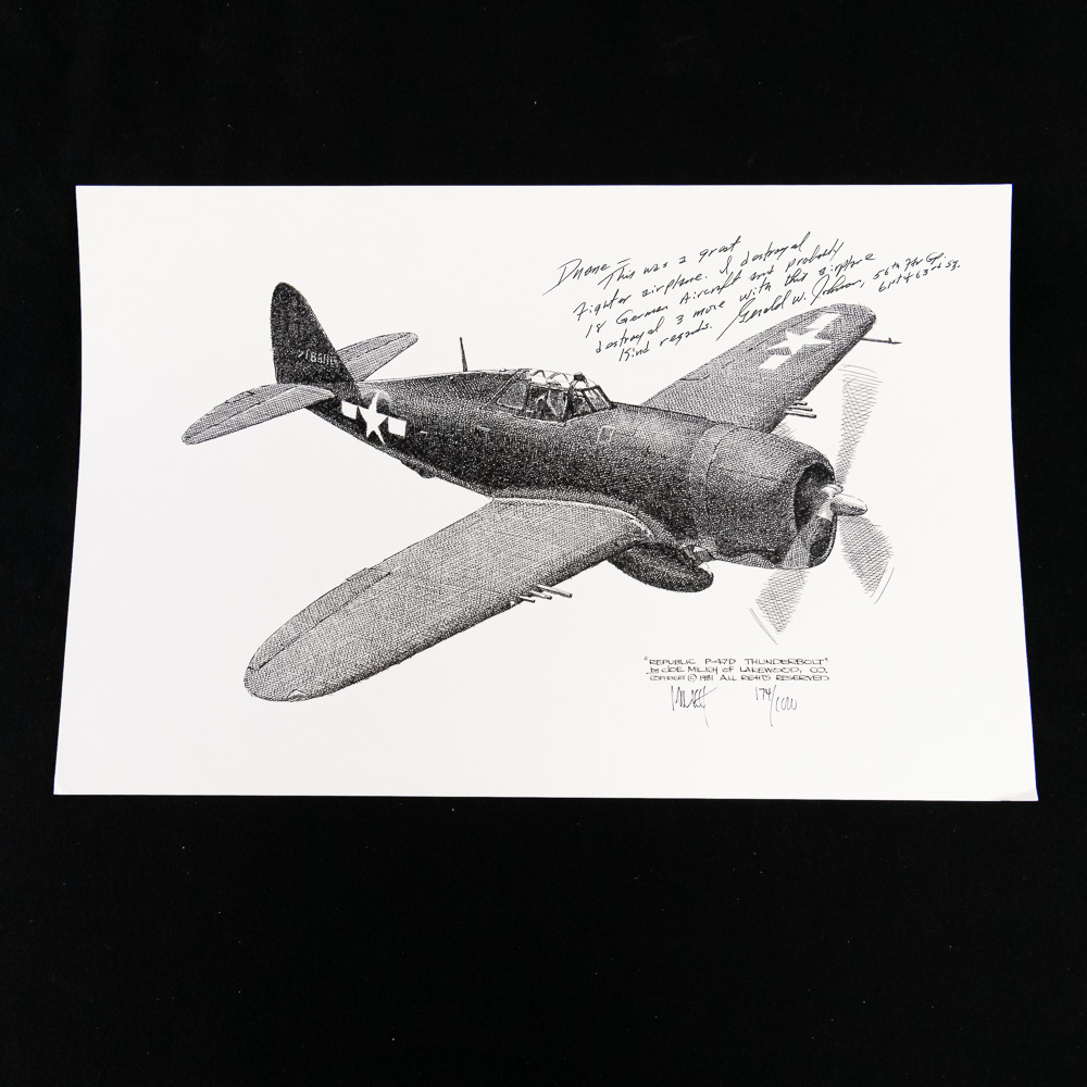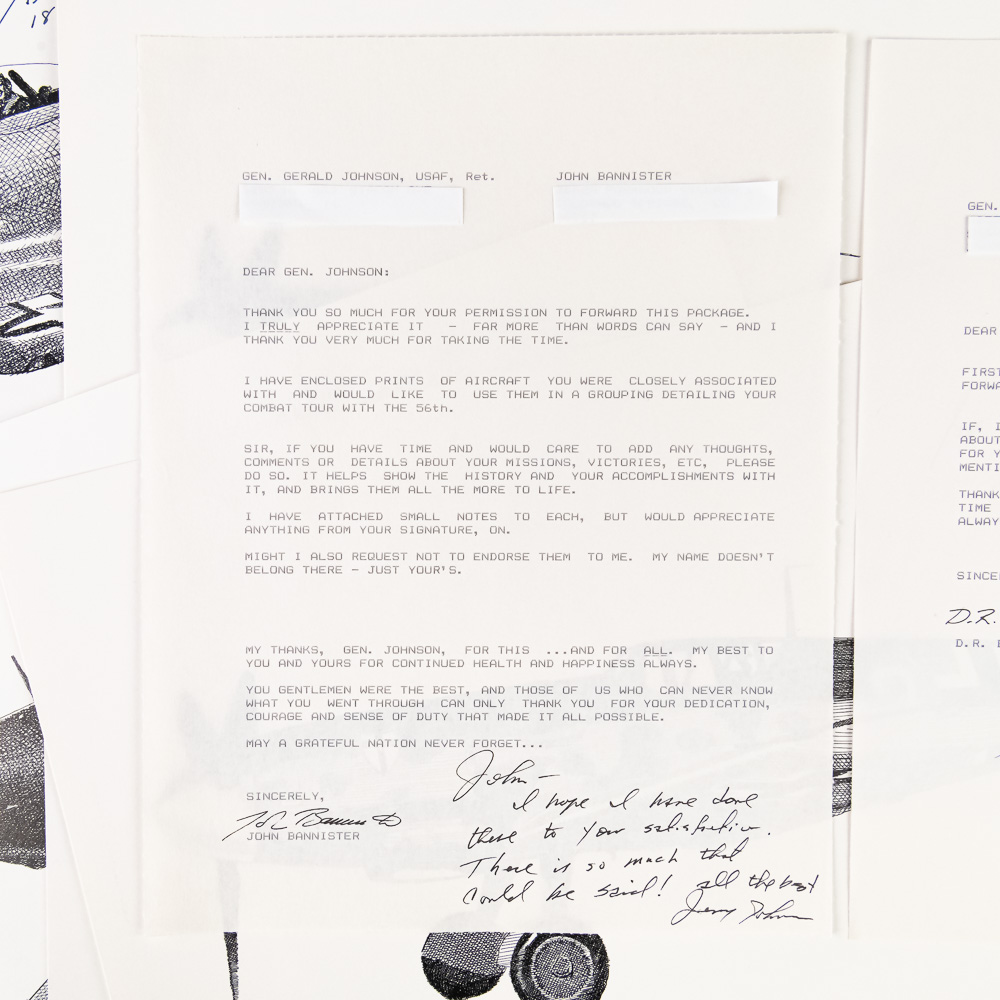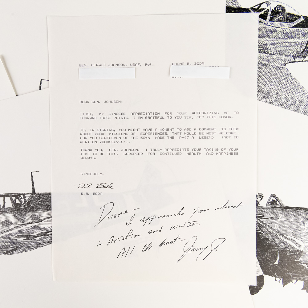 This lot presents a fantastic piece of aviation history, centered around Gen. Gerald Johnson, USAF, Ret., a decorated pilot from the 56th Fighter Group that made the P-47 Thunderbolt a legend during WWII. The collection features several black and white prints of WWII aircraft, specifically the American P-47 Thunderbolt and the German Junkers Ju 87 Stuka, illustrated with beautiful detail. The prints are made on heavier stock paper, and the set is further distinguished by three handwritten notes: one by John Bannister to Gen. Johnson, one on a postcard from Gen. Johnson to a “John,” and one on Duane R. Boda’s letter signed by “Jerry” (presumably Gen. Johnson). The overall composition and content suggest a personal exchange between the artists/distributors and the veteran, adding significant intrinsic value. Visible materials include paper prints, typed letters on stationary, and a small postcard. All prints and documents appear to be in excellent or very good condition, showing minimal to no wear, creasing, or fading, consistent with having been stored flat. Part of the John Bannister Collection. H 11″, W 17″. See photos.