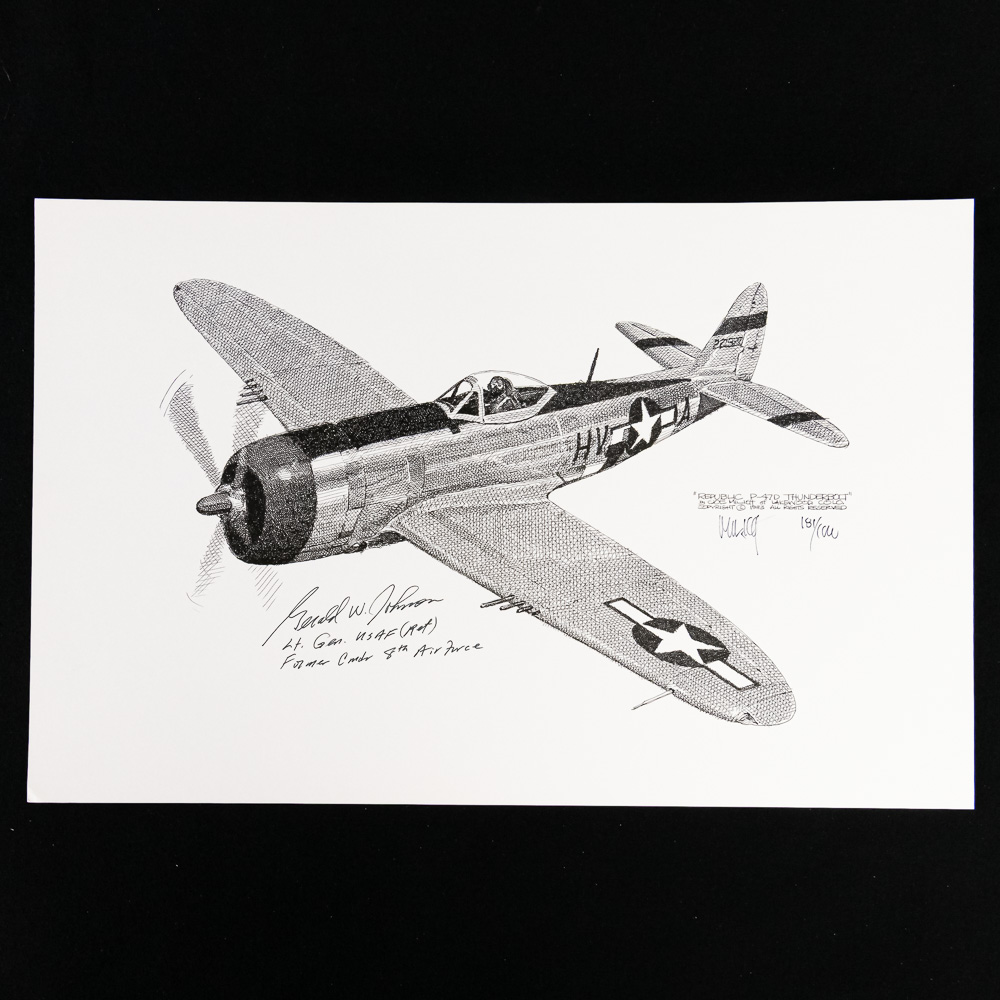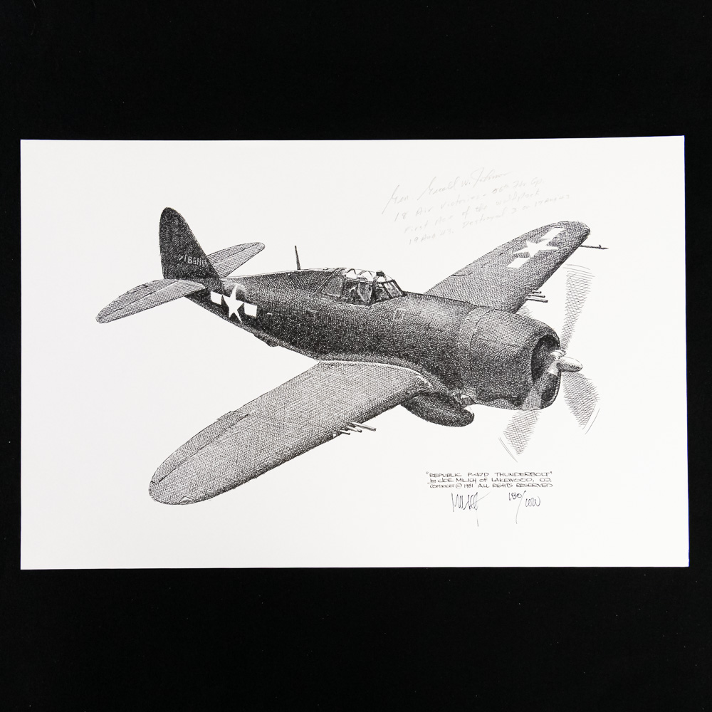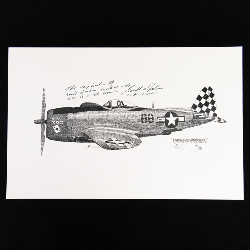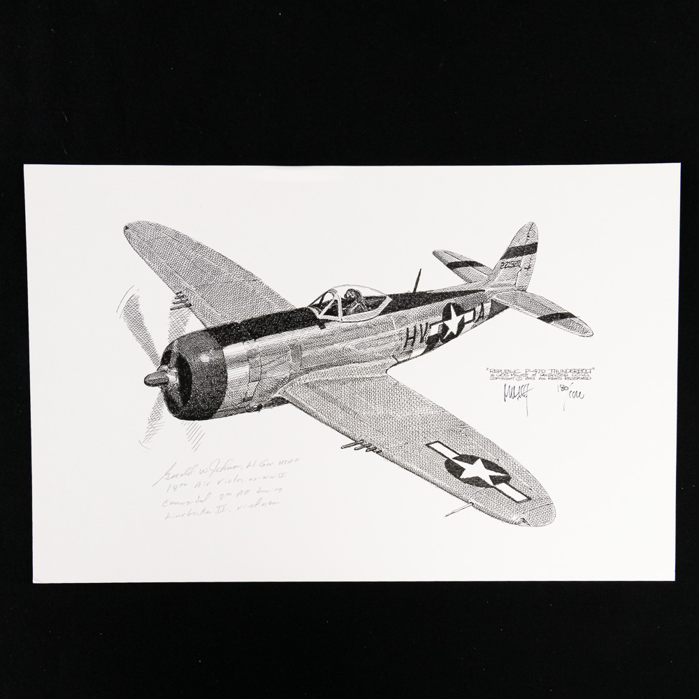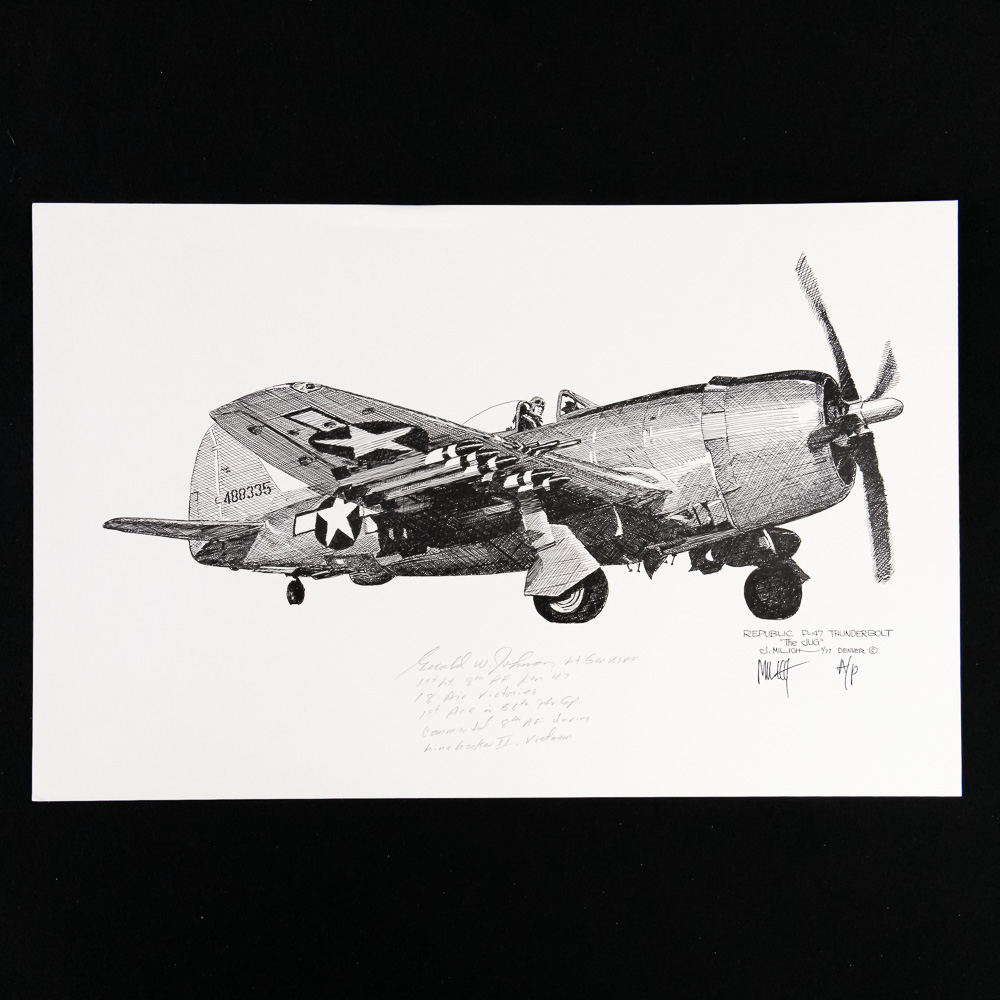 This lot presents a fantastic piece of aviation history, centered around Gen. Gerald Johnson, USAF, Ret., a decorated pilot from the 56th Fighter Group that made the P-47 Thunderbolt a legend during WWII. The collection features several black and white prints of WWII aircraft, specifically the American P-47 Thunderbolt and the German Junkers Ju 87 Stuka, illustrated with beautiful detail. The prints are made on heavier stock paper, and the set is further distinguished by three handwritten notes: one by John Bannister to Gen. Johnson, one on a postcard from Gen. Johnson to a “John,” and one on Duane R. Boda’s letter signed by “Jerry” (presumably Gen. Johnson). The overall composition and content suggest a personal exchange between the artists/distributors and the veteran, adding significant intrinsic value. Visible materials include paper prints, typed letters on stationary, and a small postcard. All prints and documents appear to be in excellent or very good condition, showing minimal to no wear, creasing, or fading, consistent with having been stored flat. Part of the John Bannister Collection. H 11″, W 17″. See photos.