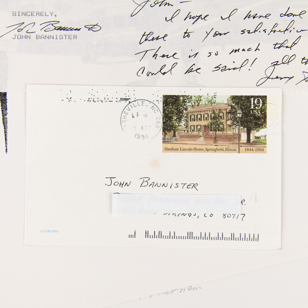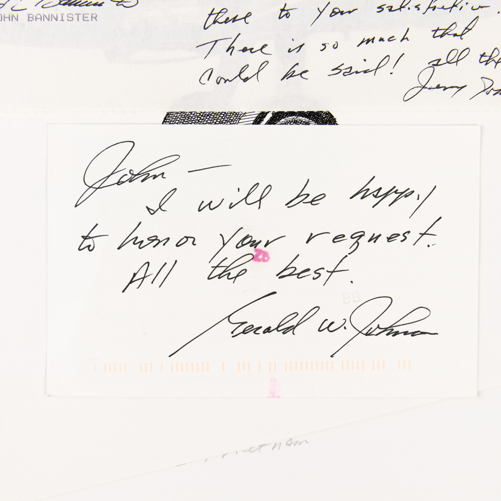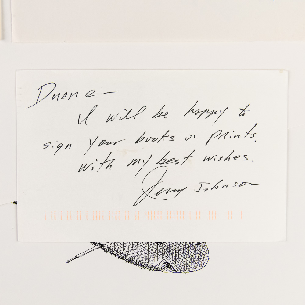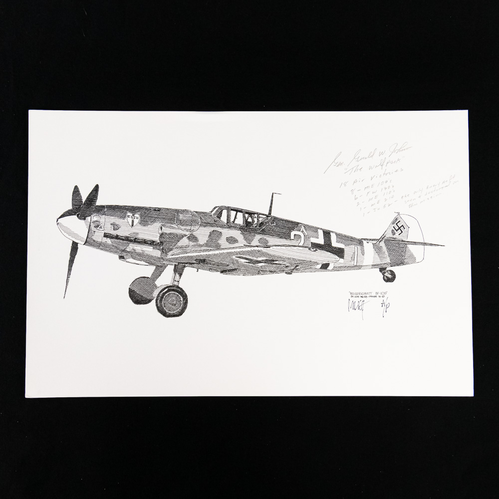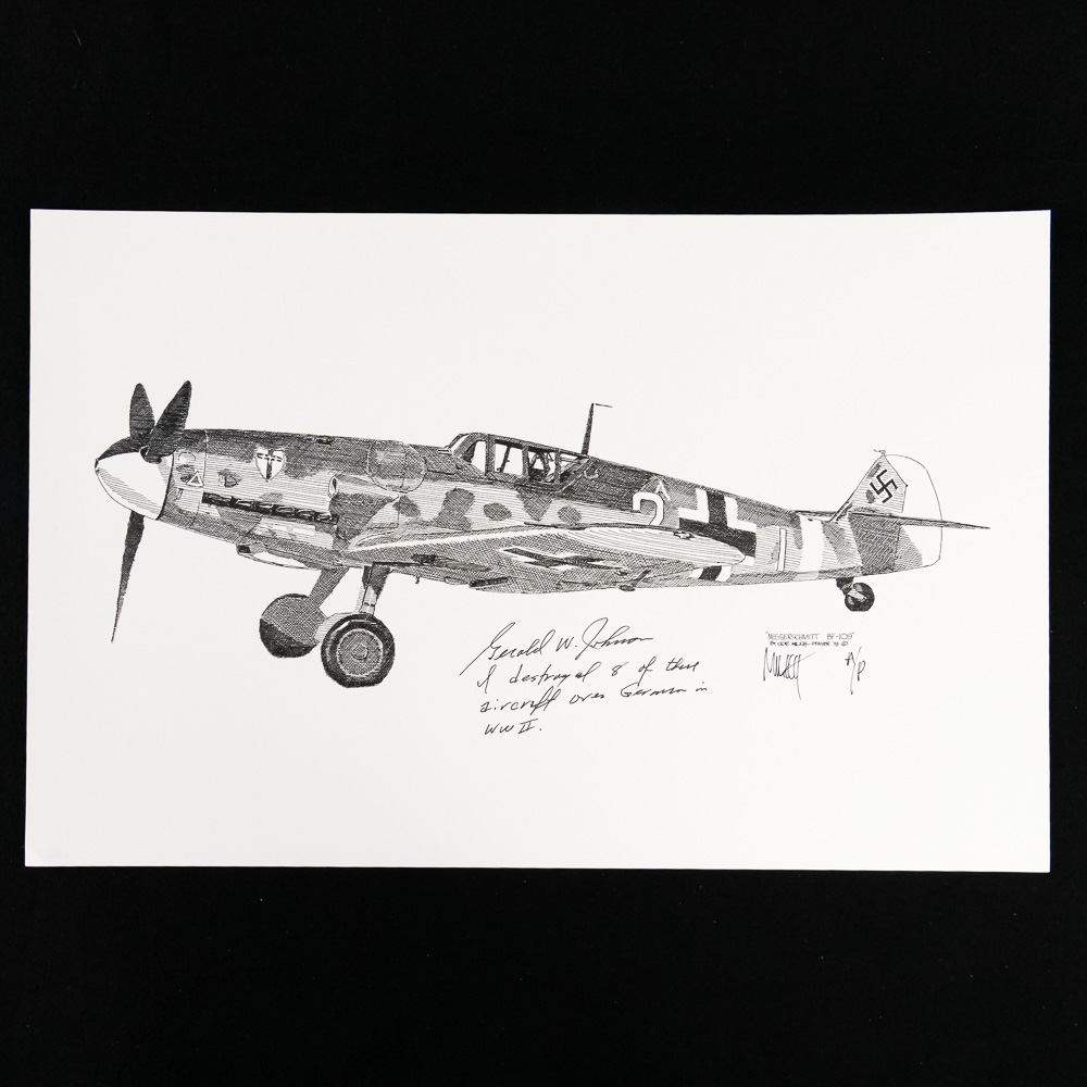 This lot presents a fantastic piece of aviation history, centered around Gen. Gerald Johnson, USAF, Ret., a decorated pilot from the 56th Fighter Group that made the P-47 Thunderbolt a legend during WWII. The collection features several black and white prints of WWII aircraft, specifically the American P-47 Thunderbolt and the German Junkers Ju 87 Stuka, illustrated with beautiful detail. The prints are made on heavier stock paper, and the set is further distinguished by three handwritten notes: one by John Bannister to Gen. Johnson, one on a postcard from Gen. Johnson to a “John,” and one on Duane R. Boda’s letter signed by “Jerry” (presumably Gen. Johnson). The overall composition and content suggest a personal exchange between the artists/distributors and the veteran, adding significant intrinsic value. Visible materials include paper prints, typed letters on stationary, and a small postcard. All prints and documents appear to be in excellent or very good condition, showing minimal to no wear, creasing, or fading, consistent with having been stored flat. Part of the John Bannister Collection. H 11″, W 17″. See photos.
