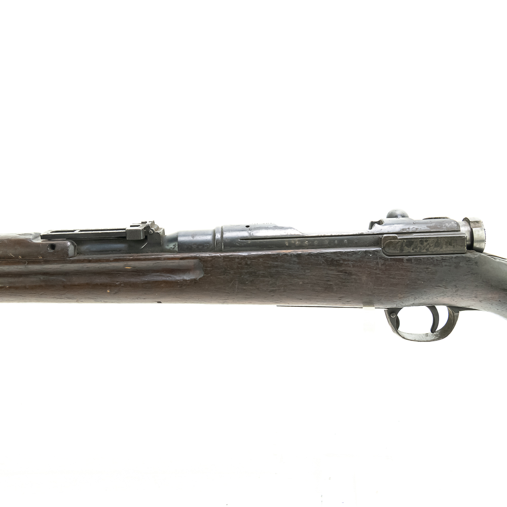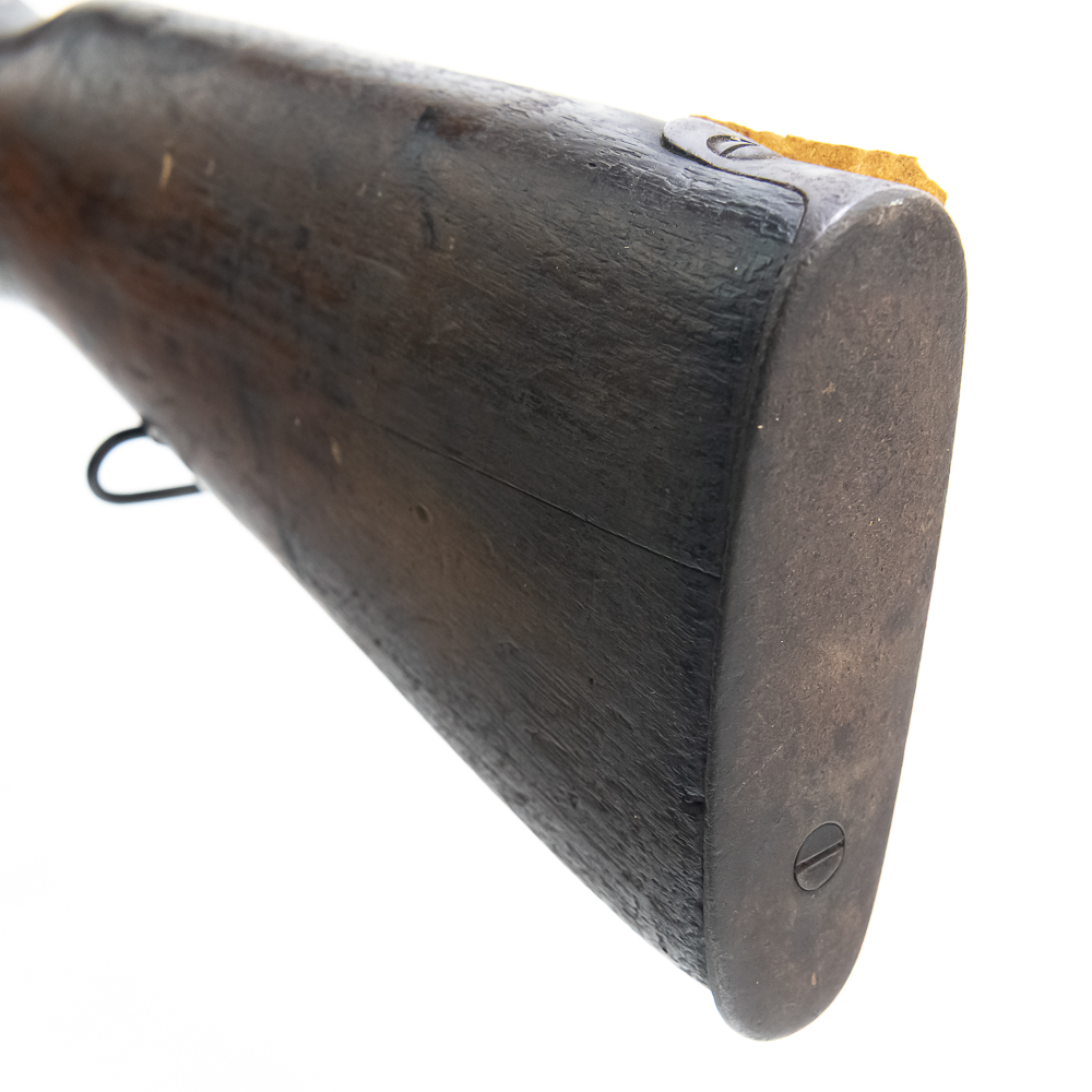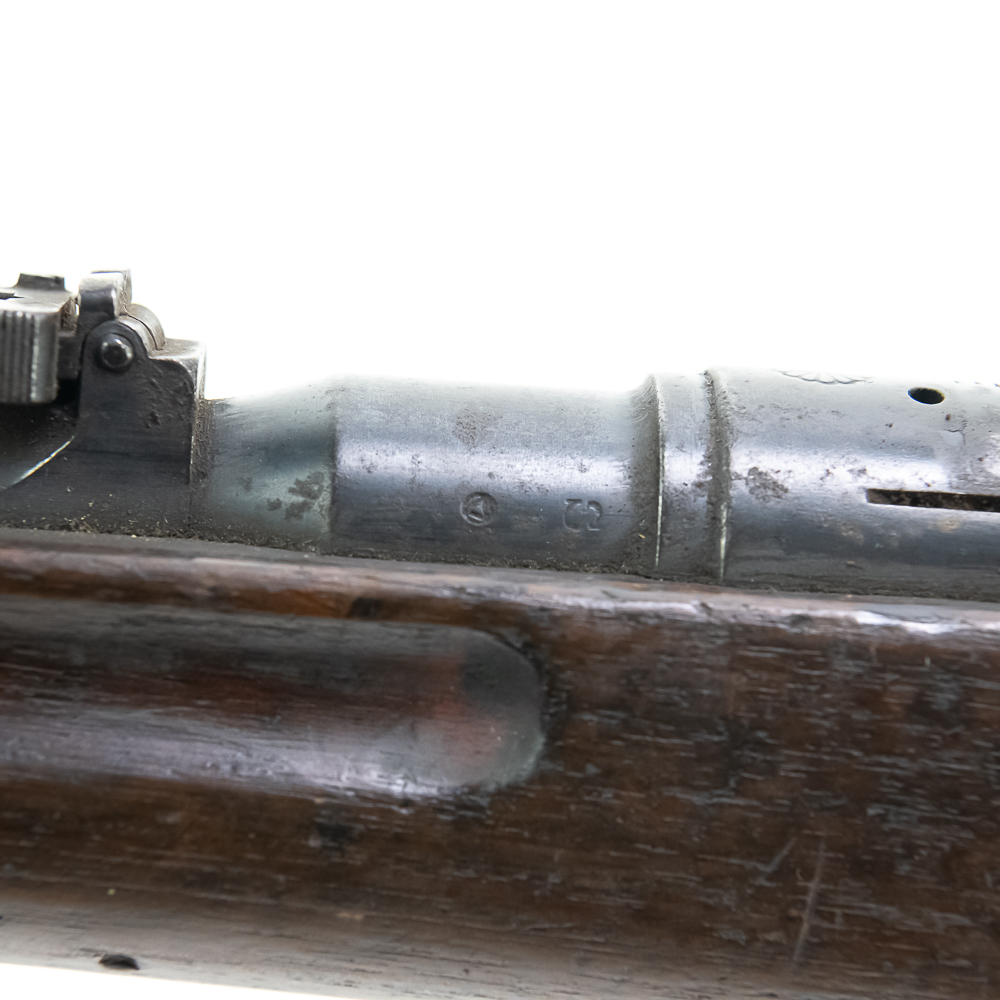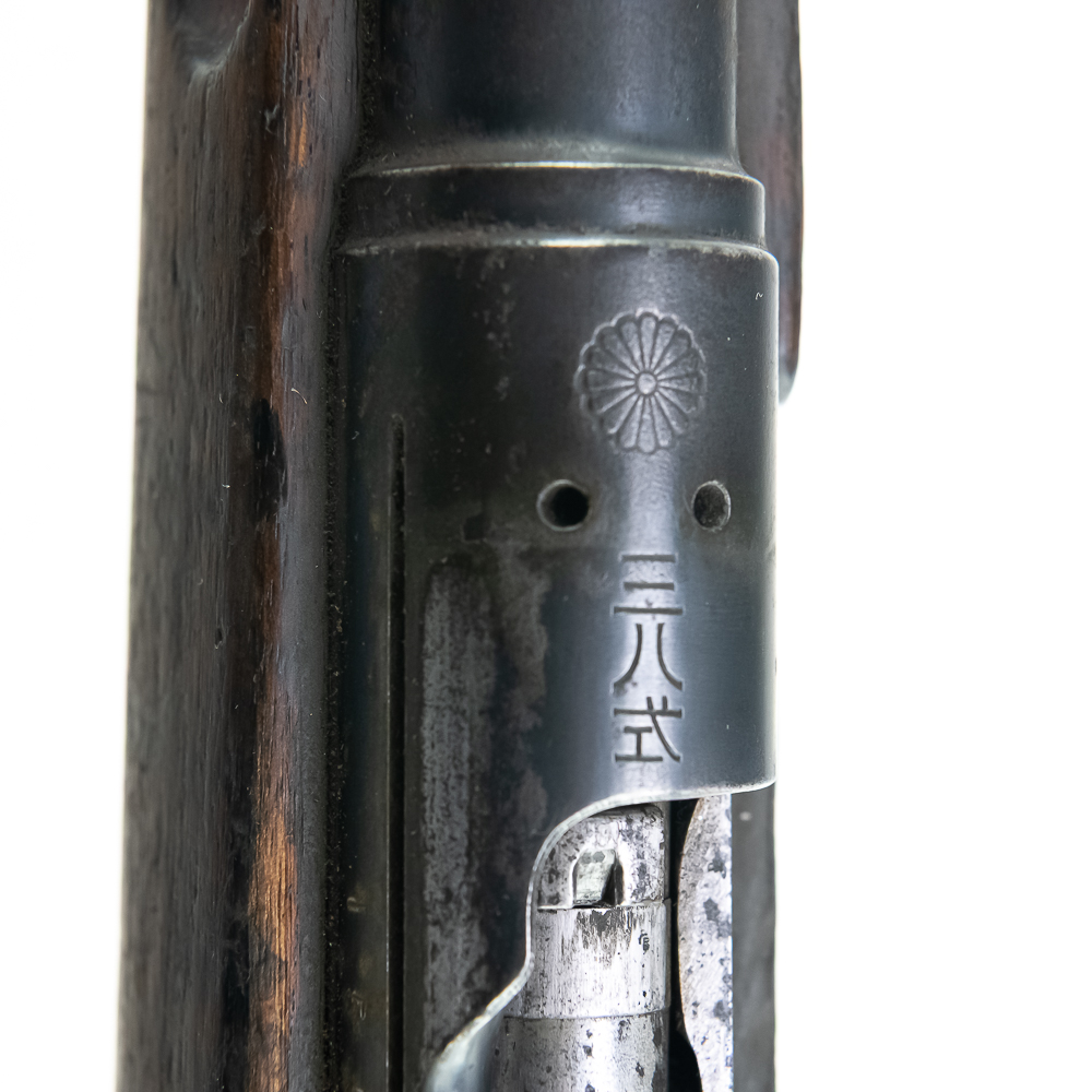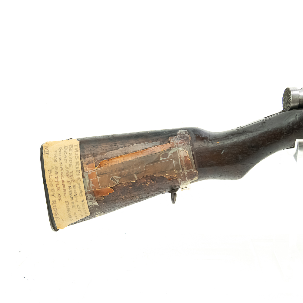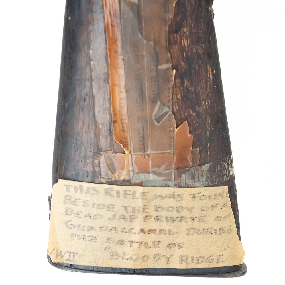 Battlefield Arisaka Type38 6.5 Rifle in good condition with wear, and a dark bore. It has a complete MUM, but non matching numbers. This rifle has a hand-written note attached to the base of the stock saying: “THIS RIFLE FOUND BESIDE THE BODY OF A DEAD JAP BODY PRIVATE OF GUADALCANAL DURING THE BATTLE OF “BLOODY RIDGE”” C&R Eligible S/N:15599118
