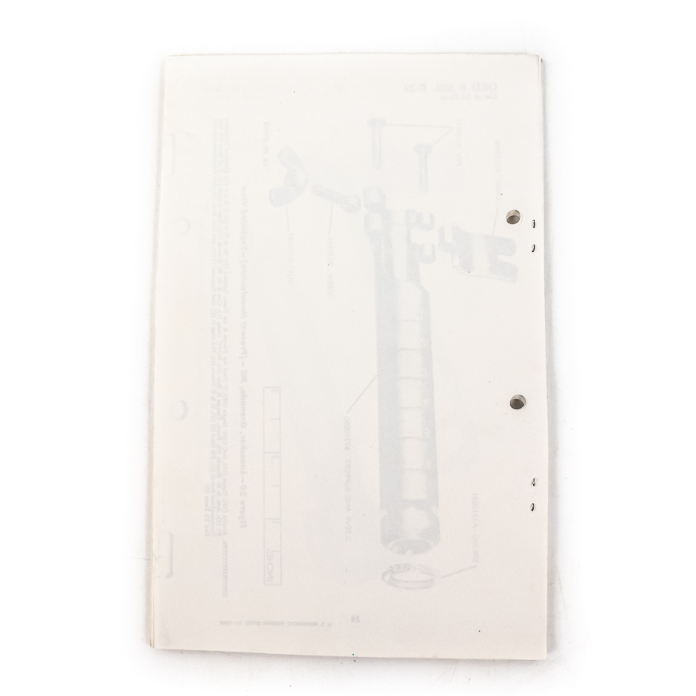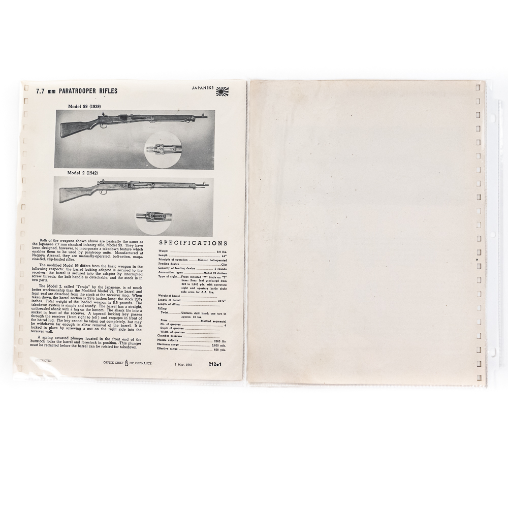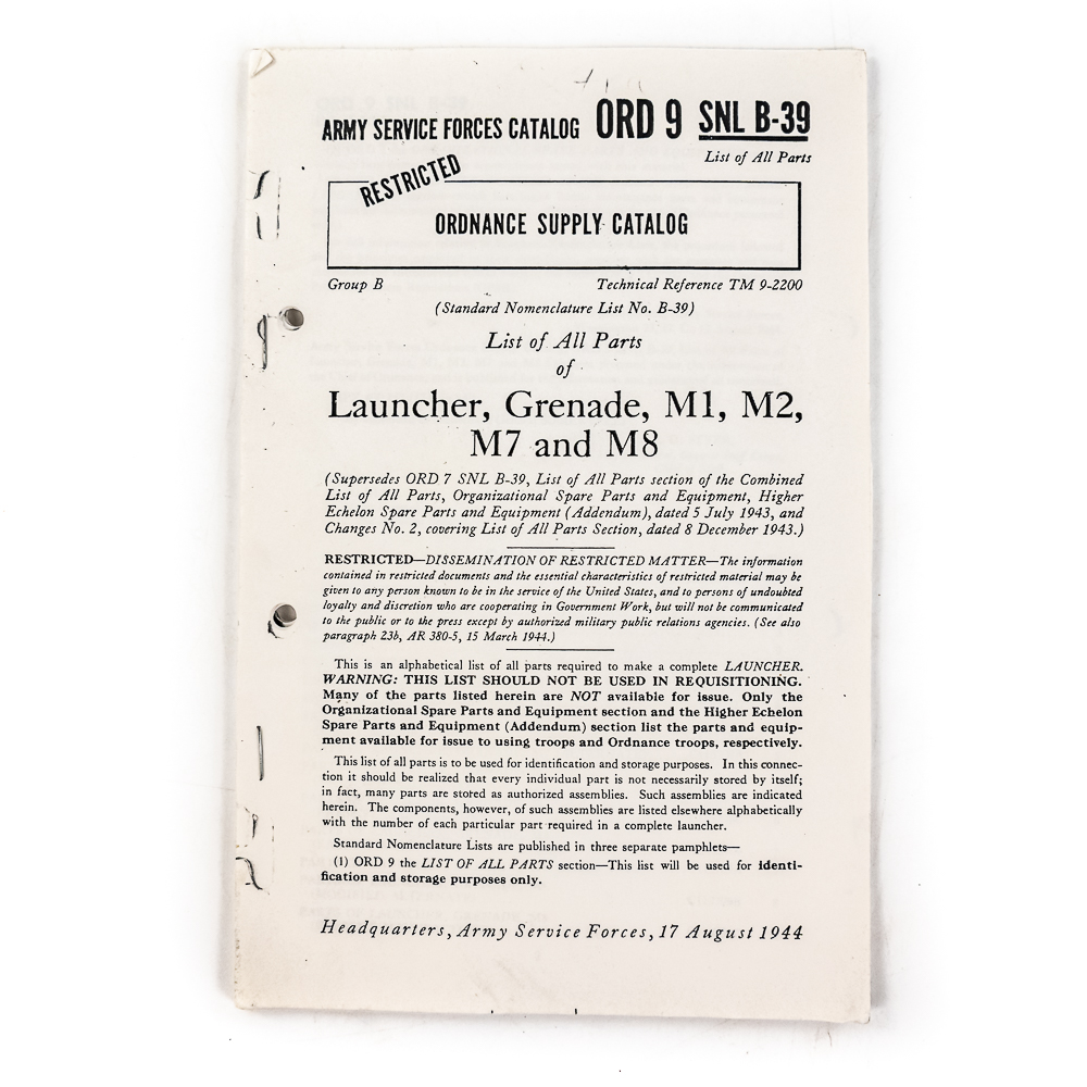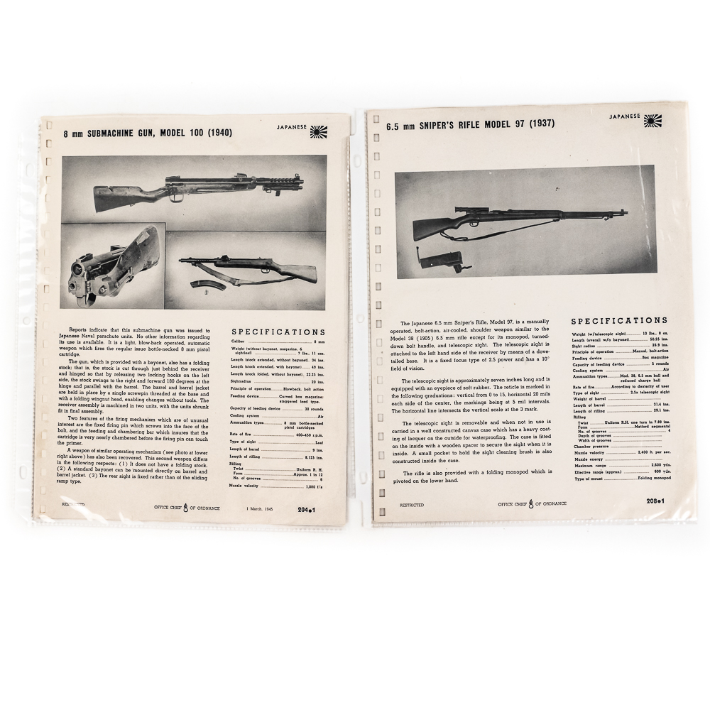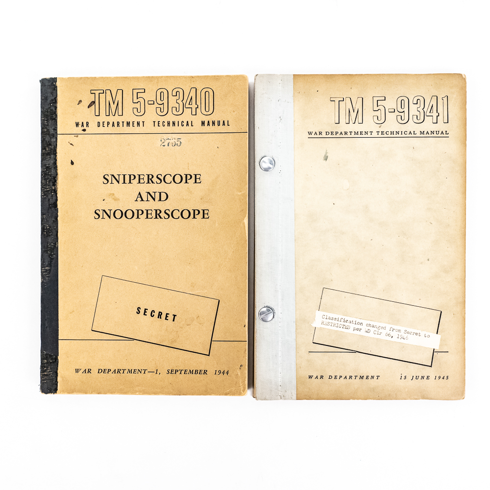 Collection of WWII Secret, restricted and more technical manuals. 1) TM 5-9340 Sniperscope and Snooperscope. Dated 1 September 1944. 172 pages. SECRET. Clean copy, with no tears. Tight binding. Stamped “2765” in blue ink on cover. Dimensions: 6”x9”. 2) TM 5-9341 Sniperscope M2. Dated 15 June 1945. Typed label affixed to front that reads: “Classification changed from Secret to RESTRICTED per WD Cir 66, 1946” Clean copy, with no tears. Tight binding. Dimensions 6”x9.25”. 3) Manual (COPY) ORD 9 SNL B-39 Ordnance Supply Catalog RESTRICTED List of all Parts of Launcher, Grenade, M1, M2, M7 and M8. 17 August 1944. 28 Pages. Stapled. 4) Information sheet: 8mm Submachine Gun Model 100 (1940). RESTRICTED. Office Chief of Ordnance. 1 March 1945. 5) Information sheet: 7.7. mm Paratrooper Rifles. RESTRICTED. Office Chief of Ordnance. 1 May 1945. 6) 6.5 mm Sniper’s Rifle Model 97 (1937) RESTRICTED. Office Chief of Ordnance.
