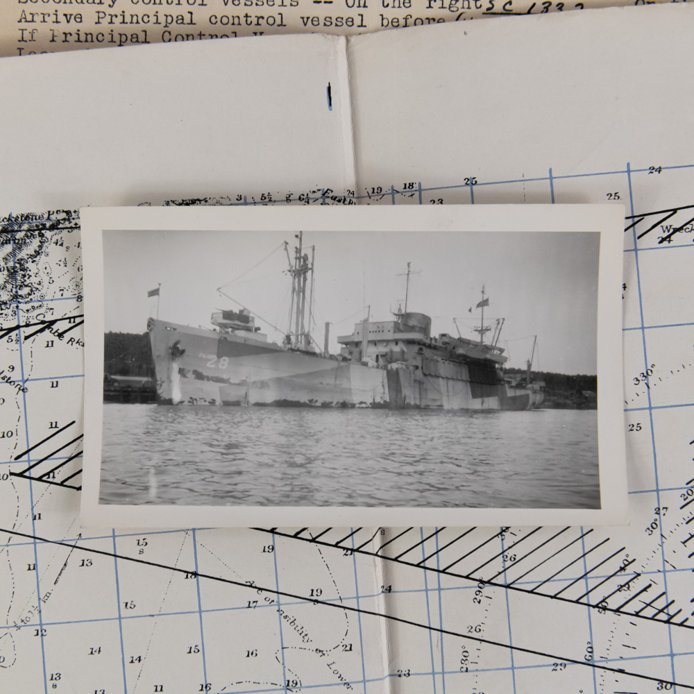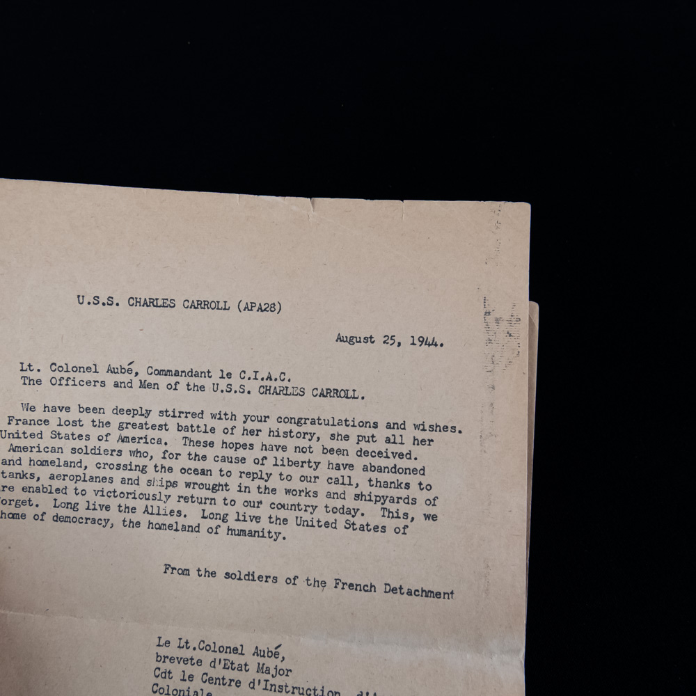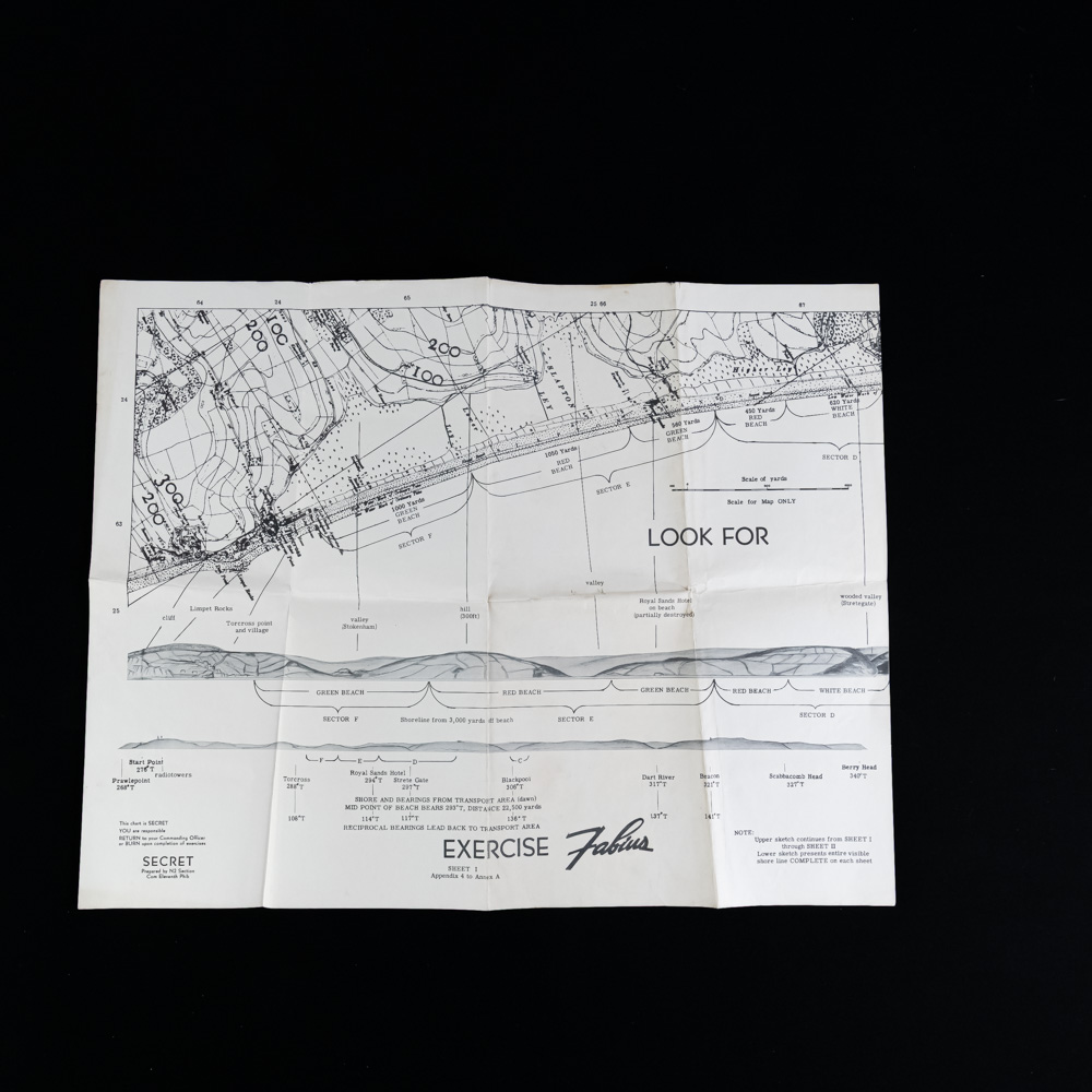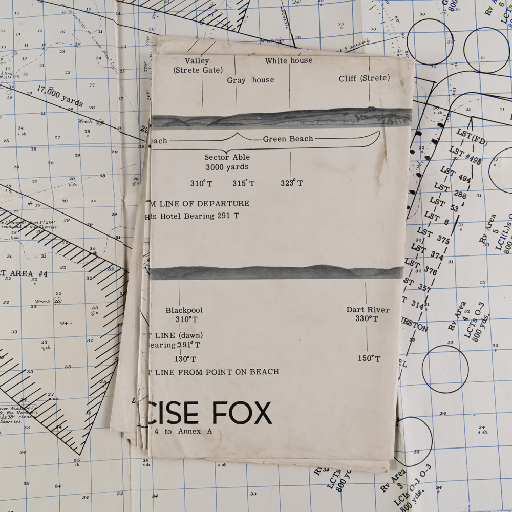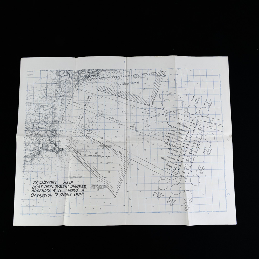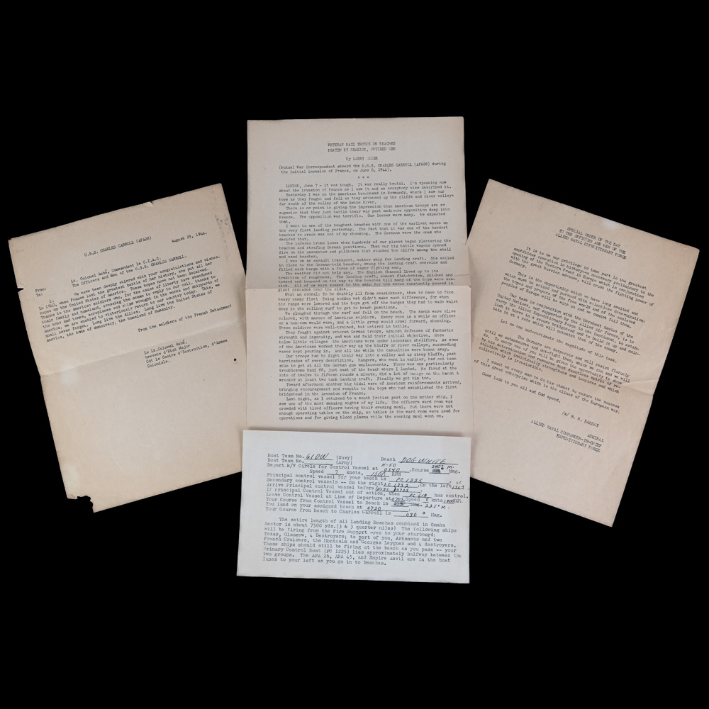 This museum-quality collection centers on the U.S.S. Charles Carroll (APA-28) and the harrowing assault on the Dog White sector of Omaha Beach. The archive’s centerpiece is a rare landing card for Dog White—a central-western stretch of the beach located between the Vierville and St. Laurent draws. On the morning of June 6, 1944, this sector became a pivotal theater of the invasion; while the neighboring Dog Green was famously decimated, Dog White provided a slim opening where Brigadier General Norman Cota and the 5th Ranger Battalion rallied alongside the 116th Infantry Regiment. It was here that Cota famously stood upright under fire, shouting, “Rangers, lead the way!” to motivate the stalled troops to breach the seawall. The archive includes a 1-page report from Mutual War Correspondent Larry Meier, who was aboard the Carroll and documented the “brutal” first waves, alongside Admiral B.H. Ramsay’s “Special Order of the Day” and a 1944 letter from French Lt. Colonel Aubé. These documents, paired with several “Exercise Fabius” and “Exercise Fox” rehearsal maps (all marked SECRET), trace the 3rd Battalion’s journey from their training in England to the chaos of the Normandy bluffs. Exercise FABIUS was the last full dress rehearsal for Operation NEPTUNE and Exercise FOX was a US amphibious exercise in the UK by Major General Leonard T. Gerow’s V Corps of Lieutenant General Omar N. Bradley’s 1 st Army in preparation for ‘Neptune’ (and ‘Overlord’ (9 March 1944). The paper elements exhibit expected age-toning, brittleness, and edge wear, with the landing card showing light handling marks and the larger maps containing typical fold lines and minor separations at the creases. Three maps measure 22”x17”. Two documents are 8”x10”. War correspondent account 13”x8”. Dog White landing card 8”x5”. Photo print 4.5”x2.75”. Part of the John Bannister Collection. John acquired over a lifetime of collecting. Please see photos.