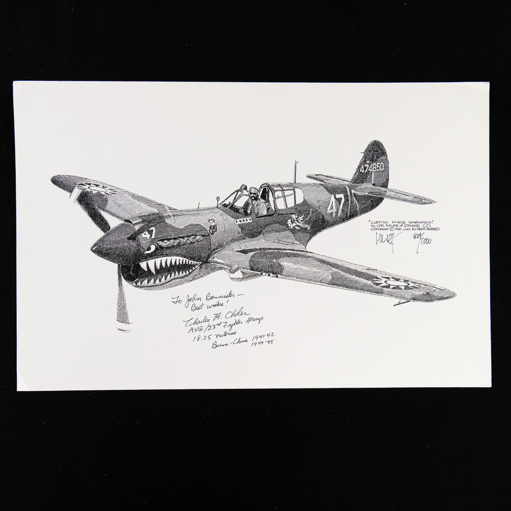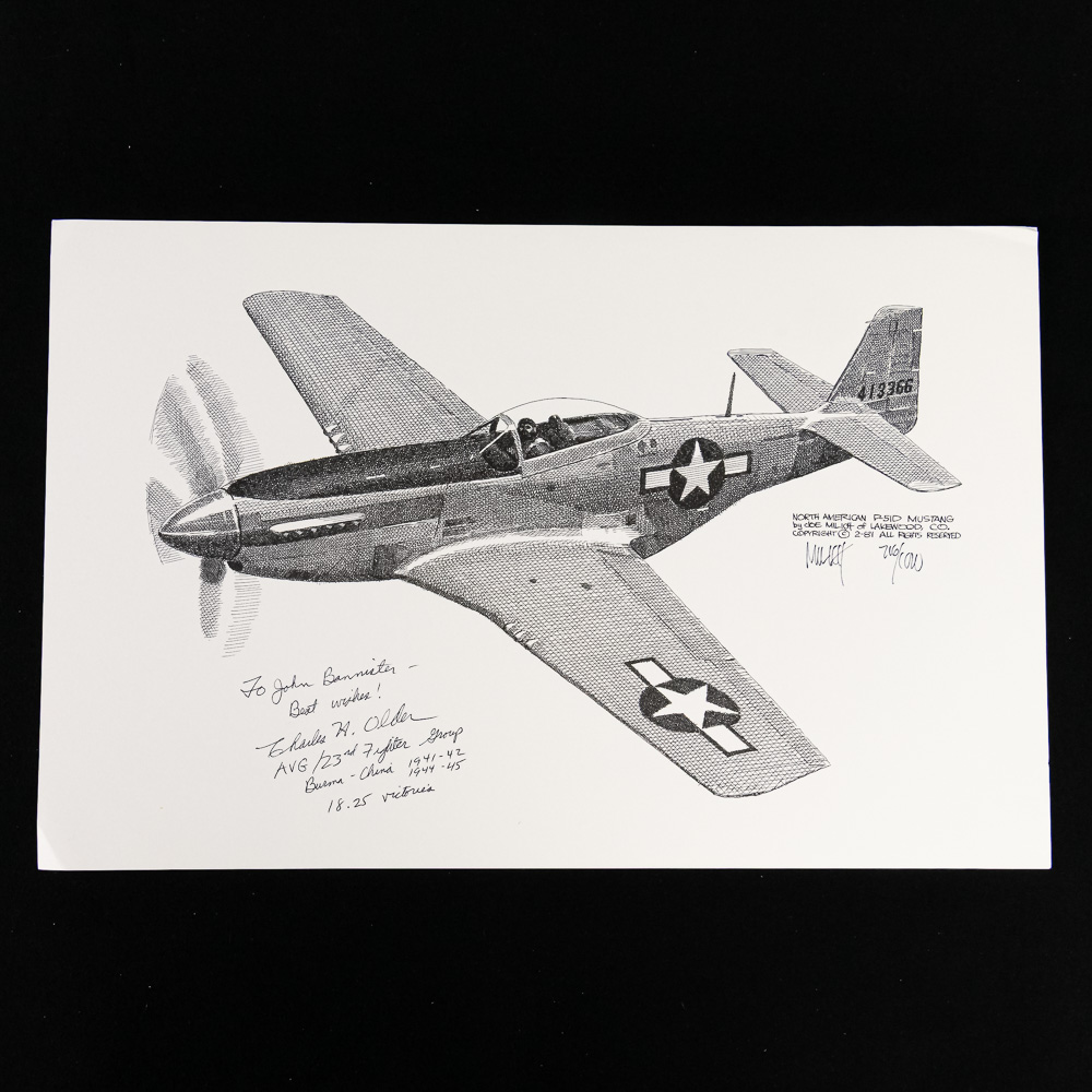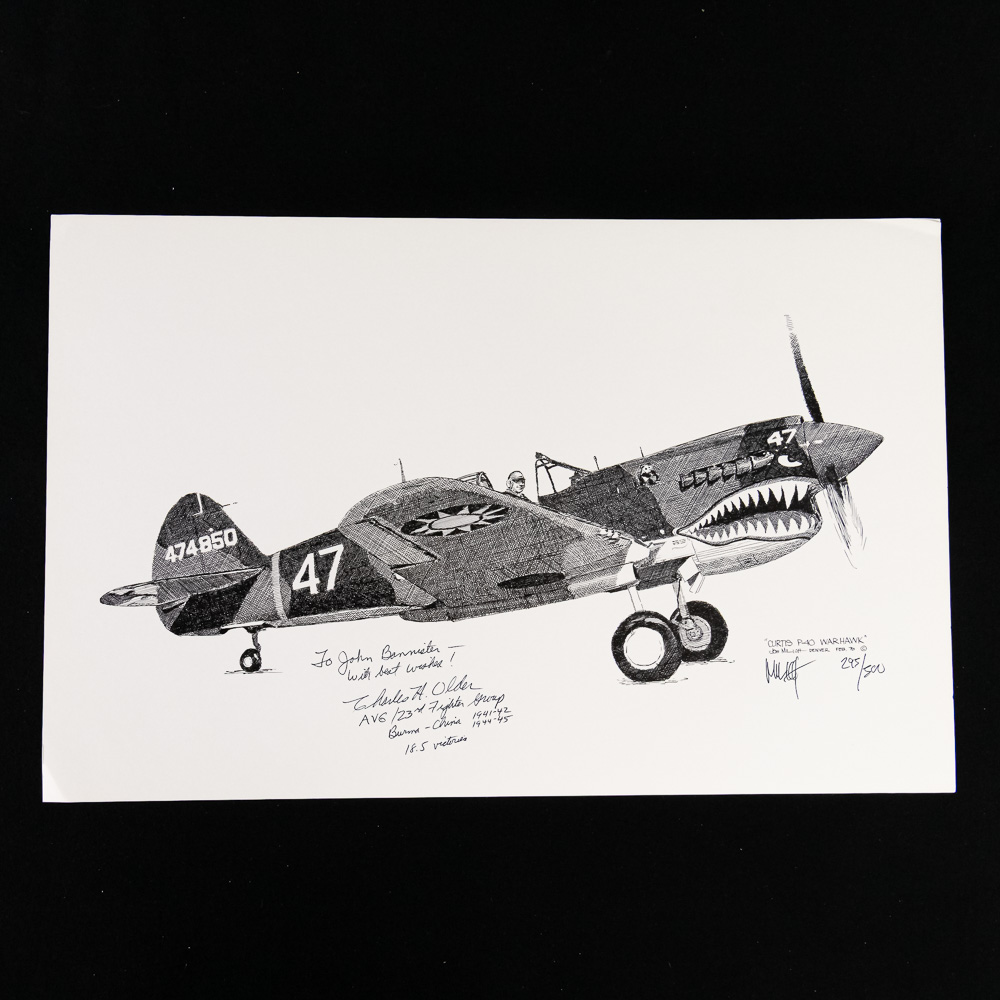 A fantastic grouping for the WWII aviation enthusiast, comprising four high-quality, limited edition pen-and-ink style art prints of iconic WWII fighter aircraft, along with a signed photo of a notable ace pilot Charles H. Older. The set includes detailed profiles of the formidable P-51 Mustang, the shark-mouthed P-40 Warhawk (likely depicting a Flying Tigers aircraft), and two other single-engine fighters, one a Japanese Zero (A6M). Each print is meticulously annotated with details like the type of aircraft, dates, and what appear to be edition numbers (e.g., 14/150, 13/150), and they are all signed by the artist, M. H. F. The central piece is a black-and-white photo of an aviator, Pilot Charles H. Older, who was a member of the legendary Flying Tigers (AVG). The photo is hand-signed by Older, adding significant historical provenance. The collection is in excellent overall condition; the prints appear clean and flat with crisp detail, and the signature on the photo is bold and clear. There is a small postcard also signed by Older. Interesting side note, later in his civilian career, Older was the presiding judge in the notorious Charles Manson trial. Part of the John Bannister Collection. H 11″, W 17″. See photos.