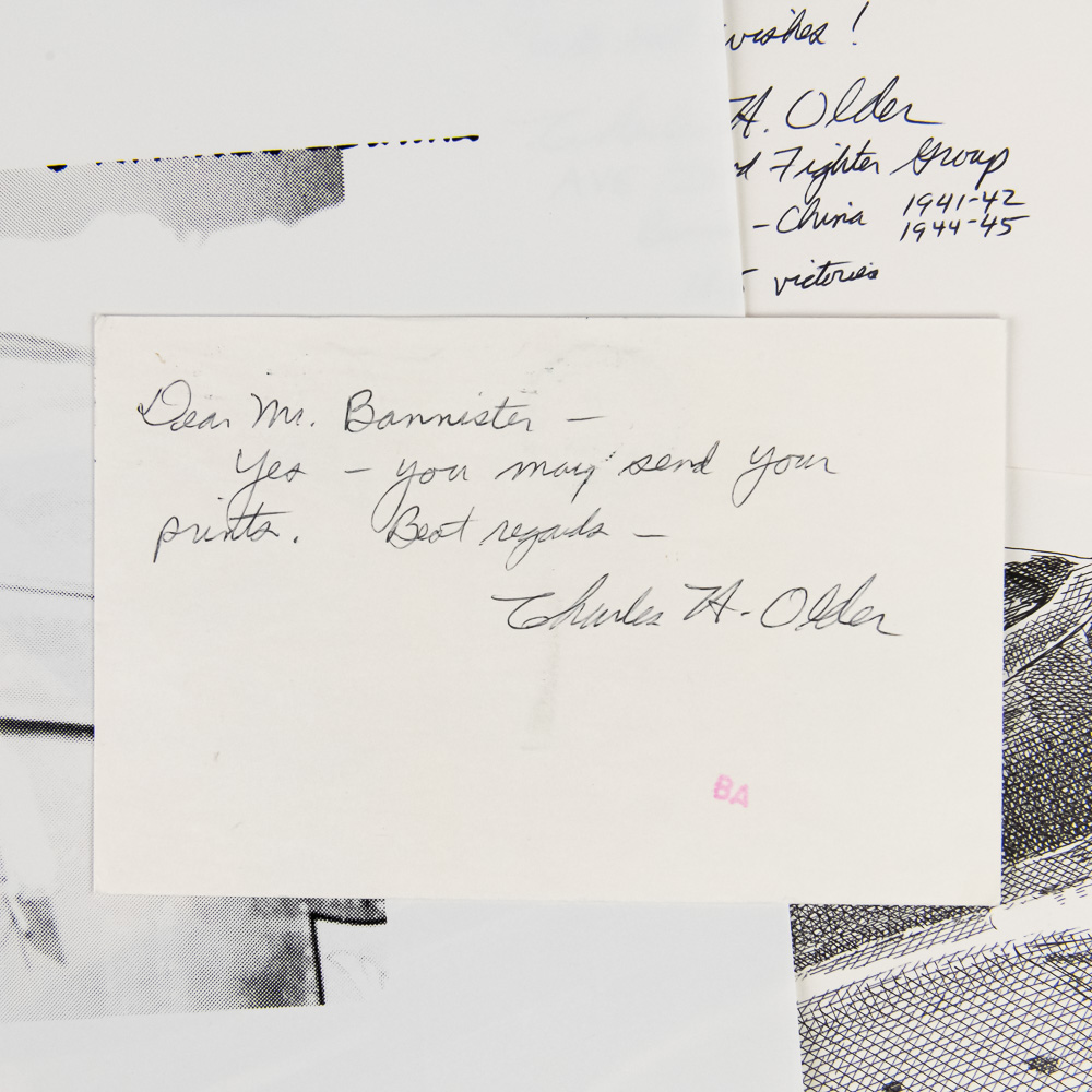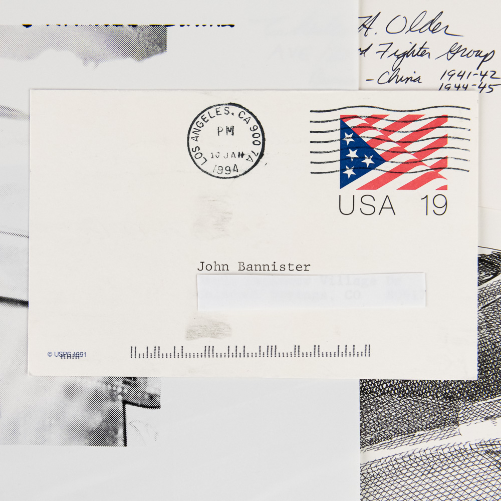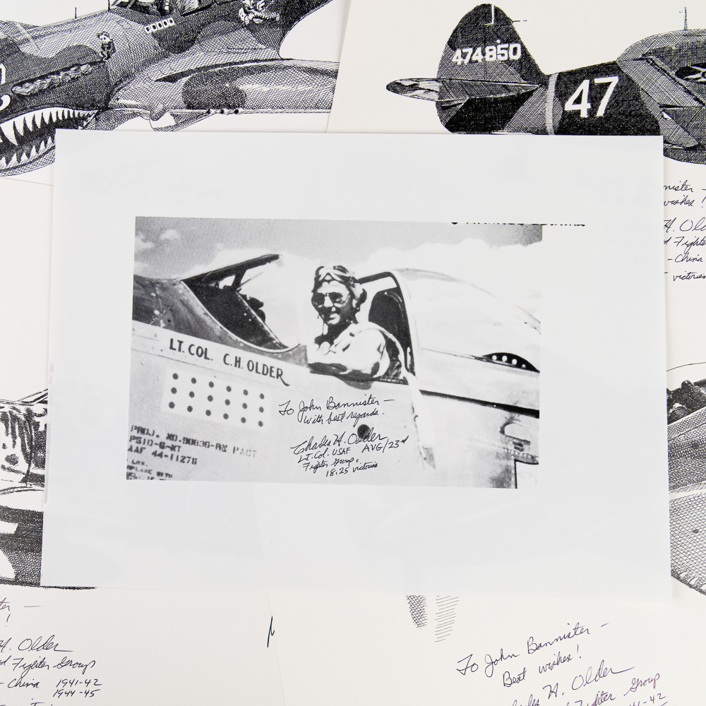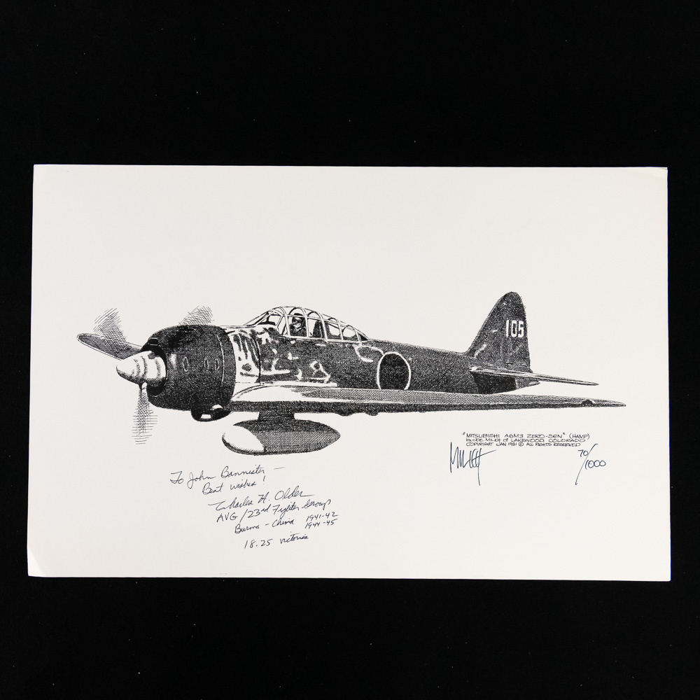 A fantastic grouping for the WWII aviation enthusiast, comprising four high-quality, limited edition pen-and-ink style art prints of iconic WWII fighter aircraft, along with a signed photo of a notable ace pilot Charles H. Older. The set includes detailed profiles of the formidable P-51 Mustang, the shark-mouthed P-40 Warhawk (likely depicting a Flying Tigers aircraft), and two other single-engine fighters, one a Japanese Zero (A6M). Each print is meticulously annotated with details like the type of aircraft, dates, and what appear to be edition numbers (e.g., 14/150, 13/150), and they are all signed by the artist, M. H. F. The central piece is a black-and-white photo of an aviator, Pilot Charles H. Older, who was a member of the legendary Flying Tigers (AVG). The photo is hand-signed by Older, adding significant historical provenance. The collection is in excellent overall condition; the prints appear clean and flat with crisp detail, and the signature on the photo is bold and clear. There is a small postcard also signed by Older. Interesting side note, later in his civilian career, Older was the presiding judge in the notorious Charles Manson trial. Part of the John Bannister Collection. H 11″, W 17″. See photos.