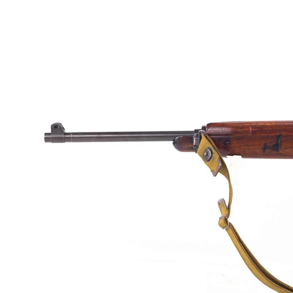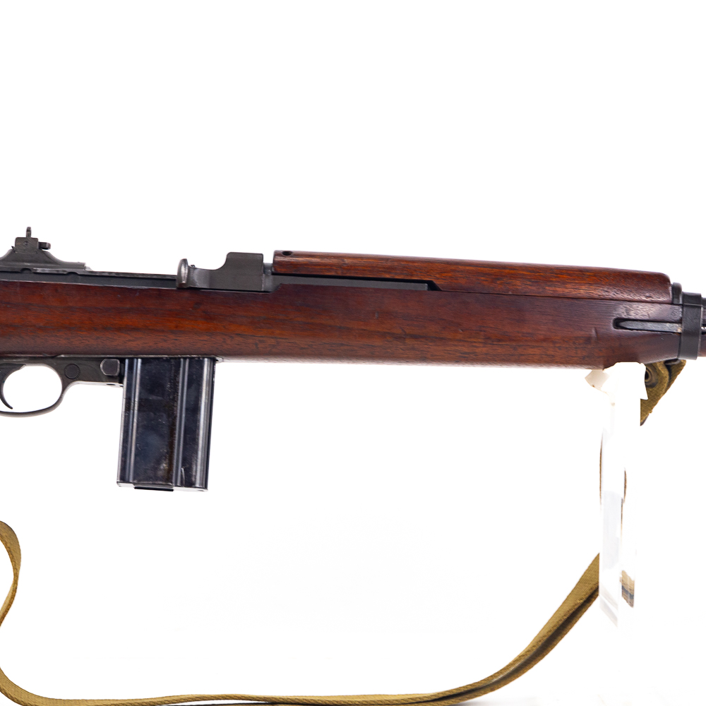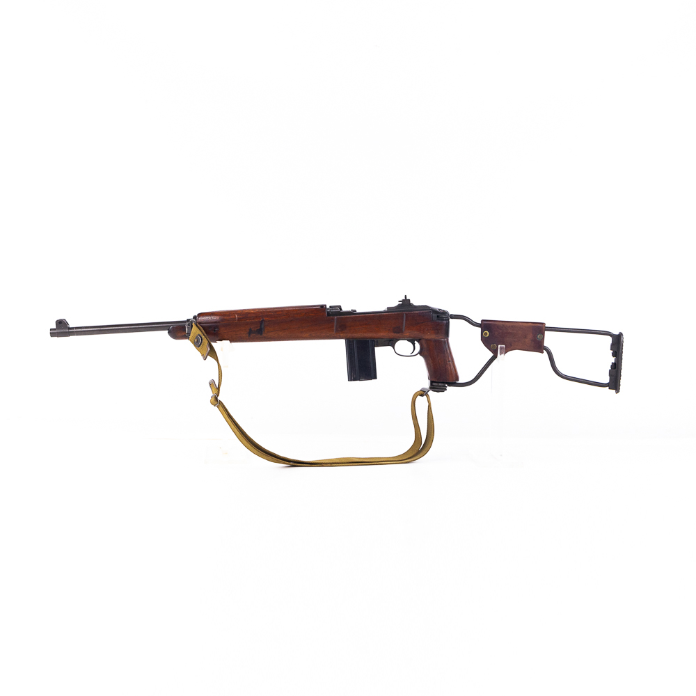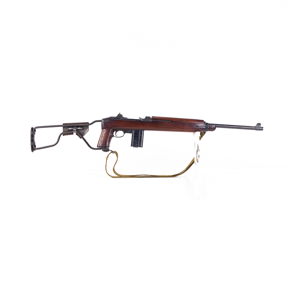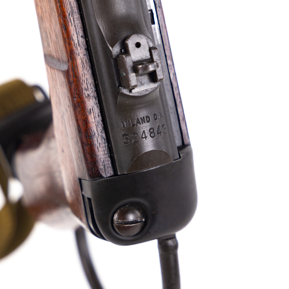 Inland M1A1 Paratrooper 30 Carbine Rifle in very good vintage condition with light wear. The bore is sharp and bright! It has a type 1 stock, flip rear sight, push button safety and one mag and canvas sling. Includes correct wire and leather paratrooper stock with oiler tube. Barrel stamped “Inland 3-43” MFG 05/42-09/43