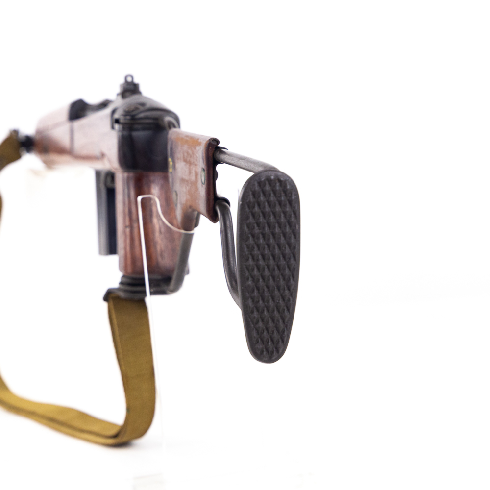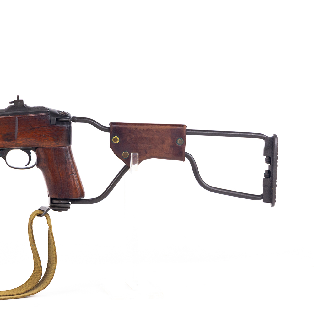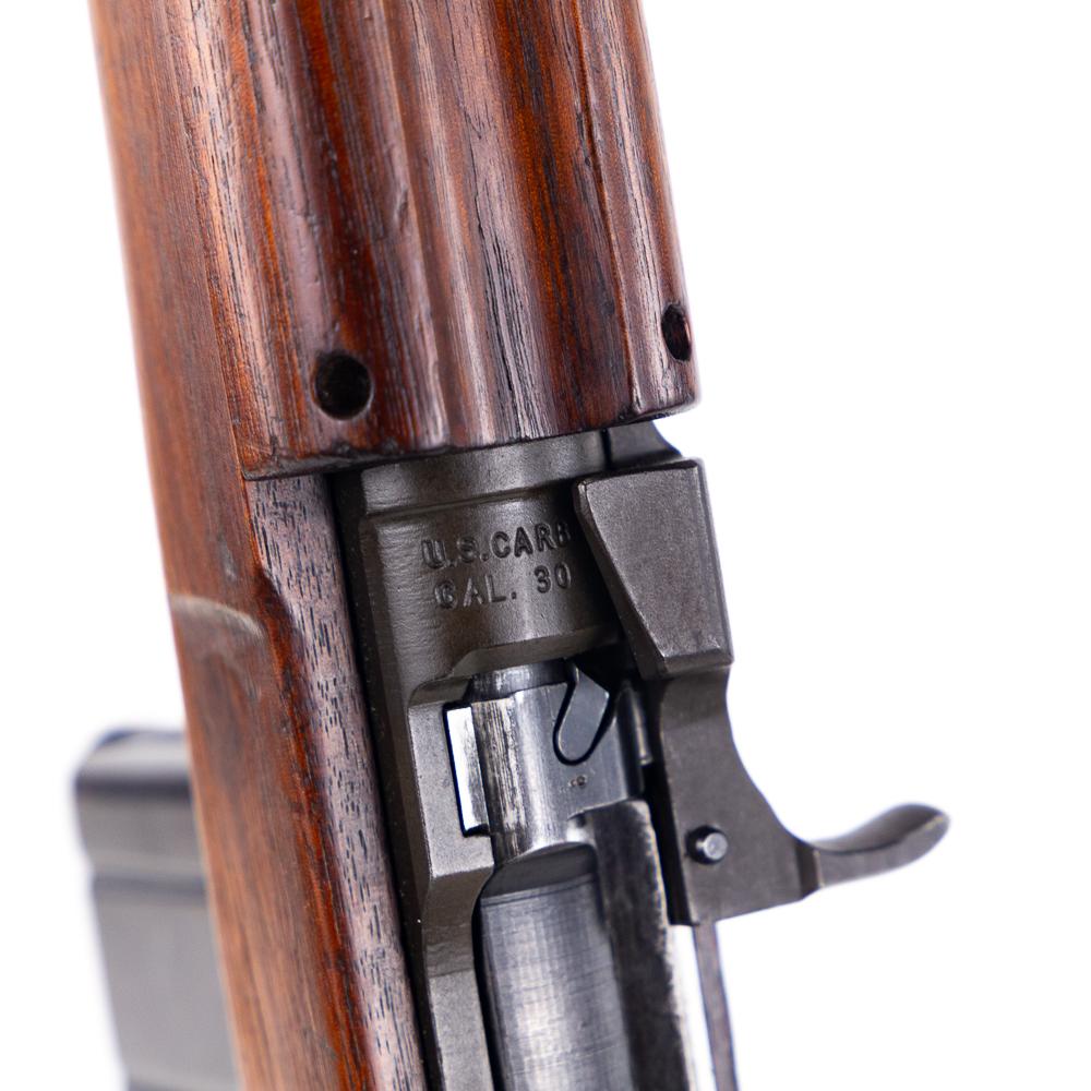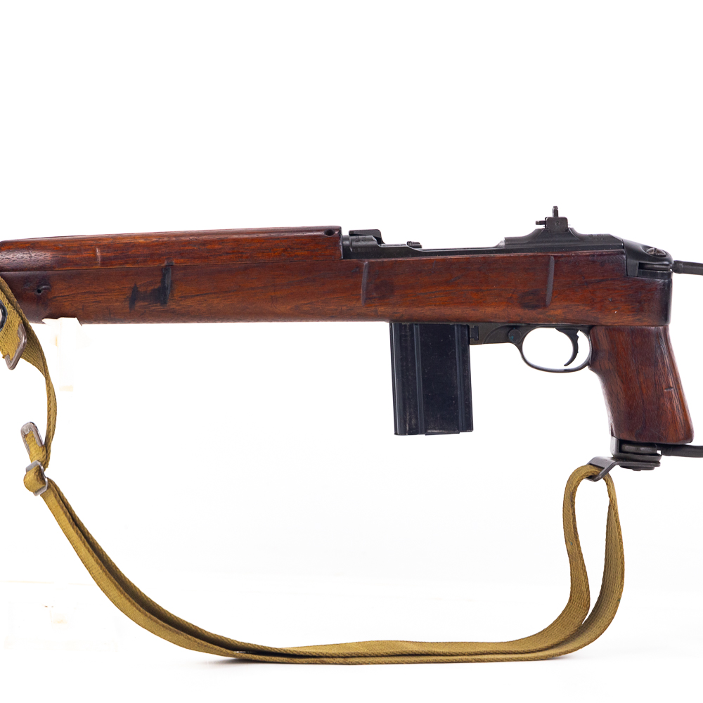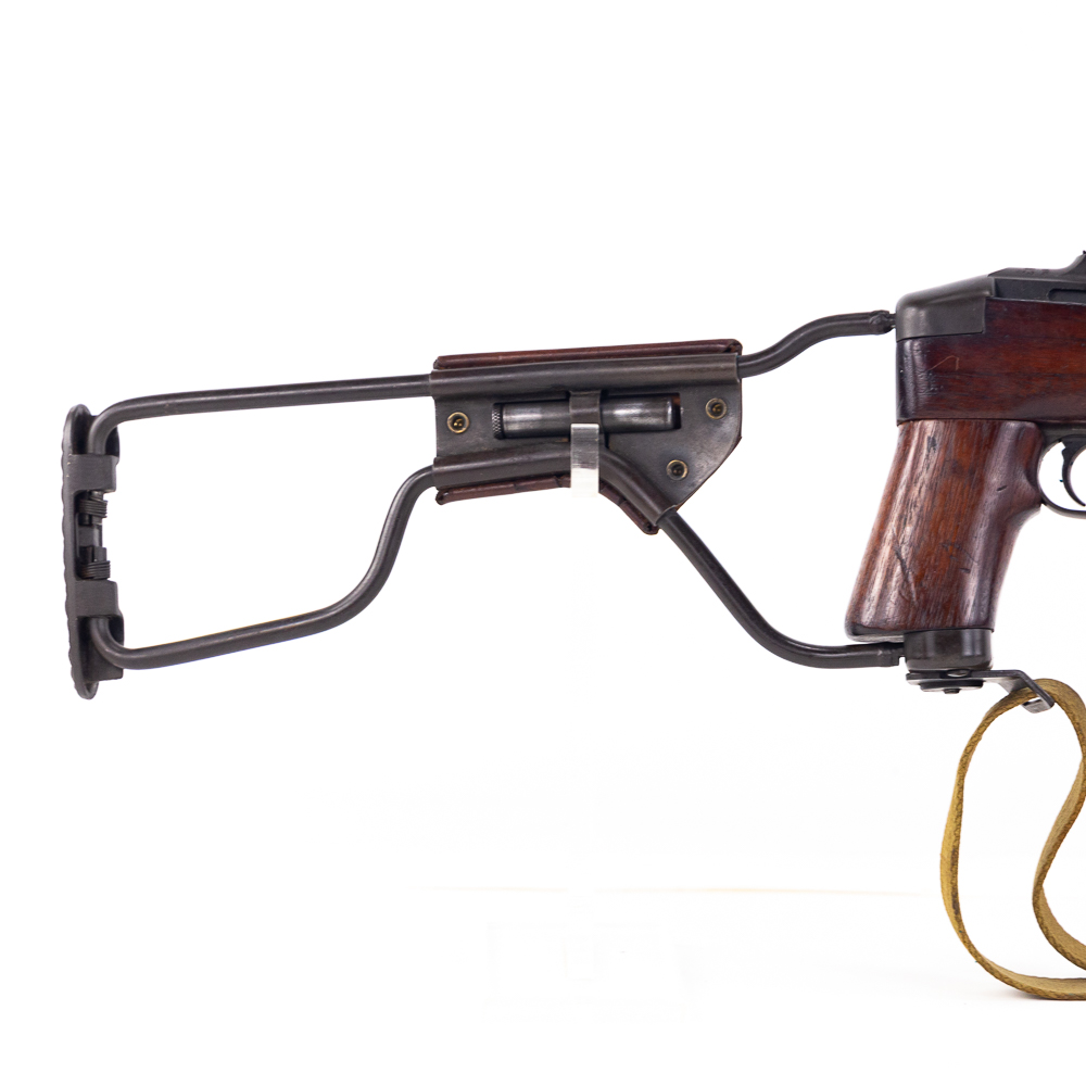 Inland M1A1 Paratrooper 30 Carbine Rifle in very good vintage condition with light wear. The bore is sharp and bright! It has a type 1 stock, flip rear sight, push button safety and one mag and canvas sling. Includes correct wire and leather paratrooper stock with oiler tube. Barrel stamped “Inland 3-43” MFG 05/42-09/43