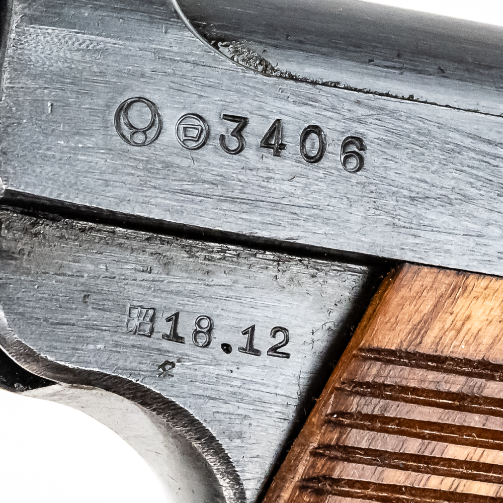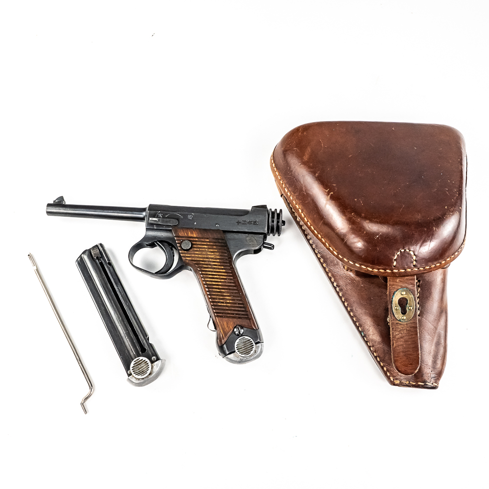 World War II Japanese Type 14 pistol made by Nagoya in December of 1943. This is a very nice 8mm gun with two matching mags, original holster with cleaning tool and spare firing pin. Condition is 99% and is near factory mint. Perfect grips and bore. The holster is in excellent condition with supple leather and showing limited wear. Please see photos for overall condition. Part of the John Bannister Collection.