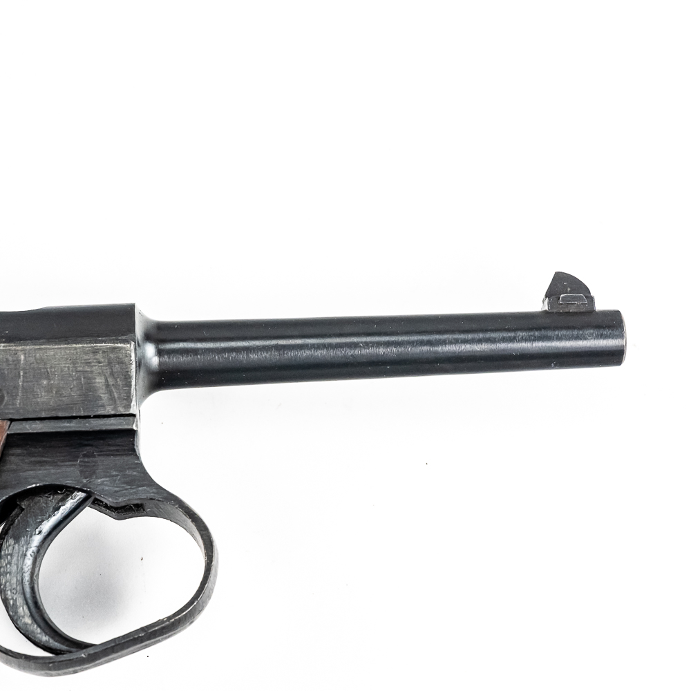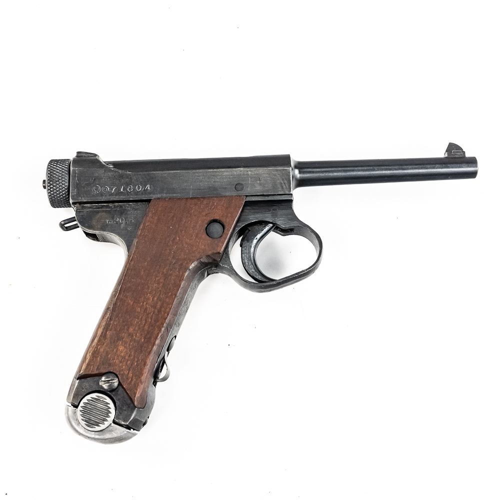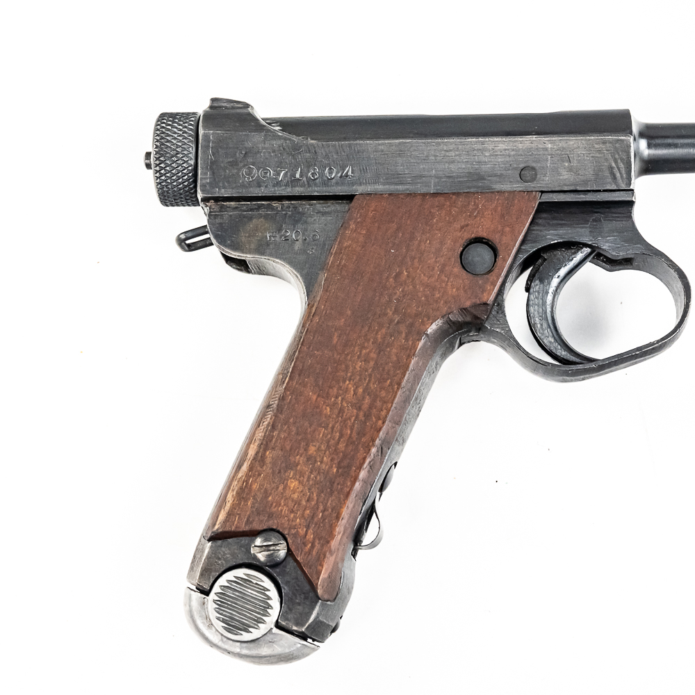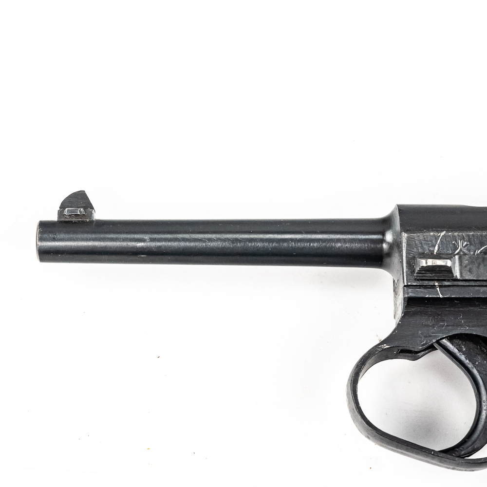 Late World War II Japanese Type 14 pistol made by Nagoya in June of 1945. Very late war, “last ditch” gun with rough tooling and mill marks. Condition is 99% and is near factory mint. Perfect late war smooth grips and mint bore. Has matching magazine. The trigger and action are tight and function properly. It will be hard to find a cleaner, late war Type 14 pistol. Please see photos for overall condition and markings. Part of the John Bannister Collection.