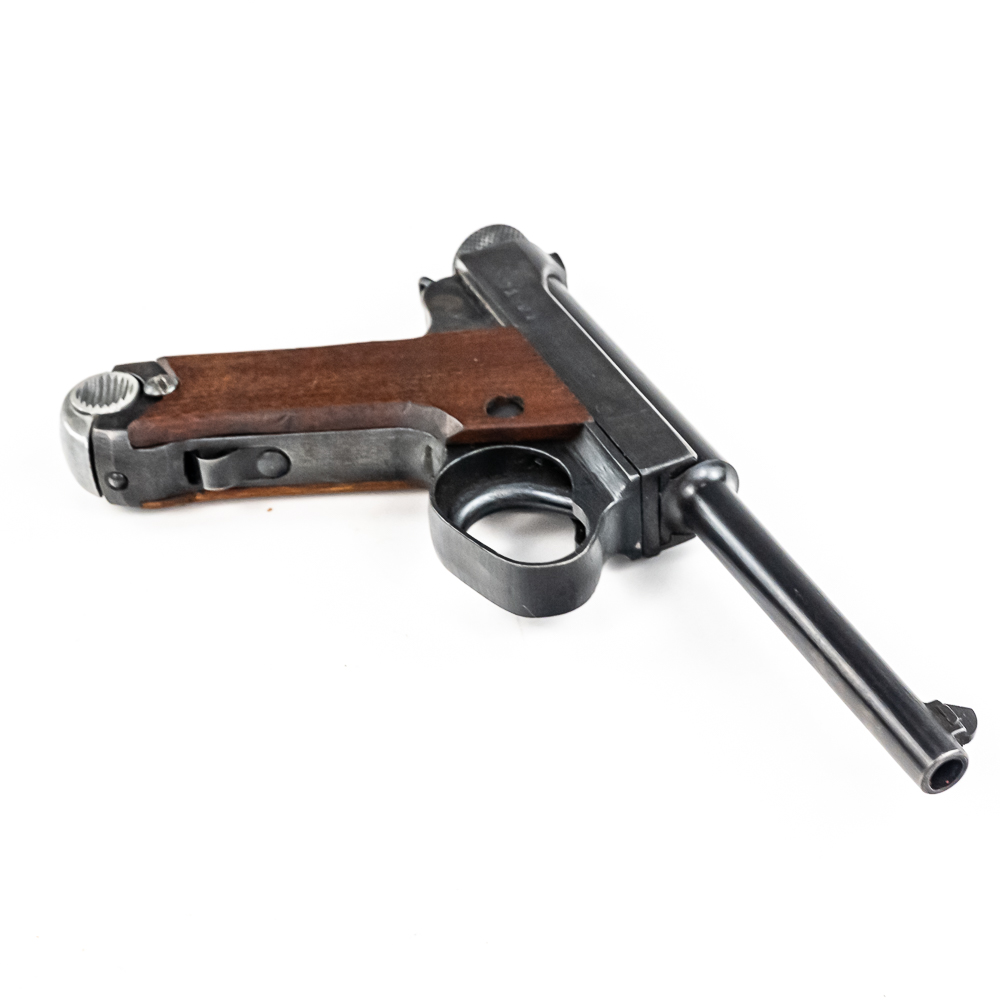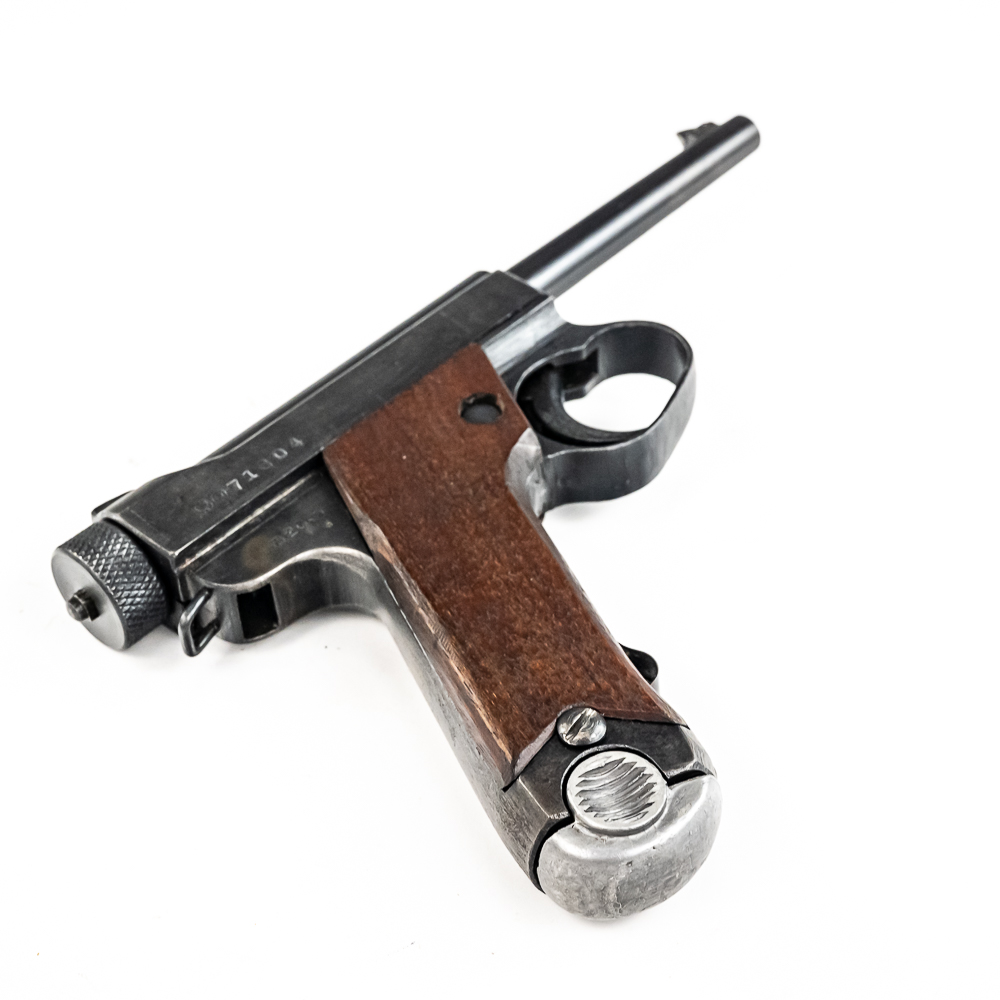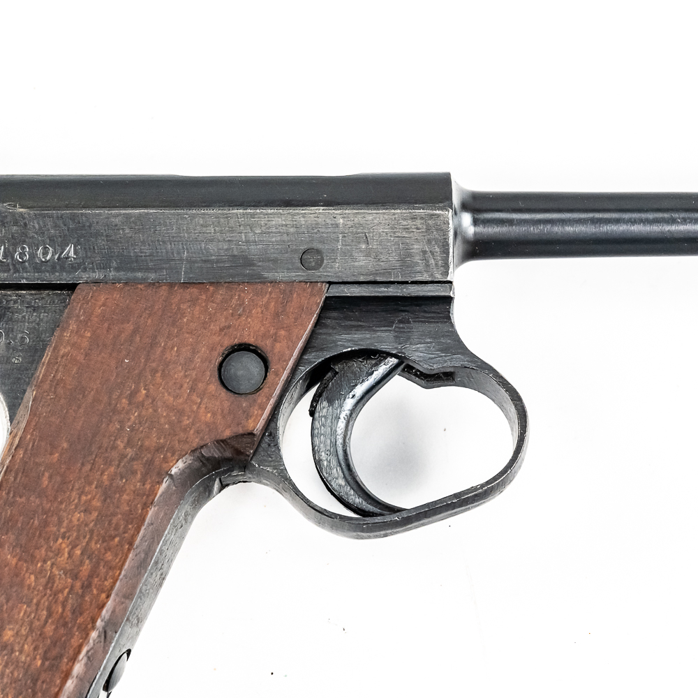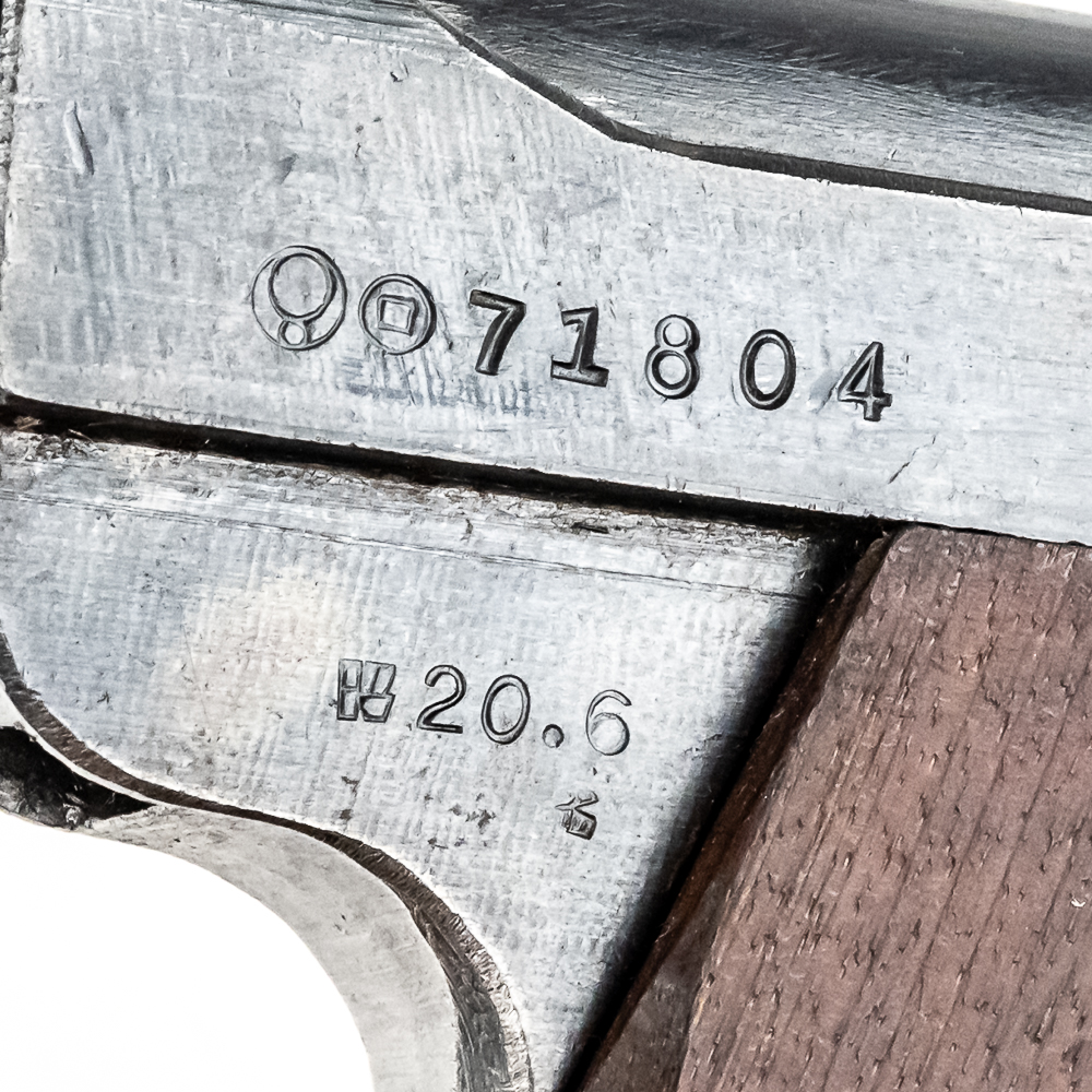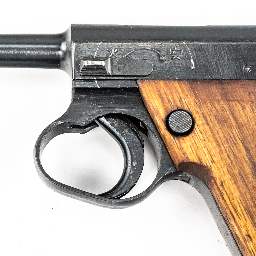 Late World War II Japanese Type 14 pistol made by Nagoya in June of 1945. Very late war, “last ditch” gun with rough tooling and mill marks. Condition is 99% and is near factory mint. Perfect late war smooth grips and mint bore. Has matching magazine. The trigger and action are tight and function properly. It will be hard to find a cleaner, late war Type 14 pistol. Please see photos for overall condition and markings. Part of the John Bannister Collection.