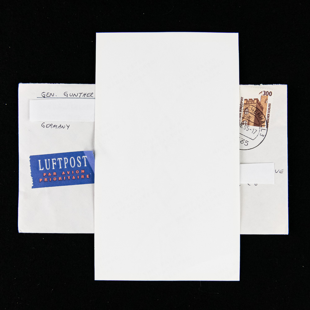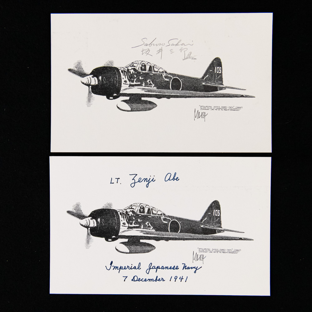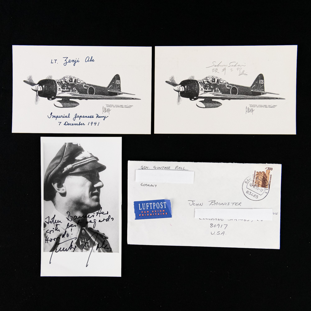 This is an exceptional grouping of World War II aviator ephemera, highly desirable for any military history collector. The lot centers around a signed photograph of General Günther Rall (1918-2009), the third-most successful fighter ace in history with 275 victories, executed in black-and-white. The envelope addressed to him in 8700 Würzburg, Reichenhall, Germany features a distinct ‘LUFTPOST PAR AVION’ sticker and a German postage stamp, adding provenance to the grouping. The two included unsigned photo cards depict an Imperial Japanese Navy fighter aircraft, identified by the accompanying text as an aircraft flown by LT. Zenji Abe on 7 December 1941, and are likely reproductions from the era or a later collector set. These items are all paper and cardstock. The photograph and associated envelope are in very good overall condition, with the autograph in sharp, dark ink, showing only minor edge wear and age-toning typical of items stored for decades. The photo cards are also crisp with minimal wear. H 9", W 10.5". Part of the John Bannister Collection.