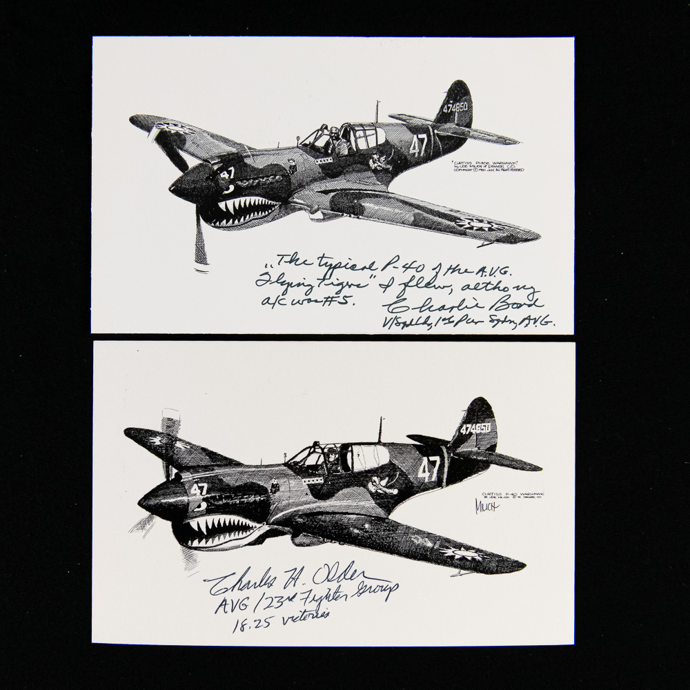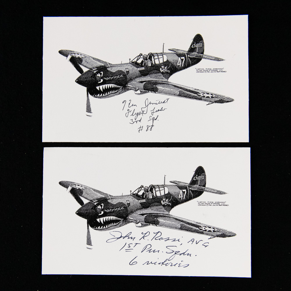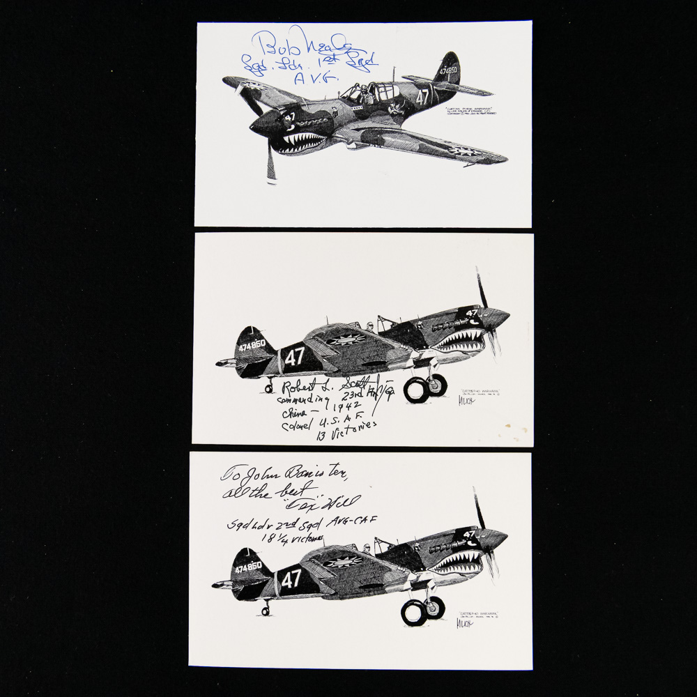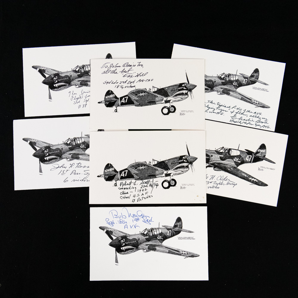 The Flying Tigers hold a legendary place in aviation history, and this lot of six (6) postcard-sized cards, each featuring a striking black and white print of a Curtiss P-40 Warhawk in the iconic “shark mouth” livery of the American Volunteer Group (AVG), is a true collector’s prize. The aircraft depicted is marked “474BBQ” and has the number “47” on its fuselage, a recognizable AVG scheme. The cards are reproductions of what appear to be original artwork by the artist RLD, whose initials are faintly visible on the lower right of the prints. The real value, of course, lies in the six original signatures from AVG members. The top left card is inscribed “To John Bannister, all the best” and signed by Tex Hill (Squadron 2nd, 18 1/4 victories). Other signatures include: Robert L. Scott (who notes commanding the 23rd Ftr/Gp, with 4 5/8 victories), Charles H. Older (Squadron 1st/3rd, 18.25 victories), John R. Rossi (1st Psn. Sqdn., 6 victories), “Bob” Neale (Squadron 1st), and Ken Jernstedt (noting his service with the 3rd Sqd and Flt #88). Jernstedt was a distinguished Flight Leader in the 3rd Pursuit Squadron (“Hell’s Angels”) and an Ace credited with 10.5 victories. The cards are printed on a stiff, white cardstock. Condition is excellent, showing only light handling wear consistent with age, and a slight yellowing/tanning around the edges of some cards. The signatures themselves are clear and bold in blue and black ink. H 4″, W 6″ See photos.