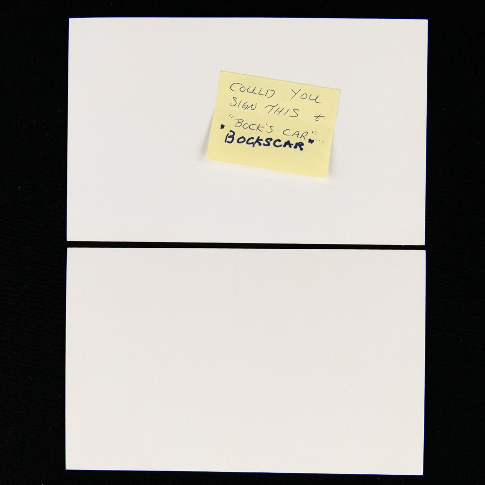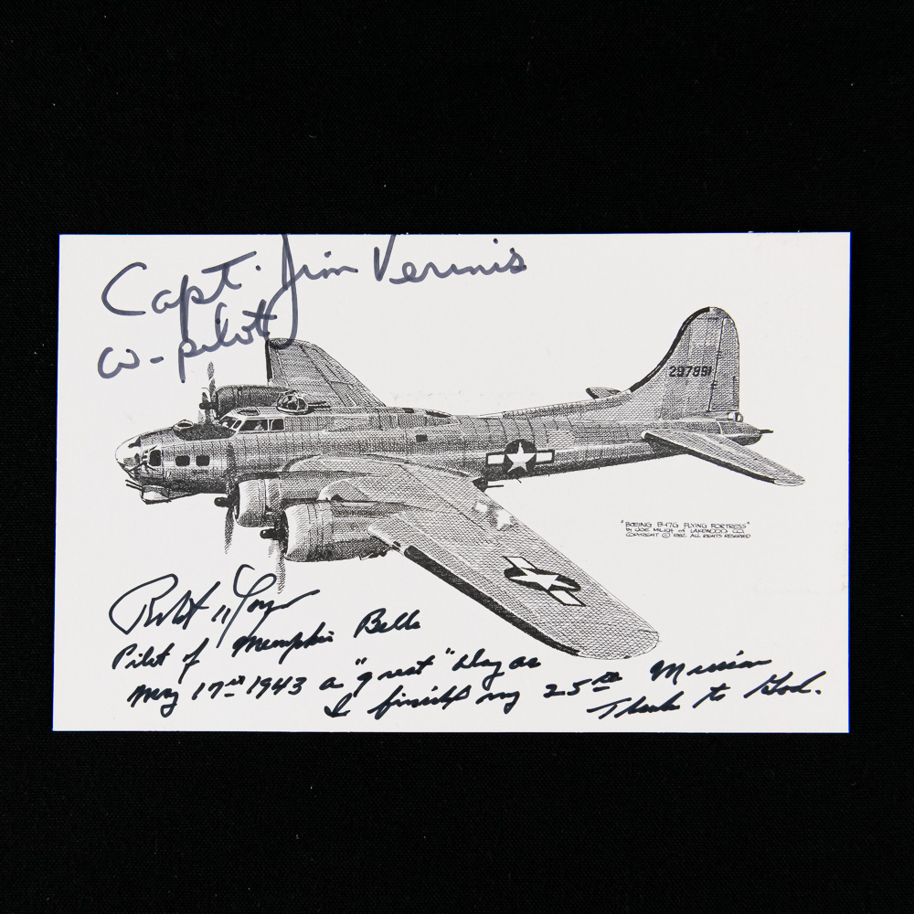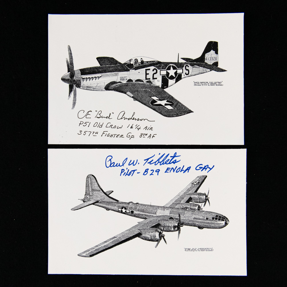 Phenomenal grouping of five hand-signed aviation art cards, a true piece of history for any military or aviation collector. Each card features a detailed black-and-white sketch of a significant WWII-era aircraft and bears the authentic signature of a pilot associated with that specific plane, all on postcard-weight cardstock. The collection includes the iconic B-17 Flying Fortress, the B-29 Superfortress “Enola Gay” signed by Paul W. Tibbets (Pilot), a second B-29 signed by Capt. C. R. Carberry (“Bockscar” Navigator), a P-51 Mustang signed by C.E. “Bud” Anderson (Yeager’s wingman), and a P-51 Mustang signed by Chuck Yeager. The condition of the set is excellent, with sharp corners and no visible creases, tears, or fading to the cardstock or the ink; the signatures are clear and bold. Each measures H 4″, W 6″. See photos.