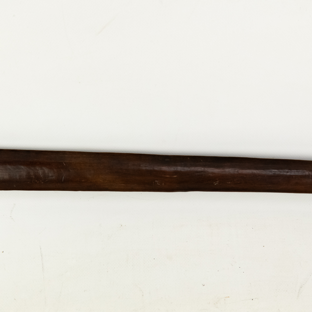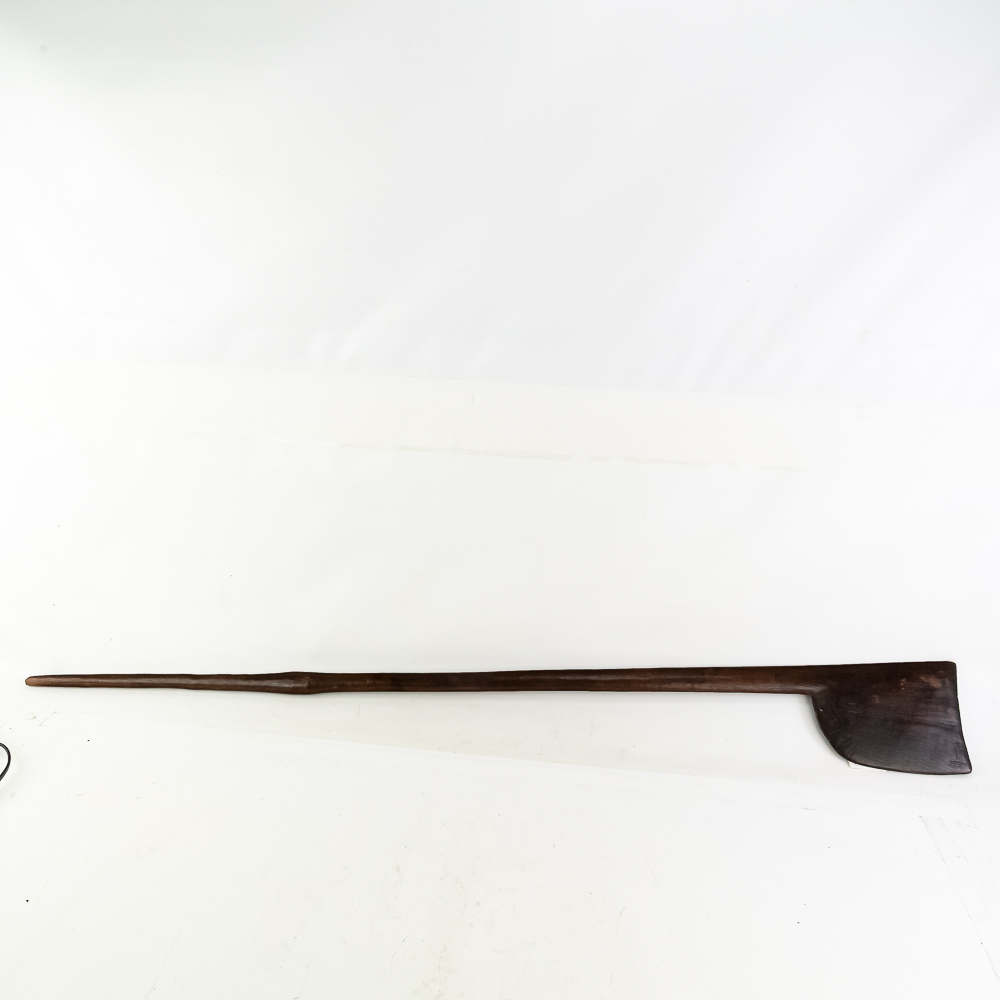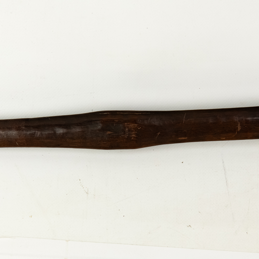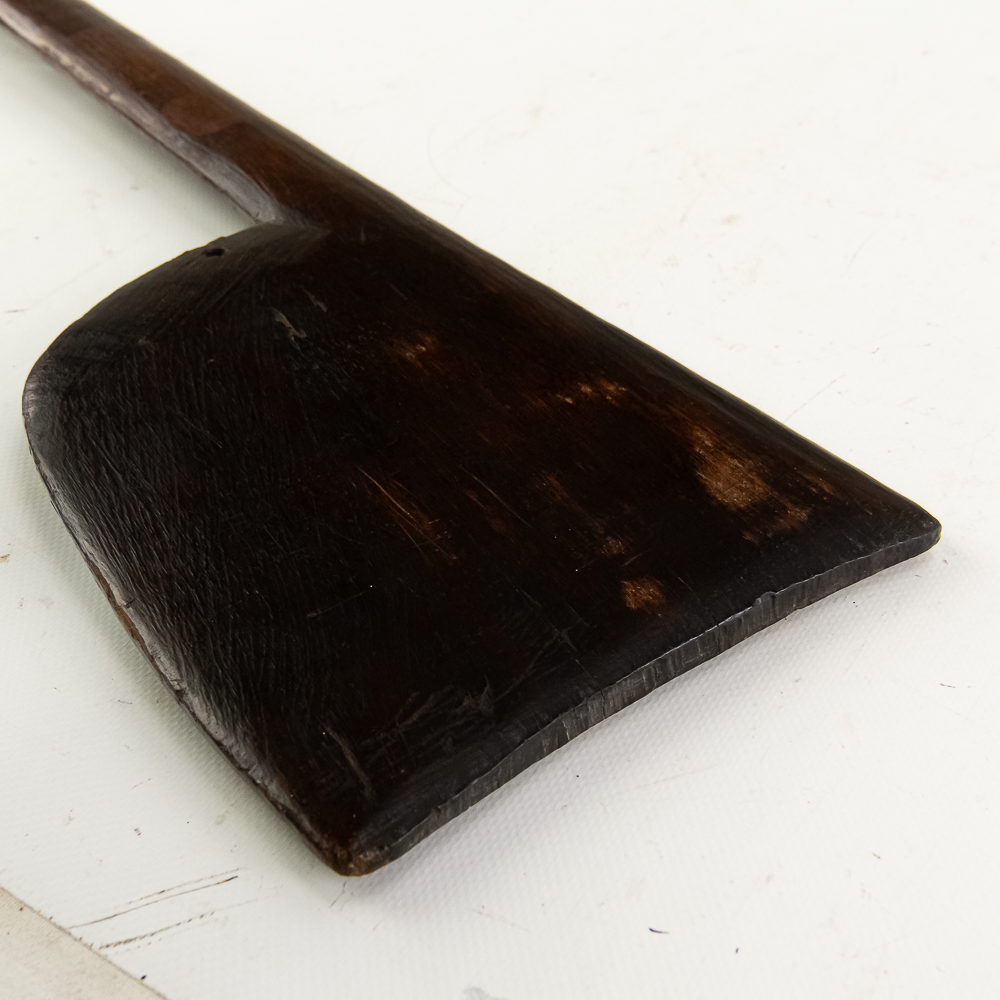 19th/20th Century Pacific Maori Chief’s weapon from New Zealand. Known as a Tewhatewha, this broad, flat headed implement was used to direct troops as much as it was to kill a man. Akin to an axe, the large flat portion would have a sharpened edge for battle. At the base of the head is a hole for mounting traditional bunches of pigeon feathers in an ornamental fashion. The weapon was constructed from the root of a Maire tree. Typically about 5 feet long, this particular example comes in a hair short at 54.5” in length. The broad head measures 8.5” x 6.5”. There is a ghost of a collection tag at the top of the shaft just below the flat head. Examples like this are considered culturally significant artifacts and are prohibited from export from New Zealand, adding to its rarity. Please see photos.