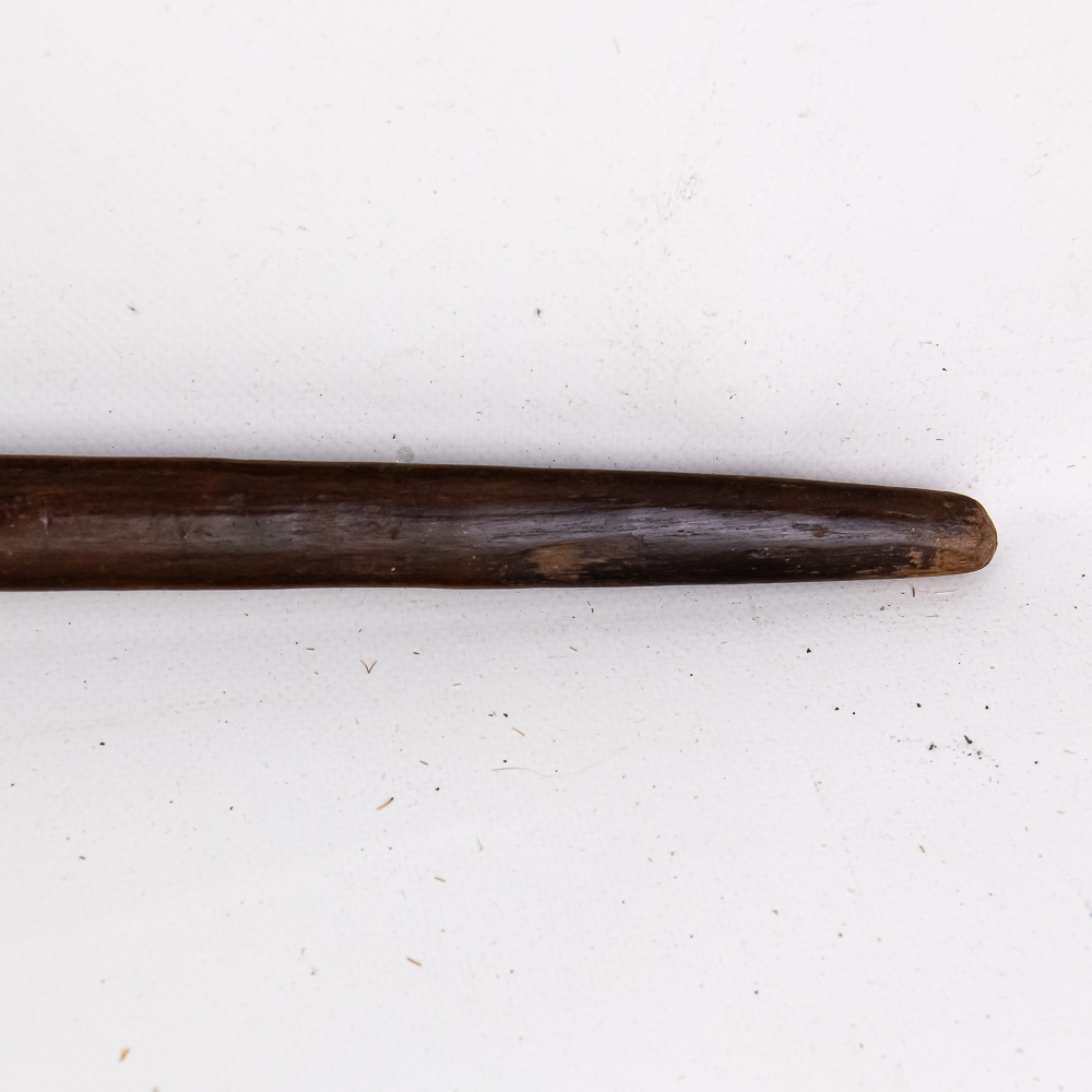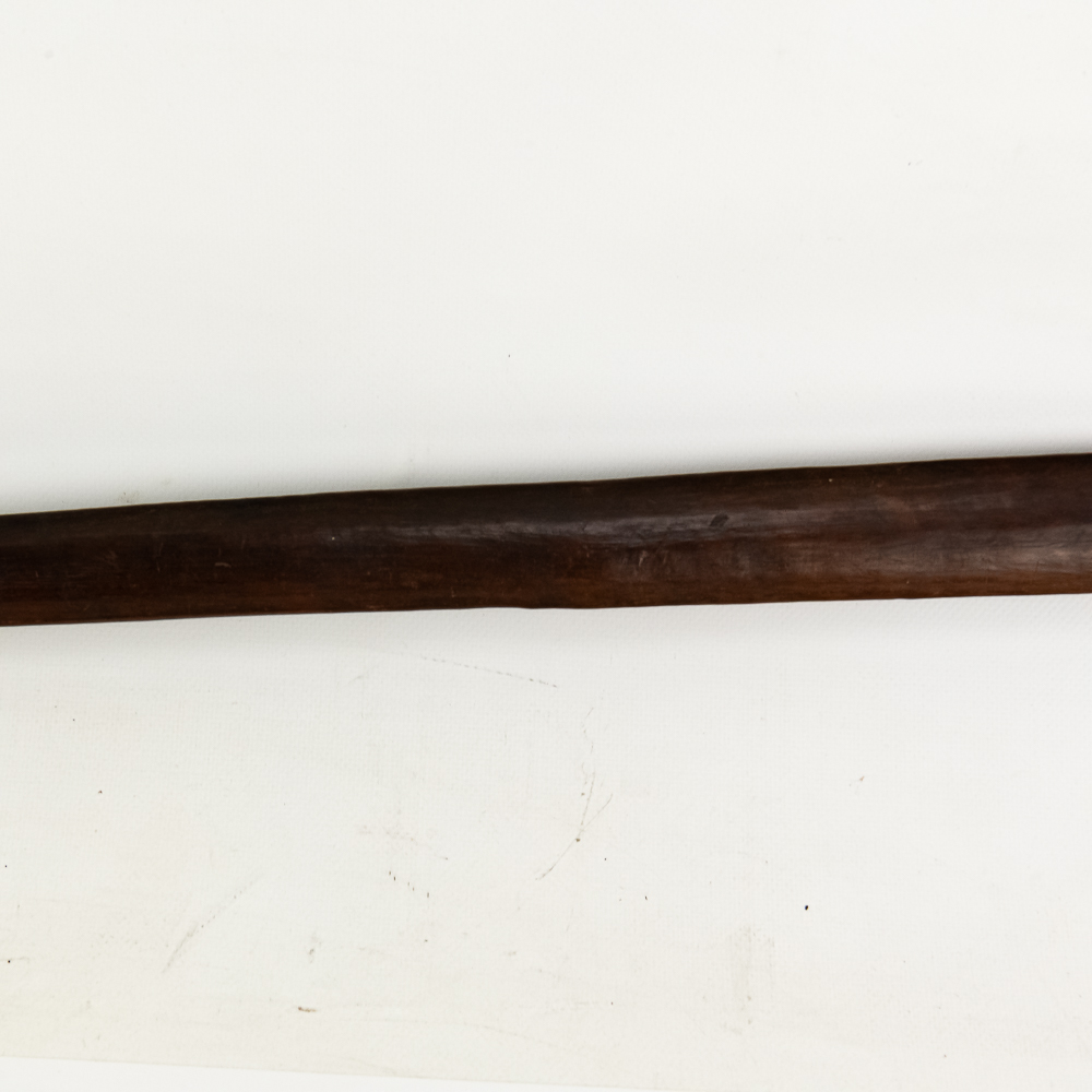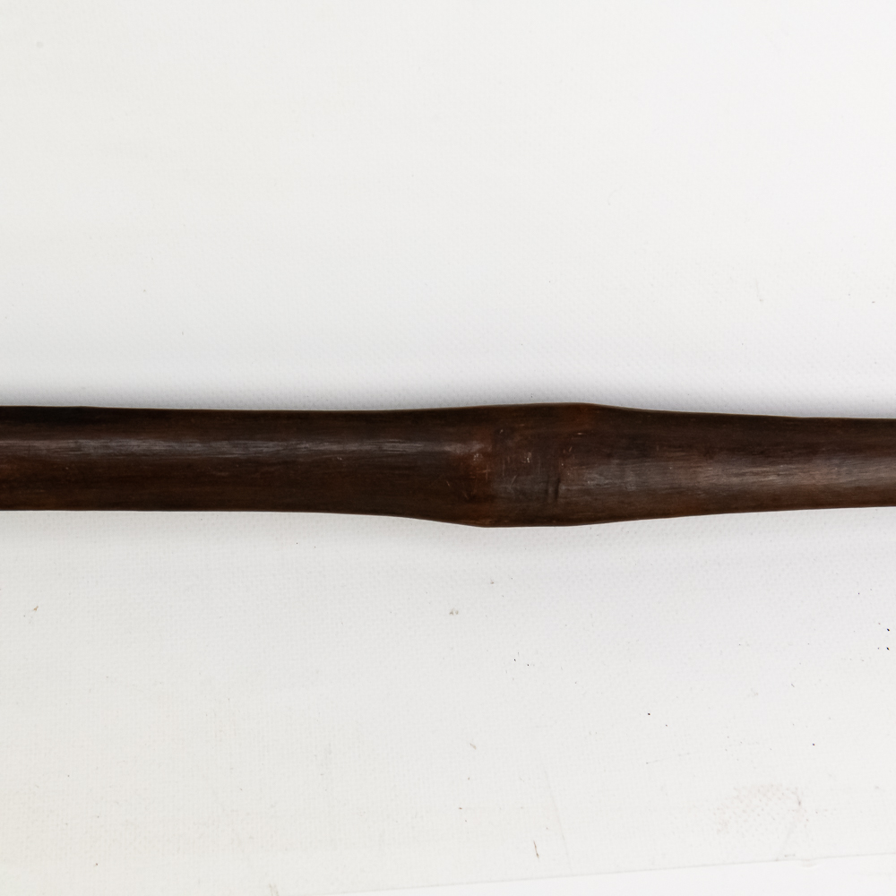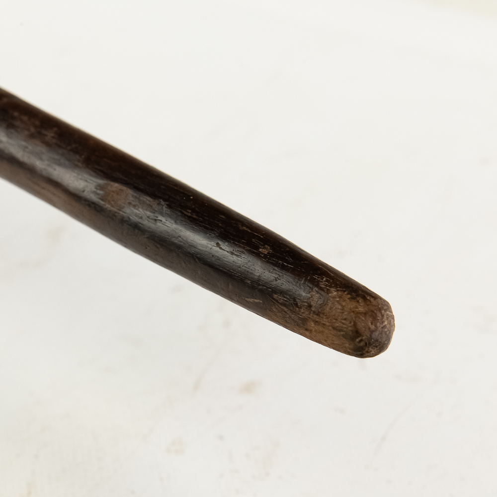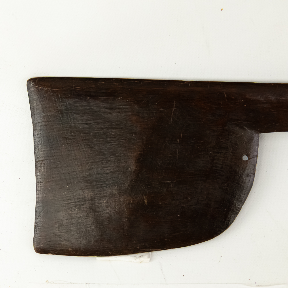 19th/20th Century Pacific Maori Chief’s weapon from New Zealand. Known as a Tewhatewha, this broad, flat headed implement was used to direct troops as much as it was to kill a man. Akin to an axe, the large flat portion would have a sharpened edge for battle. At the base of the head is a hole for mounting traditional bunches of pigeon feathers in an ornamental fashion. The weapon was constructed from the root of a Maire tree. Typically about 5 feet long, this particular example comes in a hair short at 54.5” in length. The broad head measures 8.5” x 6.5”. There is a ghost of a collection tag at the top of the shaft just below the flat head. Examples like this are considered culturally significant artifacts and are prohibited from export from New Zealand, adding to its rarity. Please see photos.
