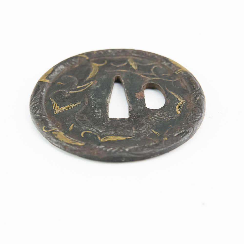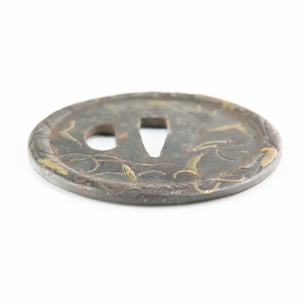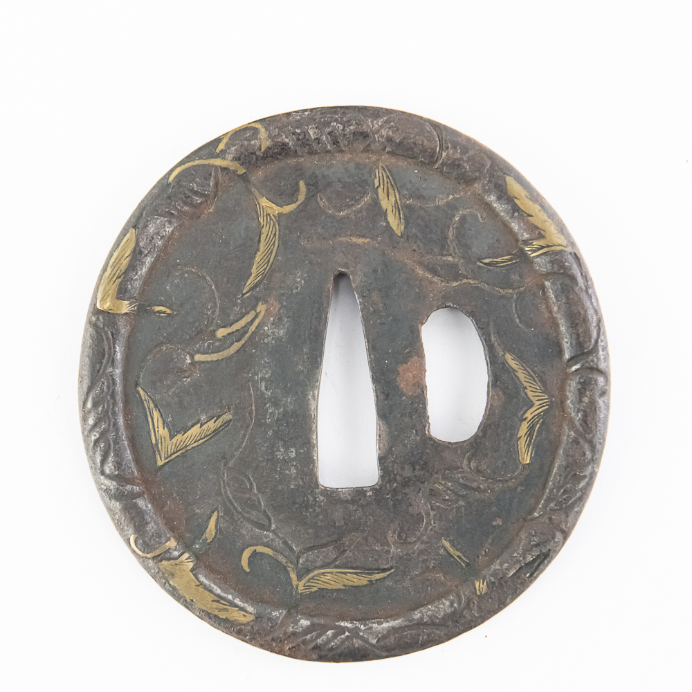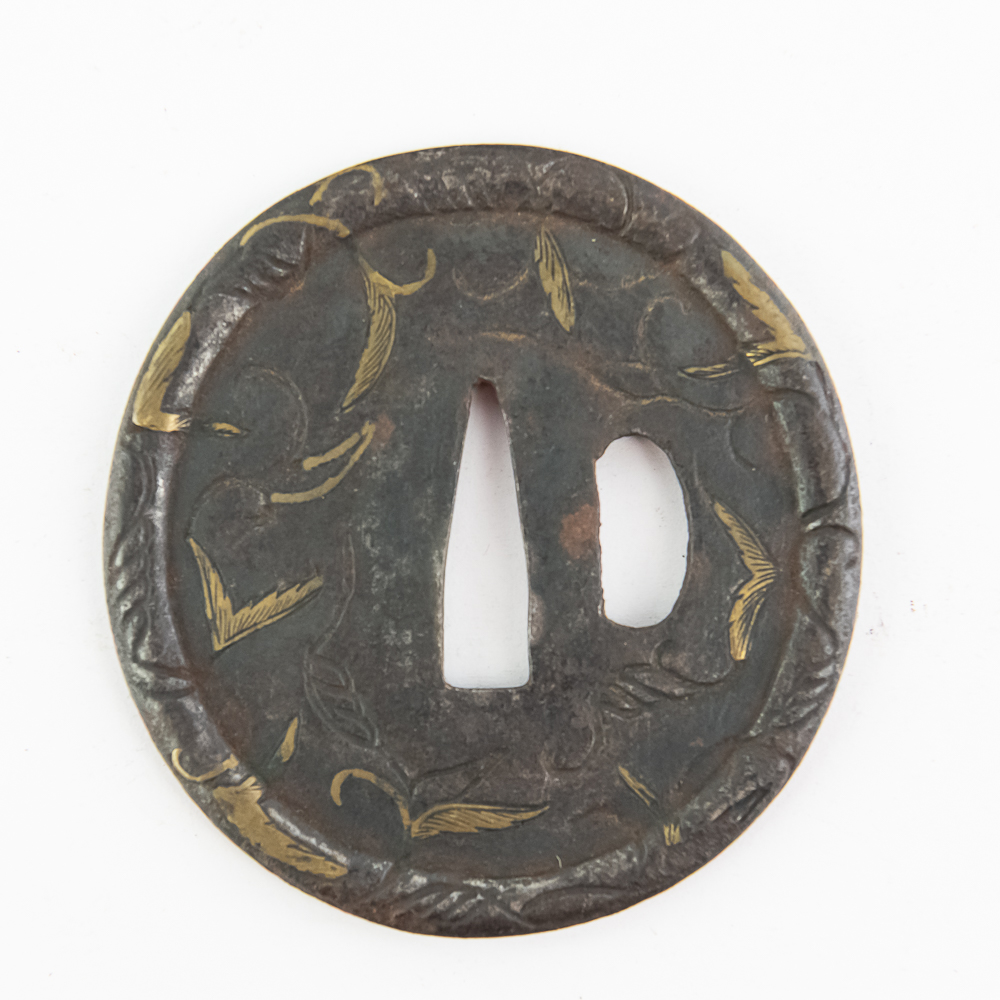 This is a beautiful example of a Japanese iron tsuba (sword guard) from the Edo period (1603-1868), likely a school piece, possibly late 18th to mid-19th century. The guard is executed in the mokko or slightly lobed circular shape (maru-gata is another possibility, but the rim suggests slight lobing) and features an attractive design of creeping vines and leaves (karakusa pattern) in an openwork (sukashi) and relief format, further enhanced by selective brass or gold nunome-zogan (inlay) highlighting the leaves. The central openings—the nakago-ana (for the blade tang) and the smaller hitsu-ana (for a utility knife or kozuka)—are cleanly formed and suggest mounting on a katana or wakizashi. The iron has developed a rich, dark patina typical of age and repeated handling. Condition: The tsuba shows significant but attractive wear consistent with age and use, including overall oxidation and darkening of the iron. The brass/gold inlay remains visible but is worn down in areas, and the edges show minor pitting and surface wear. Overall, it is in good antique condition, with the patina and wear contributing to its historical appeal. Diameter: 2.75” Please see photos.