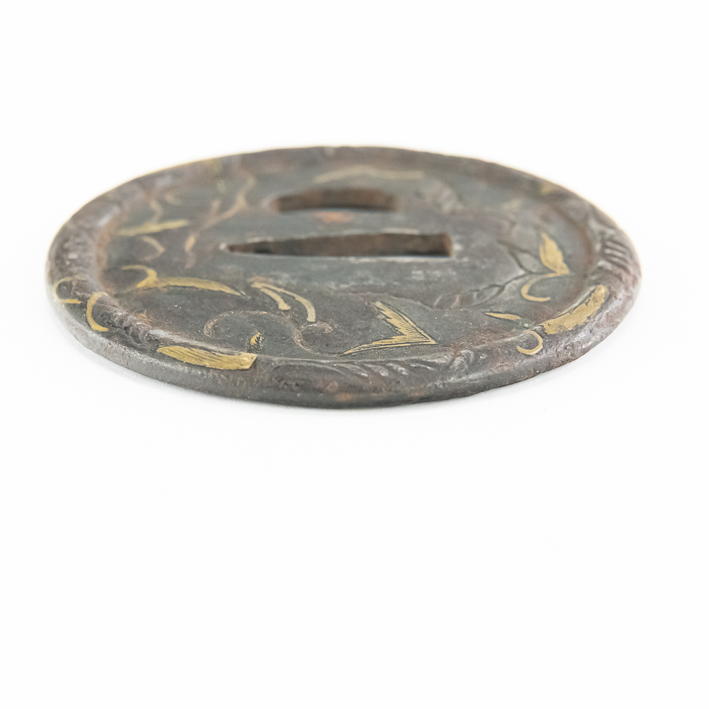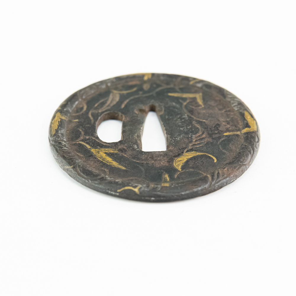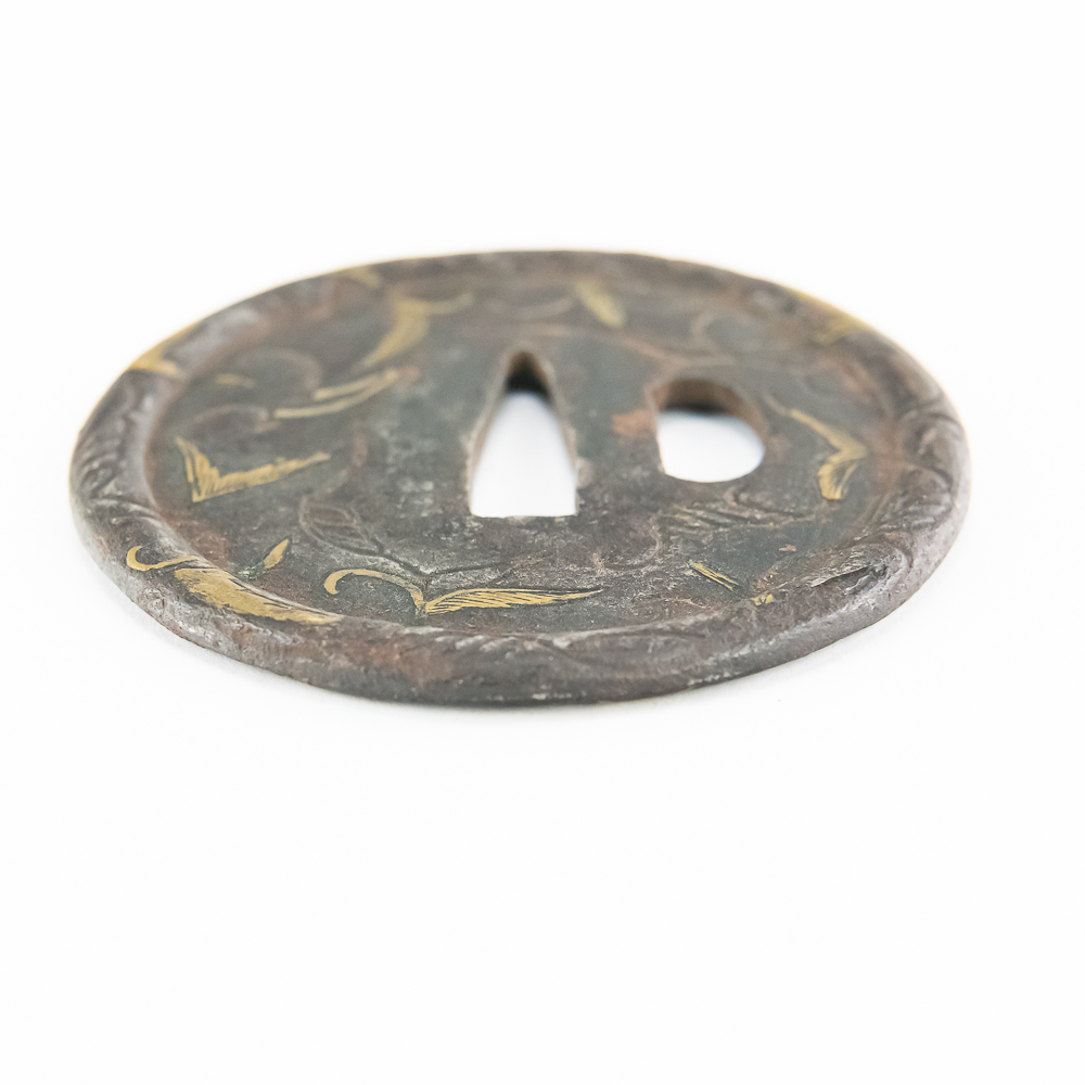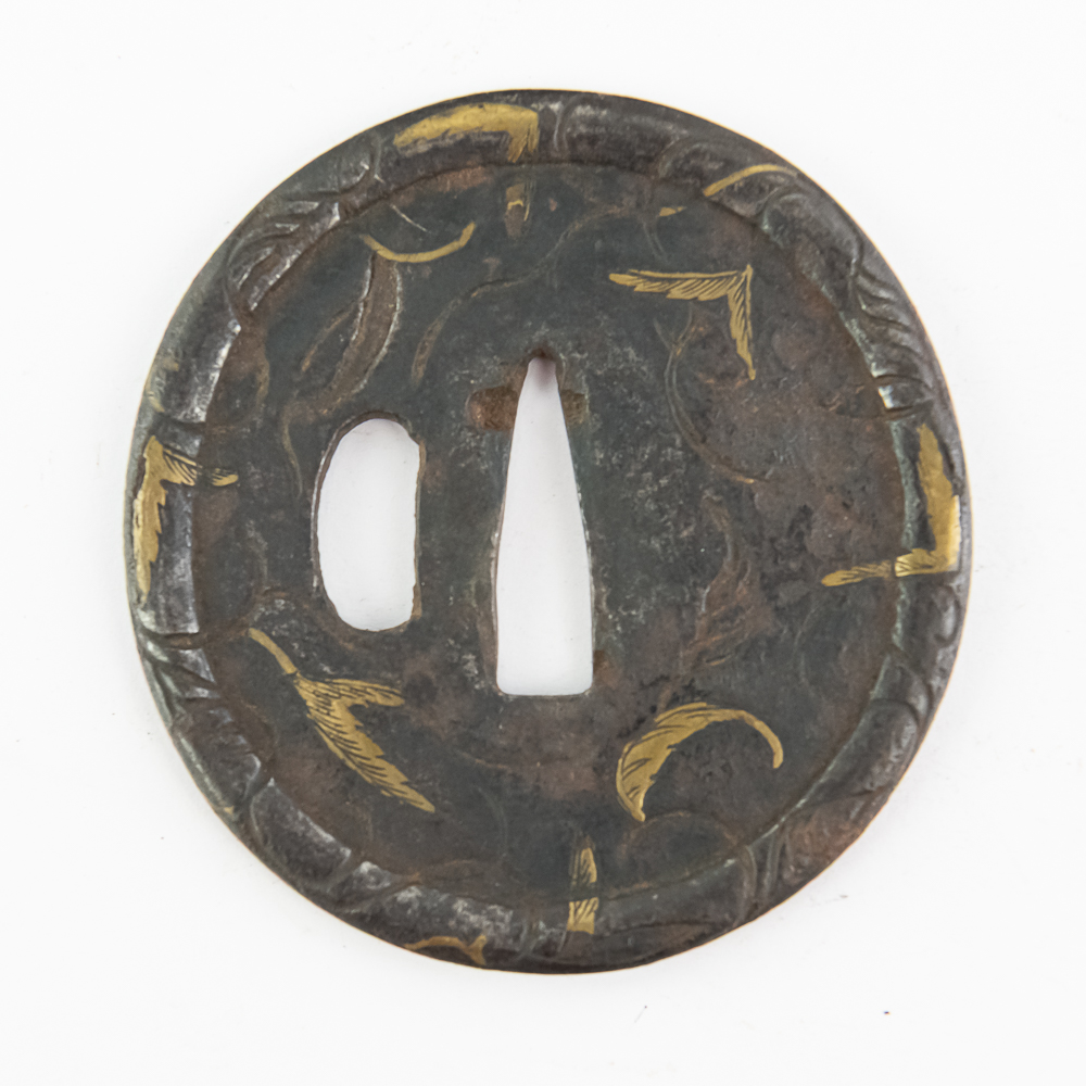 This is a beautiful example of a Japanese iron tsuba (sword guard) from the Edo period (1603-1868), likely a school piece, possibly late 18th to mid-19th century. The guard is executed in the mokko or slightly lobed circular shape (maru-gata is another possibility, but the rim suggests slight lobing) and features an attractive design of creeping vines and leaves (karakusa pattern) in an openwork (sukashi) and relief format, further enhanced by selective brass or gold nunome-zogan (inlay) highlighting the leaves. The central openings—the nakago-ana (for the blade tang) and the smaller hitsu-ana (for a utility knife or kozuka)—are cleanly formed and suggest mounting on a katana or wakizashi. The iron has developed a rich, dark patina typical of age and repeated handling. Condition: The tsuba shows significant but attractive wear consistent with age and use, including overall oxidation and darkening of the iron. The brass/gold inlay remains visible but is worn down in areas, and the edges show minor pitting and surface wear. Overall, it is in good antique condition, with the patina and wear contributing to its historical appeal. Diameter: 2.75” Please see photos.