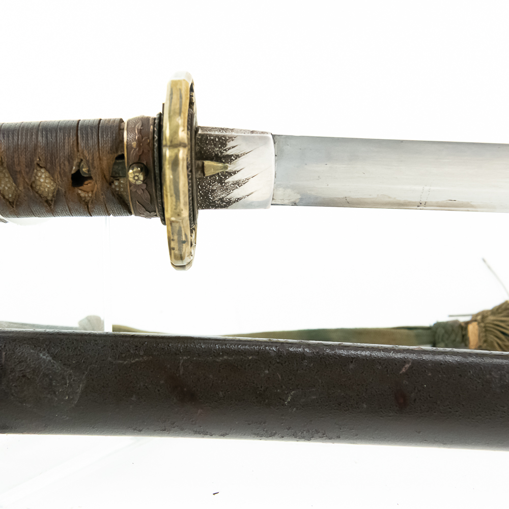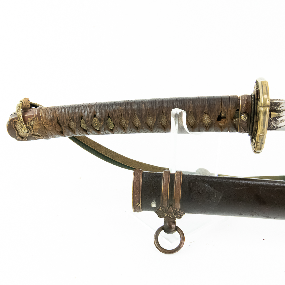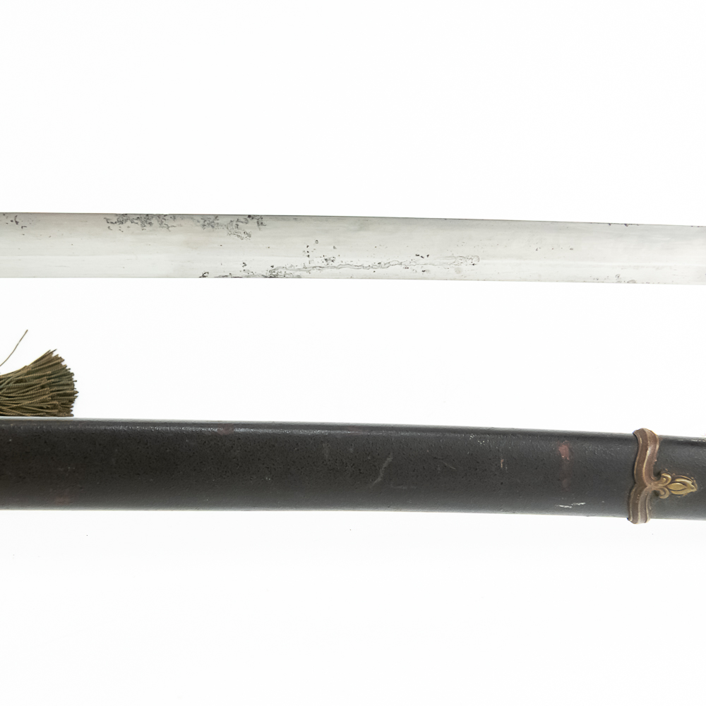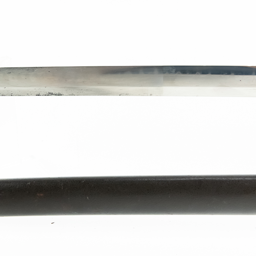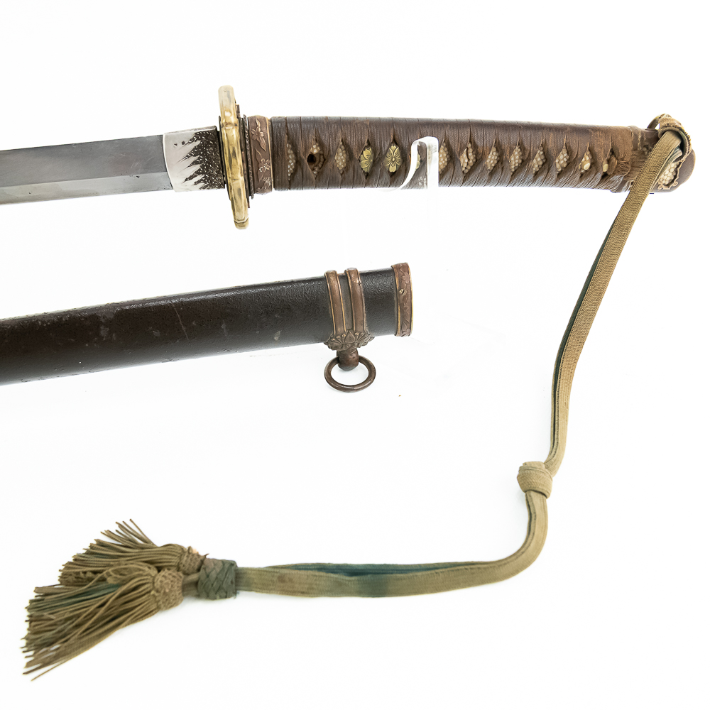 WWII Japanese Army Officer’s Sword. BLADE: Single hole tang, unsigned. BLADE MARKINGS: No. HABAKI: Silver foil with rain design. GUARD (Tsuba): Solid brass. HANDLE (Tsuka): Standard showing wear. Tassel, two color Brown/Blue, faded and frayed. SCABBARD (Saya): Standard Army metal with average wear. MEASUREMENTS : 38.5” overall. 25.5” blade. Please see photos for overall condition.