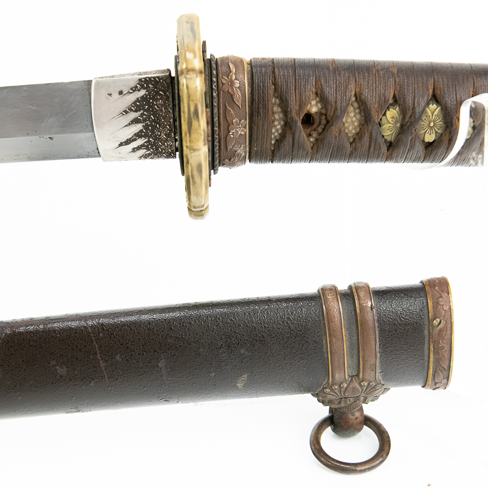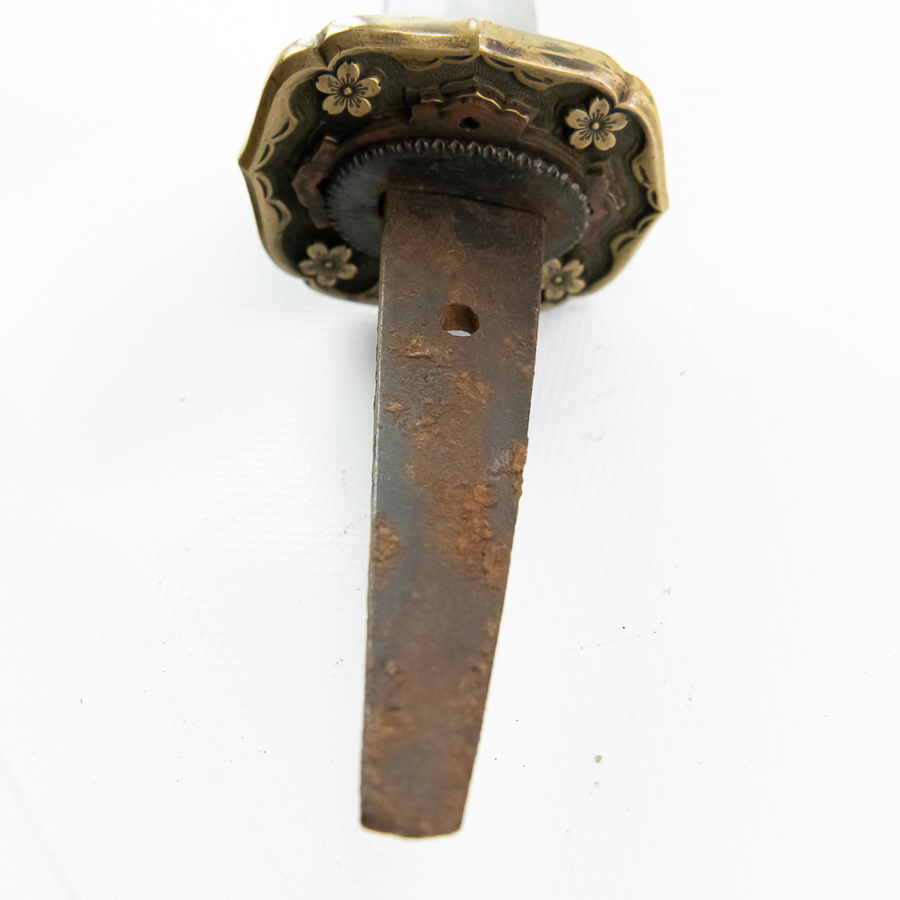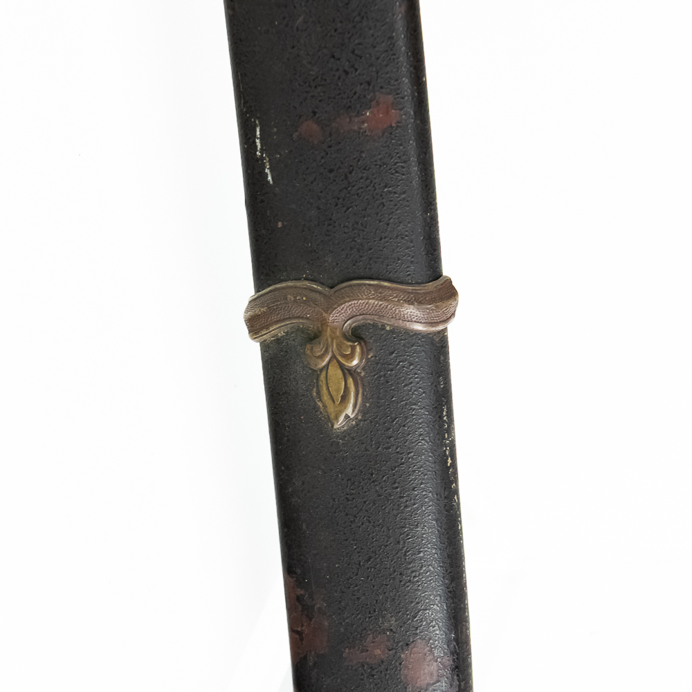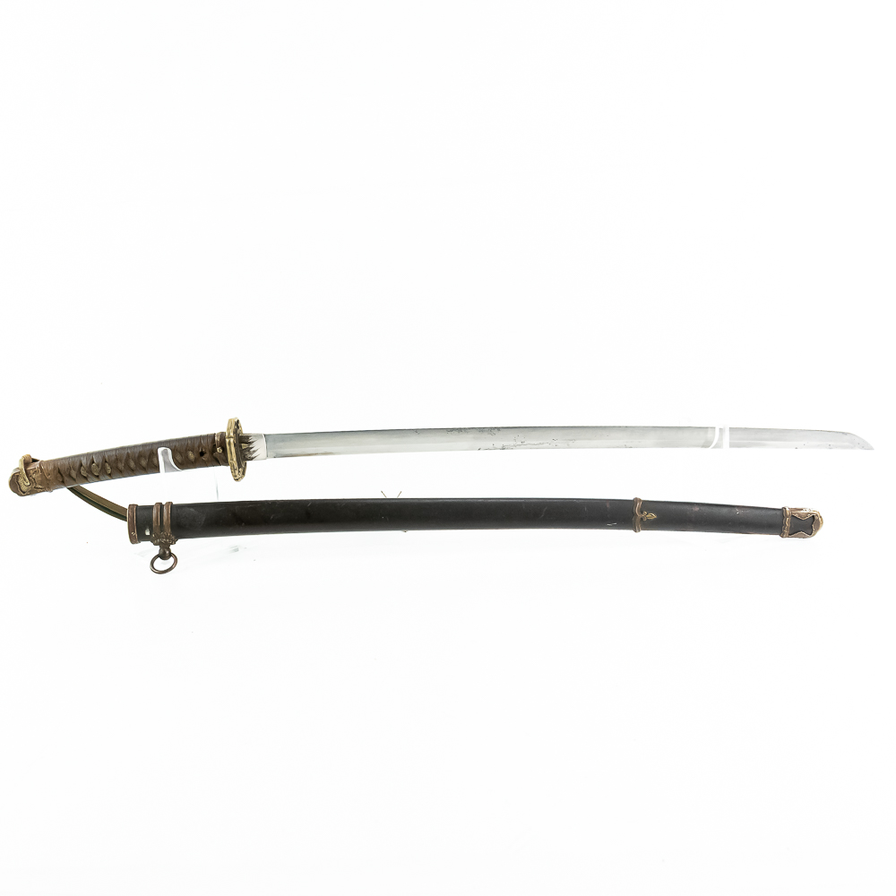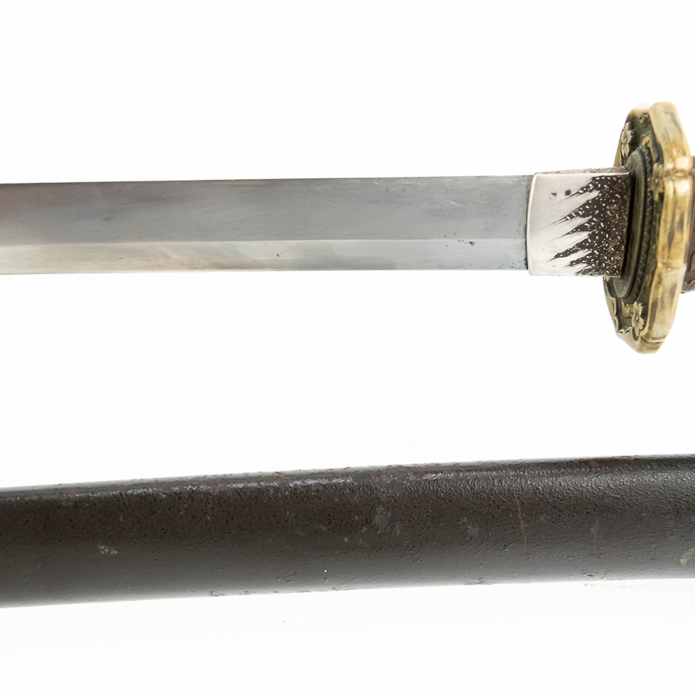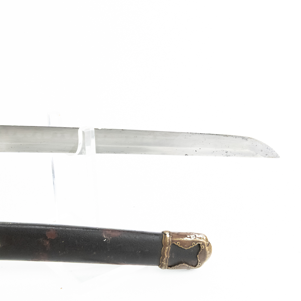WWII Japanese Army Officer’s Sword. BLADE: Single hole tang, unsigned. BLADE MARKINGS: No. HABAKI: Silver foil with rain design. GUARD (Tsuba): Solid brass. HANDLE (Tsuka): Standard showing wear. Tassel, two color Brown/Blue, faded and frayed. SCABBARD (Saya): Standard Army metal with average wear. MEASUREMENTS : 38.5” overall. 25.5” blade. Please see photos for overall condition.