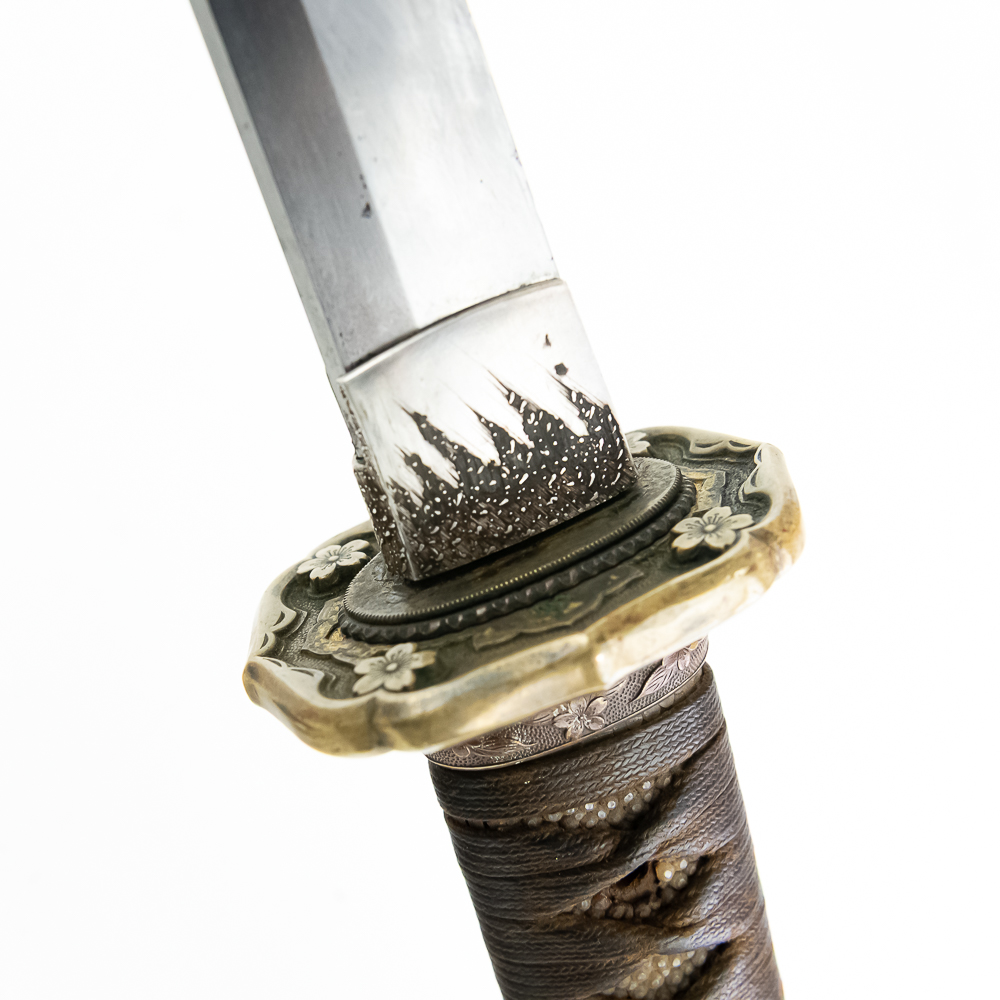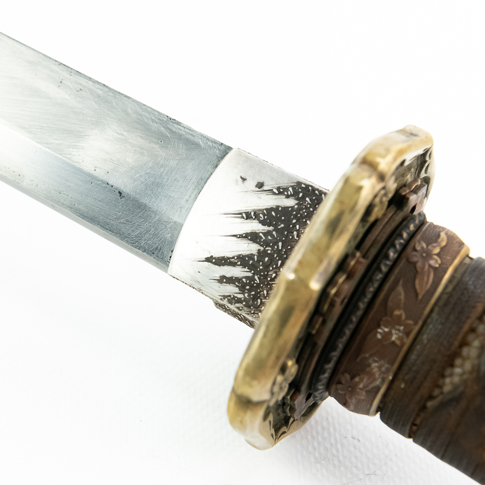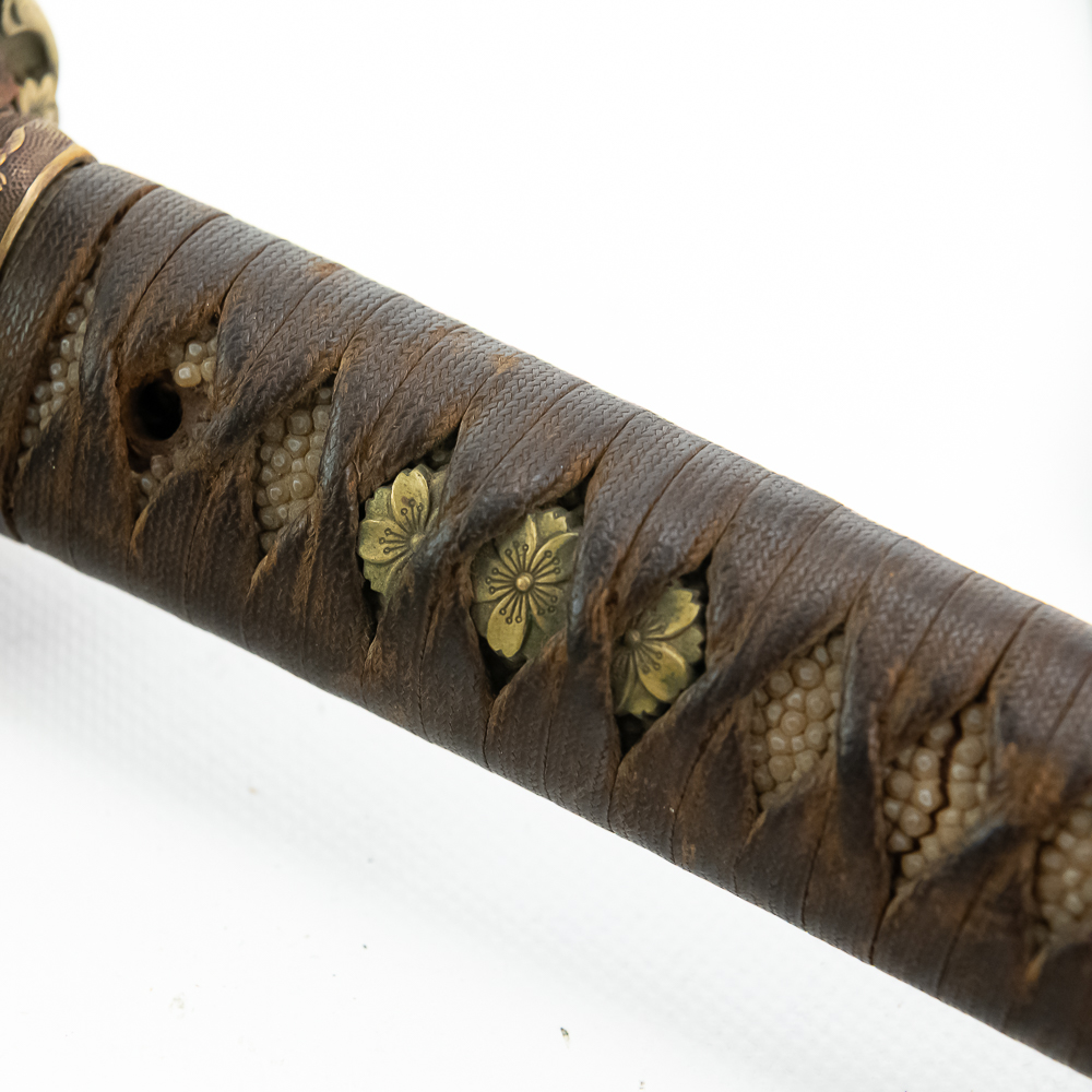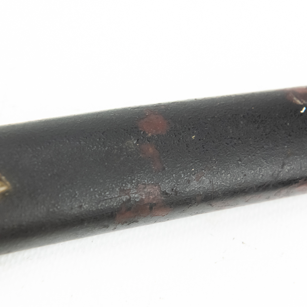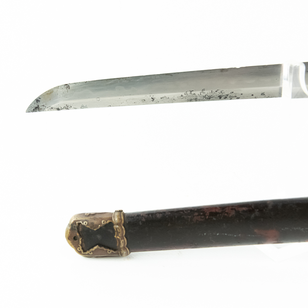 WWII Japanese Army Officer’s Sword. BLADE: Single hole tang, unsigned. BLADE MARKINGS: No. HABAKI: Silver foil with rain design. GUARD (Tsuba): Solid brass. HANDLE (Tsuka): Standard showing wear. Tassel, two color Brown/Blue, faded and frayed. SCABBARD (Saya): Standard Army metal with average wear. MEASUREMENTS : 38.5” overall. 25.5” blade. Please see photos for overall condition.