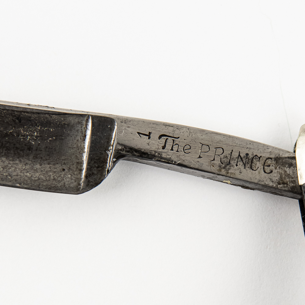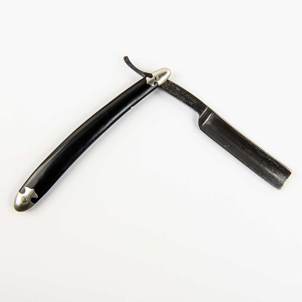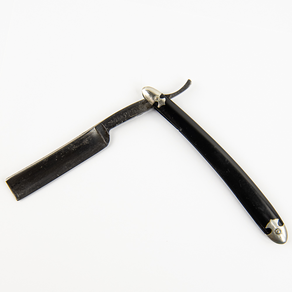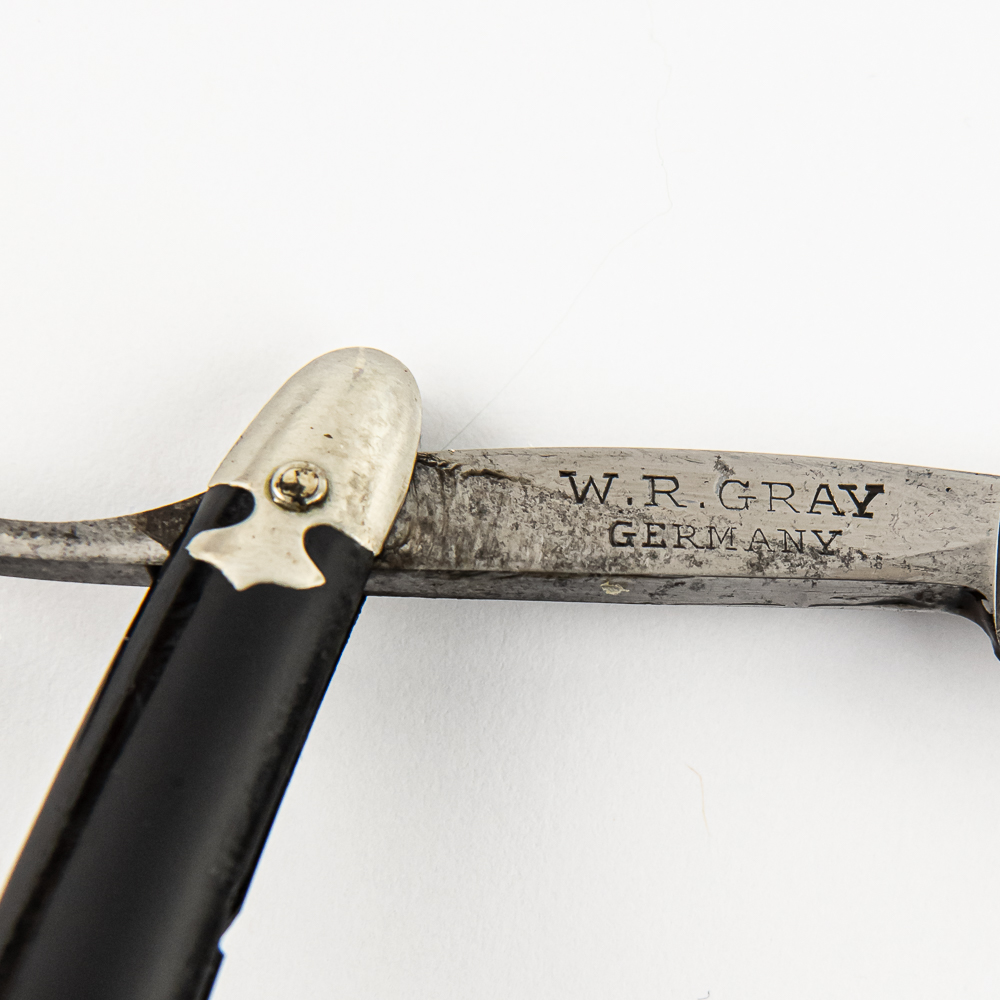Vintage Straight Razor The Prince 1 by W. R. Gray, with black plastic scales, with metal caps on ends. Edges of scales do show some wear, like small chips. The face is blank, Tang reads “The Prince” with a “1”, and reverse reads “W.R. Gray Germany”. Blade is in overall great condition, has cosmoline protectant applied, with very minimal tarnish noted. Original Box NOT included. See photos and bid accordingly.
