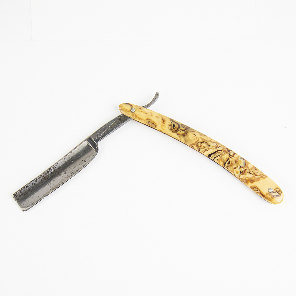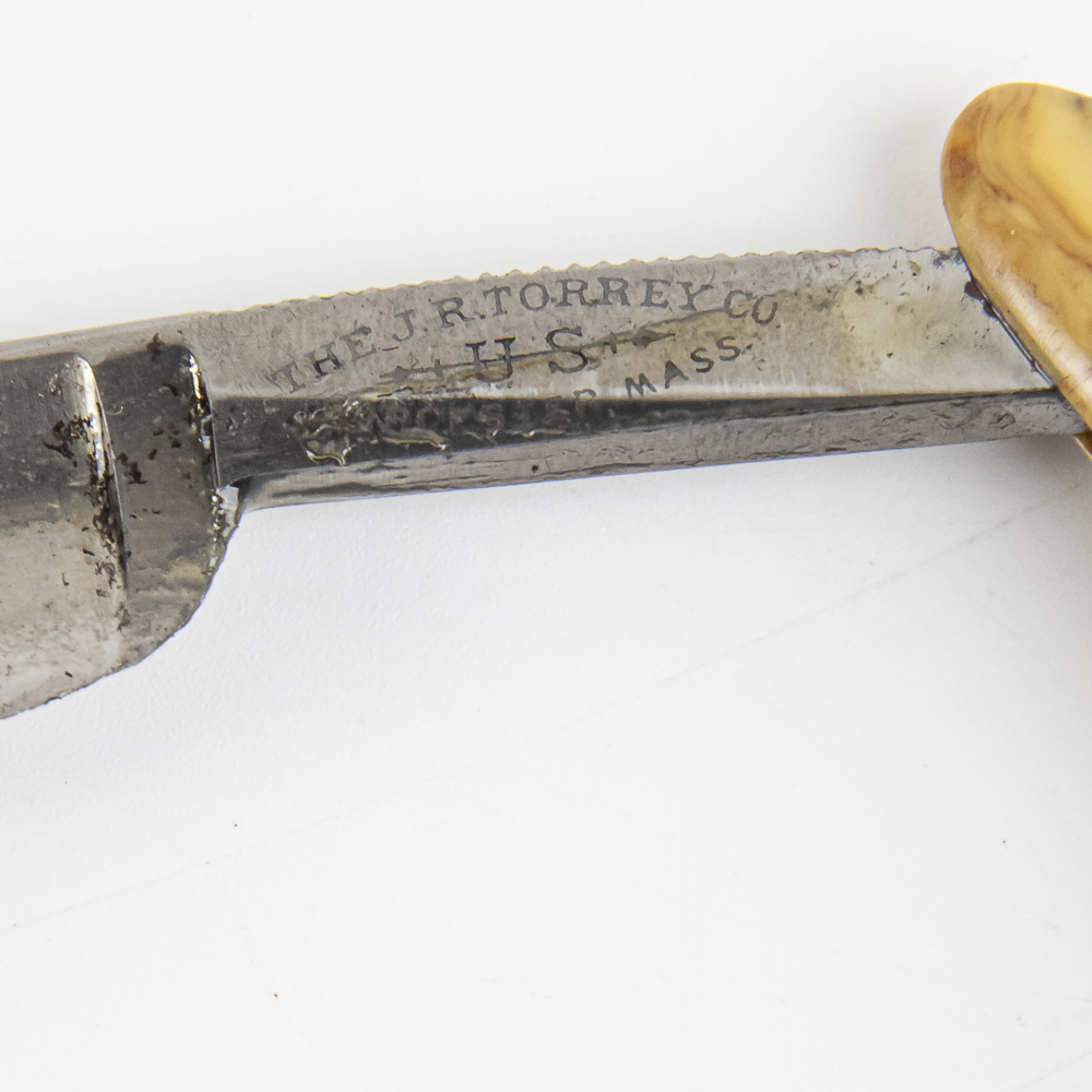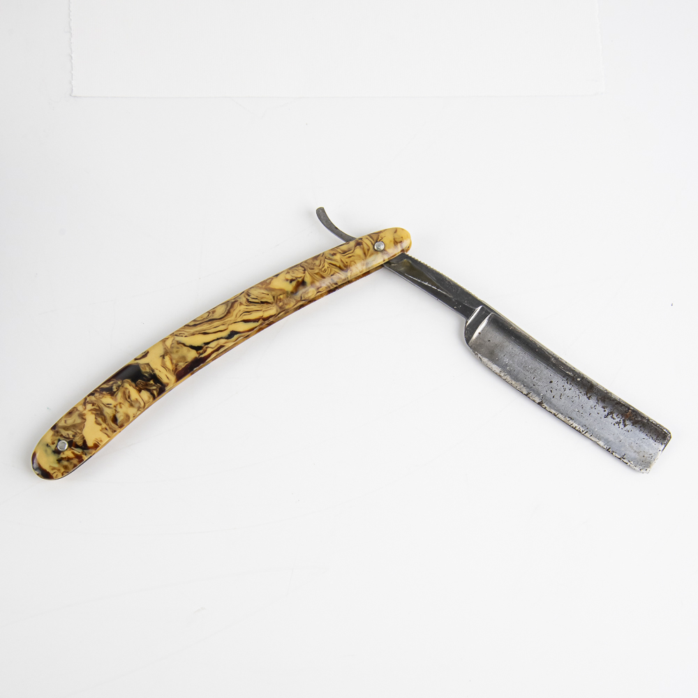 Vintage Straight Razor by J.R. Torrey Co., with yellow/brown swirled plastic scales. The face is blank, Tang reads “The J.R. Torrey Co. Worcester Mass.” with “US” and arrow through it, and reverse is blank. Blade is in overall rough condition, with two small chips in blade, has cosmoline protectant applied, with light tarnish noted. Original Box NOT included. See photos and bid accordingly.