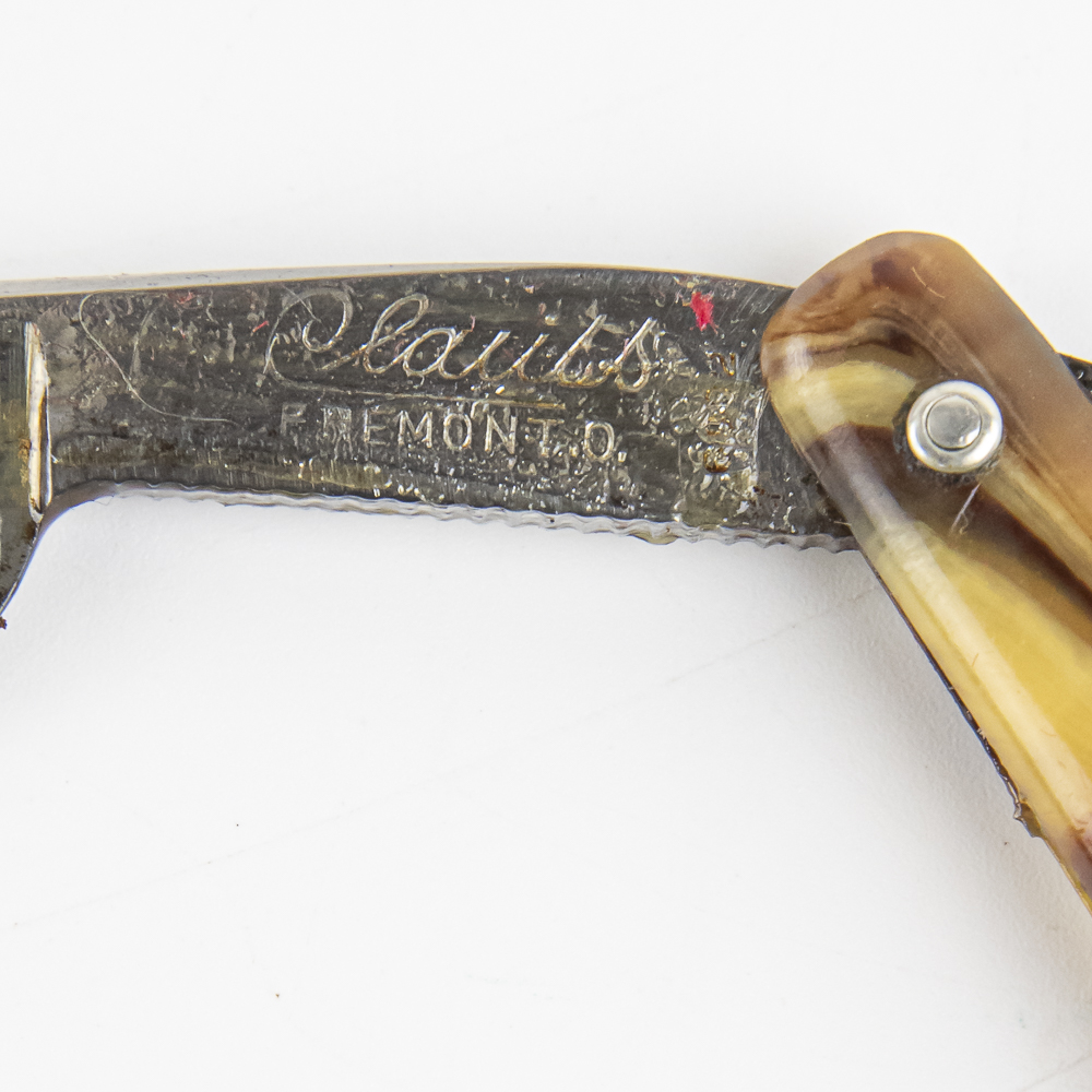 **REVIEW MATERIAL Vintage Straight Razor “6902” by Clauss, with __ scales. The face is blank, Tang reads “Clauss Fremont. O. 6902”, and reverse is blank. Blade is in overall great condition, with nice luster, minor spotty tarnish noted, and has cosmoline protectant applied. Original Box NOT included. See photos and bid accordingly.