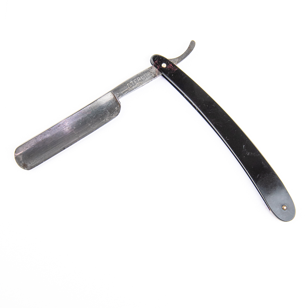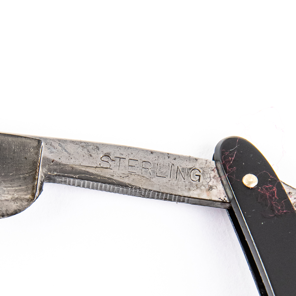 Vintage Straight Razor “Sterling”. Has black plastic scales, with slight stain present on back side. The face is blank, Tang reads “Sterling”, and reverse is blank. Has a round point blade, which is in overall great condition, nice luster, but with minor tarnish noted. Original Box NOT included. See photos and bid accordingly.