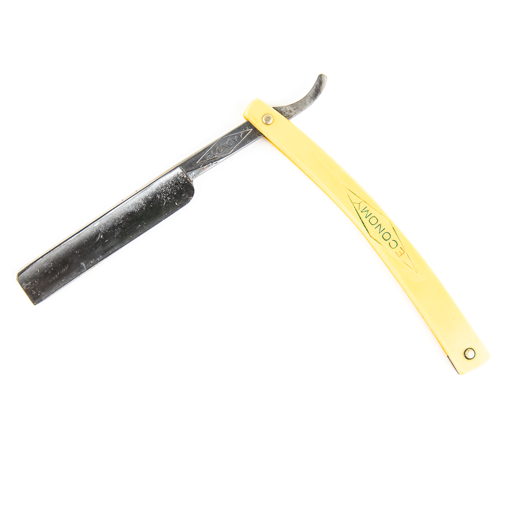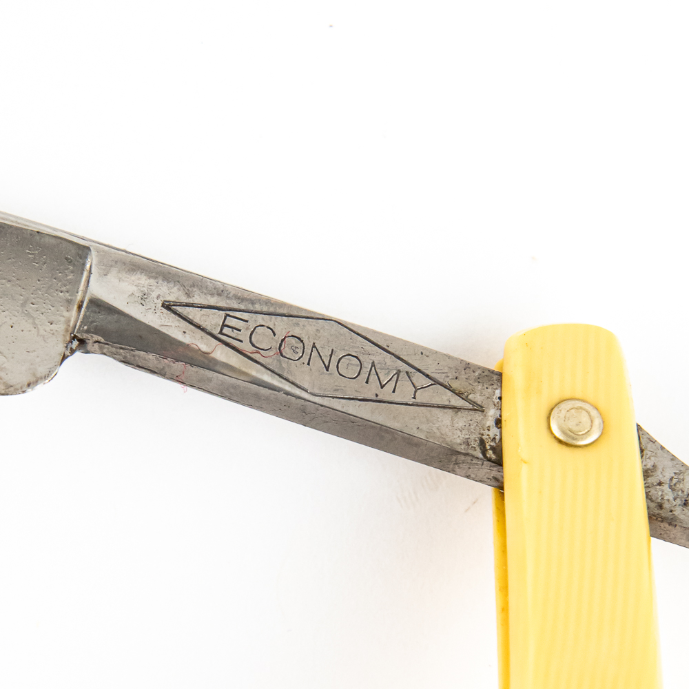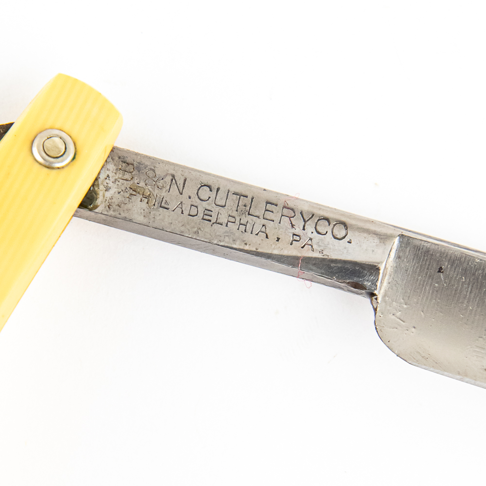 Vintage Straight Razor “Economy” by B & N Cutlery Co . Has yellowed celluloid scales with “Economy” inside a diamond shape in dark green/blue ink . The face is blank, Tang reads “Economy” inside a diamond, and reverse reads “B & N Cutlery Co. Philadelphia, Pa.” Has a french point blade, which is in overall great condition, nice luster, with very minimal tarnish noted. Original Box NOT included. See photos and bid accordingly.