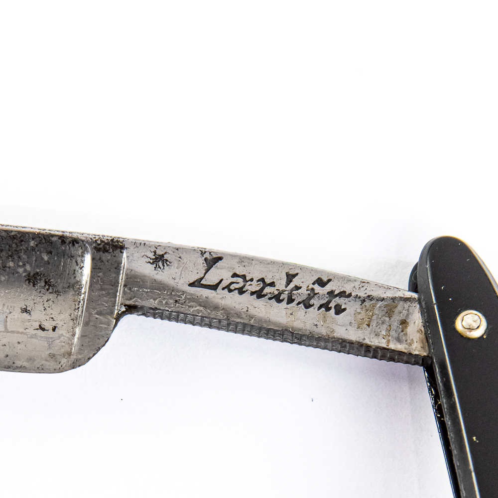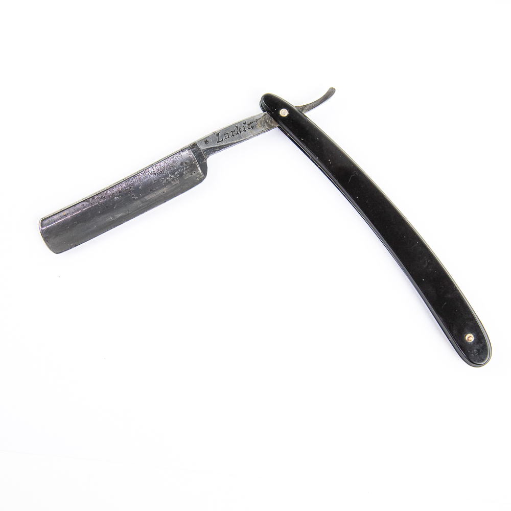 Vintage Straight Razor “Larkir.” by Unknown Mfg. Has black Bakelite scales. The face is blank, Tang reads what looks like “Larkir.” due to font, may be up for interpretation and reverse is blank. Has a round point blade, which is in overall great condition, with light tarnish noted near top of blade. Original Box NOT included. See photos and bid accordingly.
