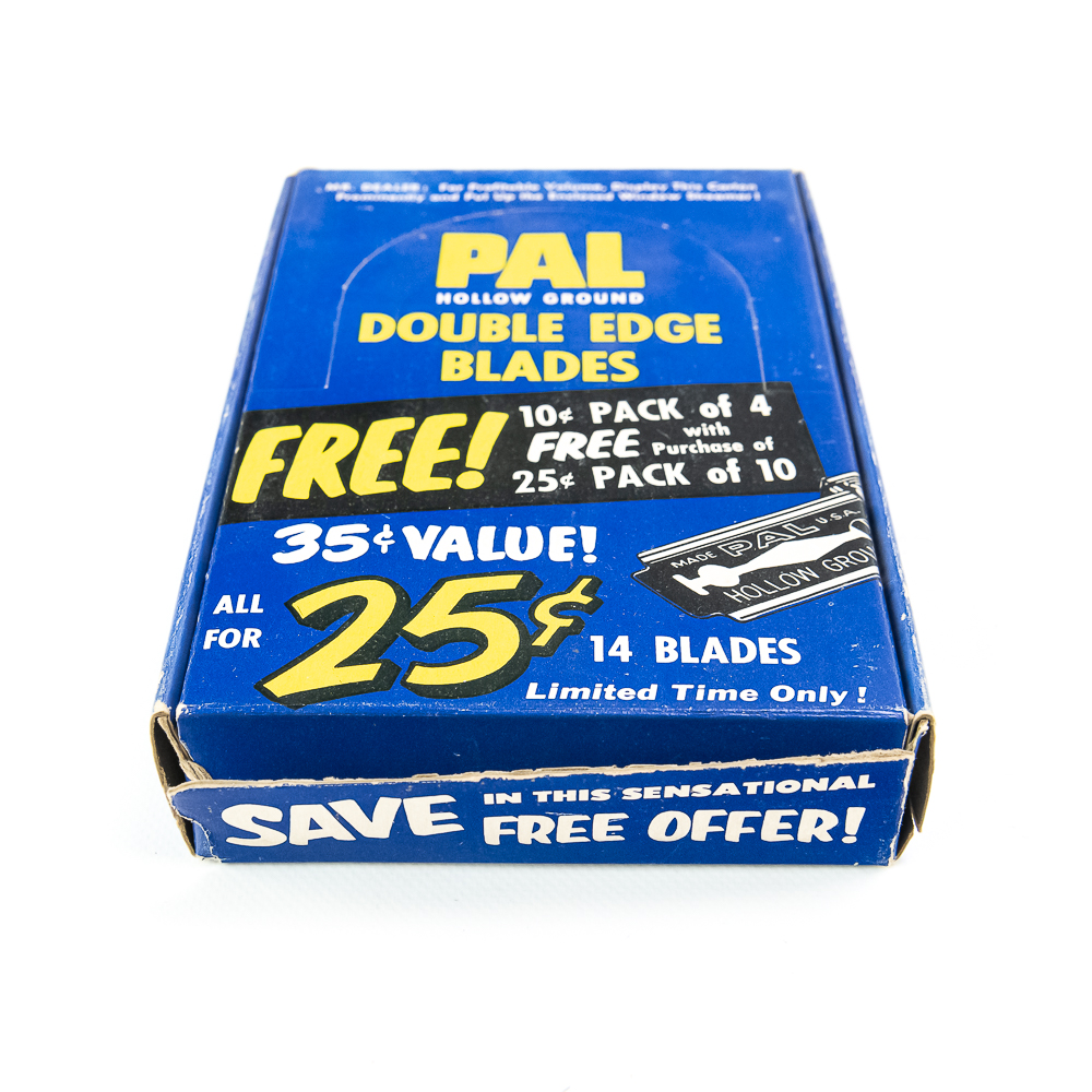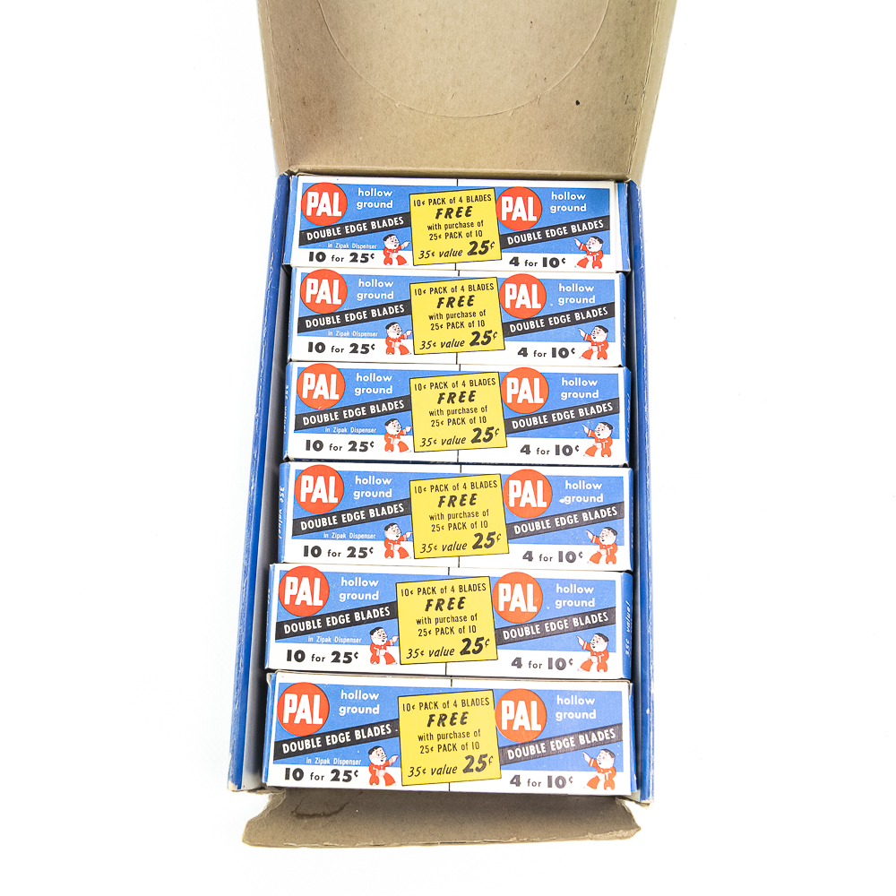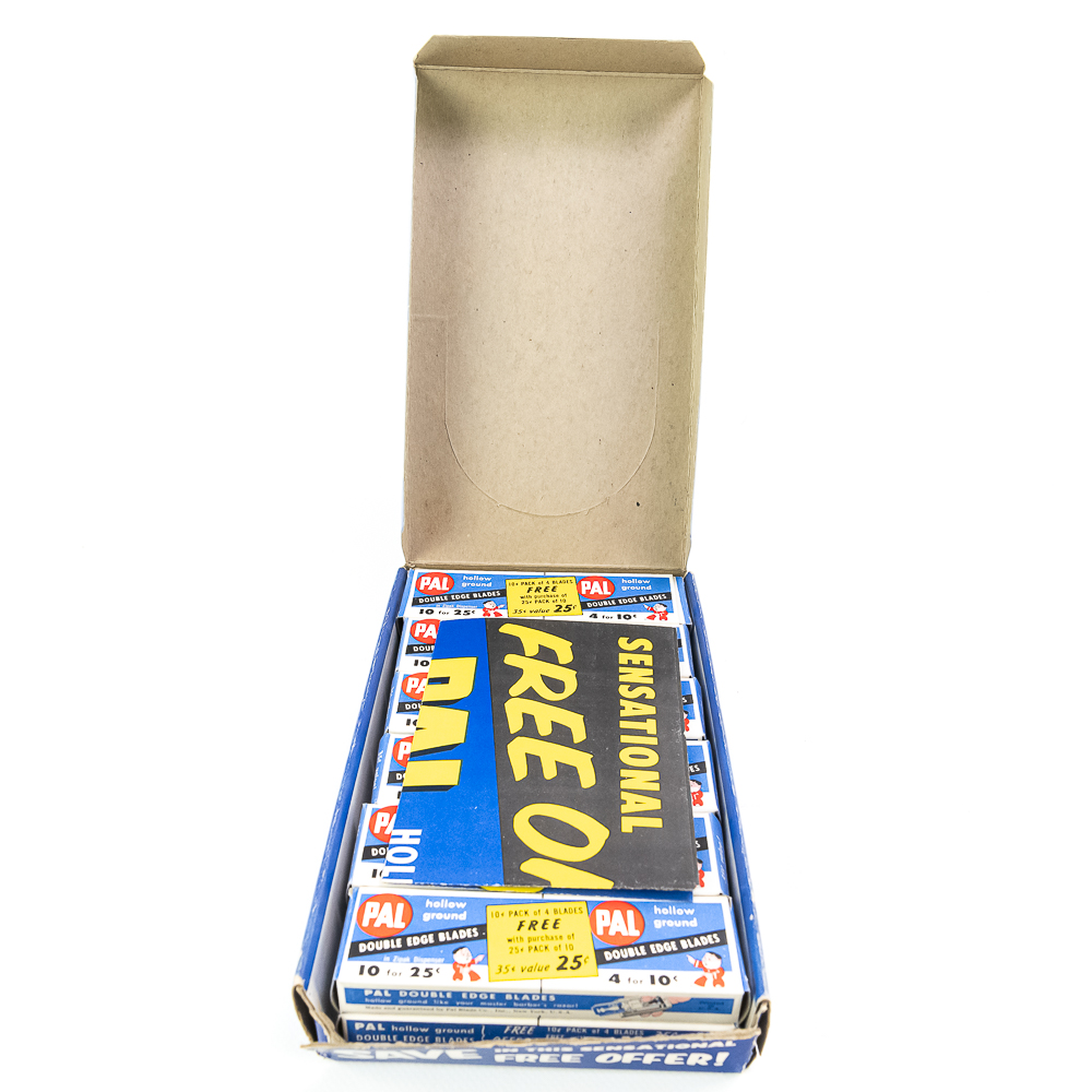 PAL Hollow Ground Double Edge Blade store display, in good condition with light signs of wear from age and storage. Included is (12) packages of blades, and one paper advertisement. See photos and bid accordingly.