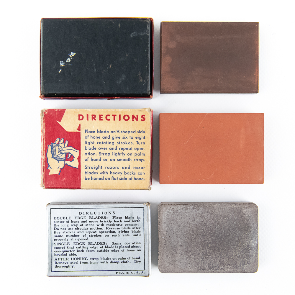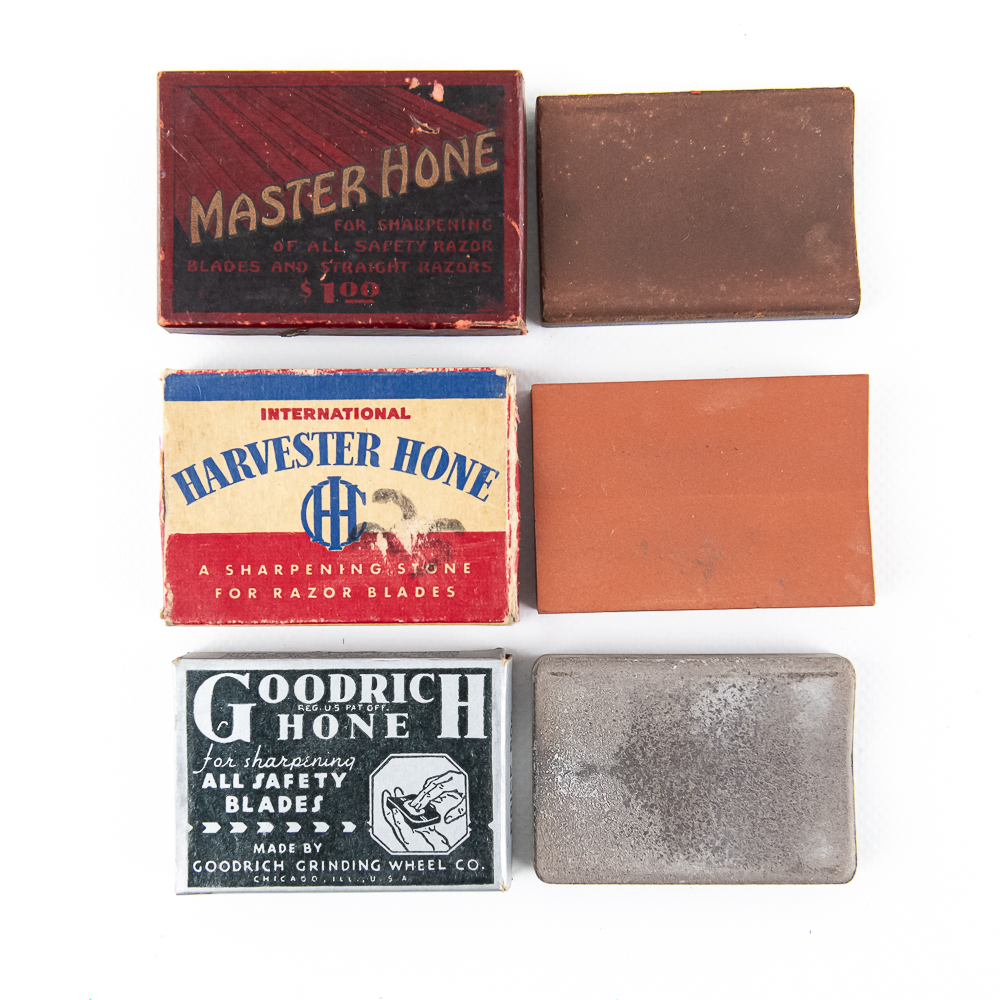 Lot of 3 Vintage Straight Razor hones, all in orginal box and in great condition. Included is a “Master Hone” , “International Harvester Hone” , and a “Goodrich Hone.” See photos and bid accordingly.