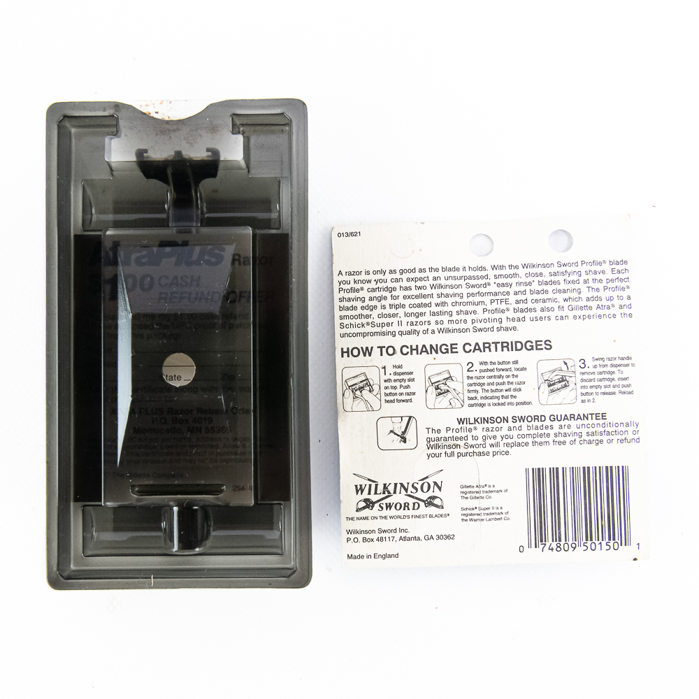 Gillette Atra Plus Razor in original store packaging, with one package of 5 Wilkinson Sword Atra blades. See photos and bid accordingly.
