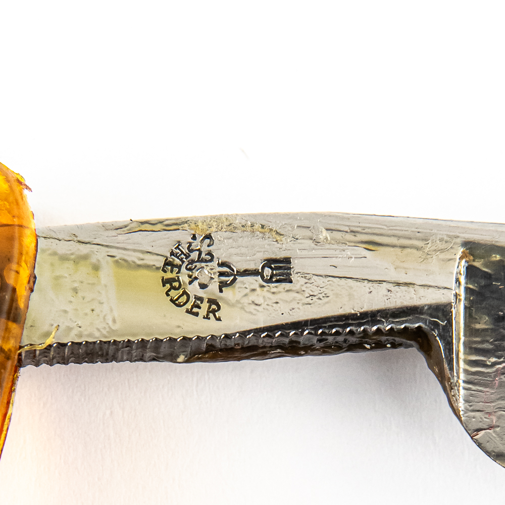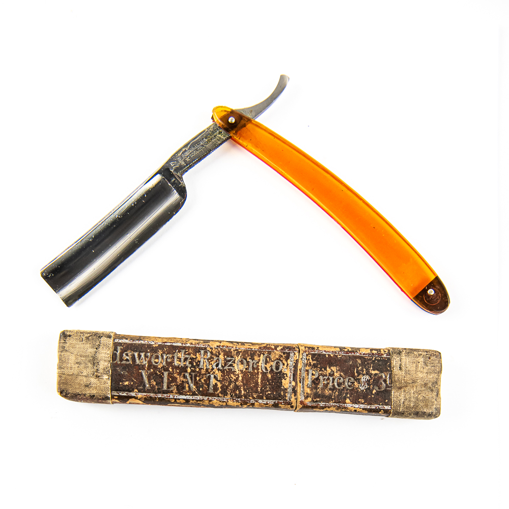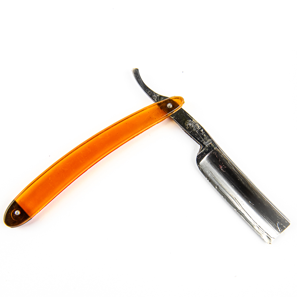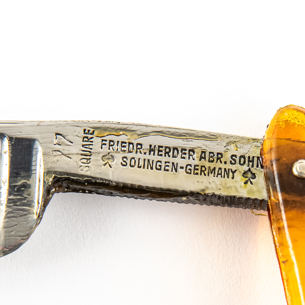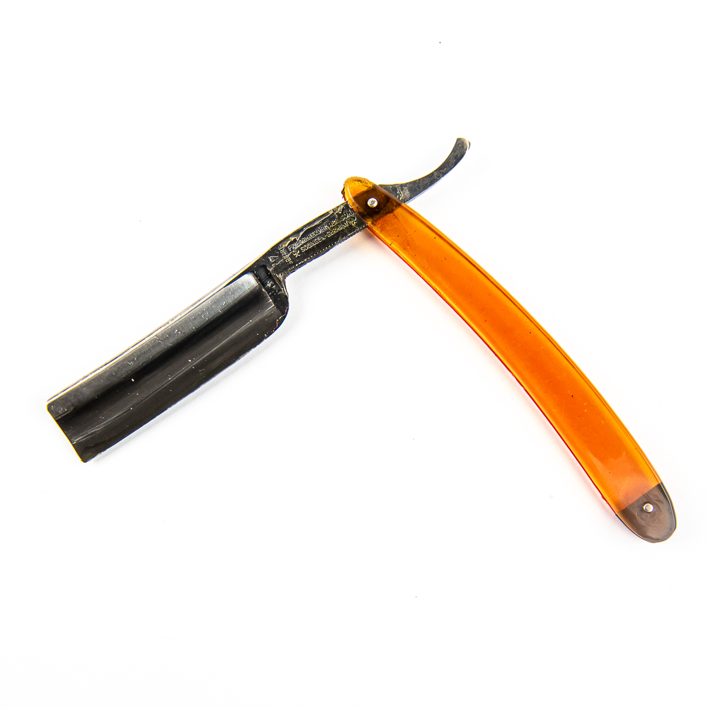 Vintage Straight Razor “77” by Friedr. Herder Abr. Sohn”, with translucent orange plastic scales. The face is blank, Tang reads “Friedr. Herder Abr. Sohn Solingen Germany” and “77 Square”, and reverse has engraved logo. Blade is in overall pristine condition, with amazing luster, has cosmoline protectant applied. Unoriginal Box is included, reads “(beginning cut off) dsworth Razor Co XLNT” and is in fair condition, with taped ends. See photos and bid accordingly.