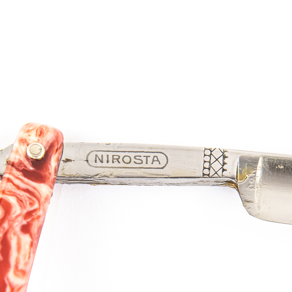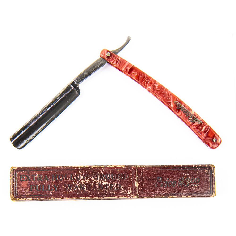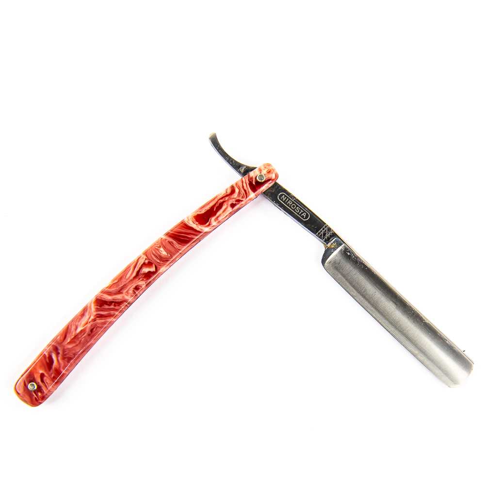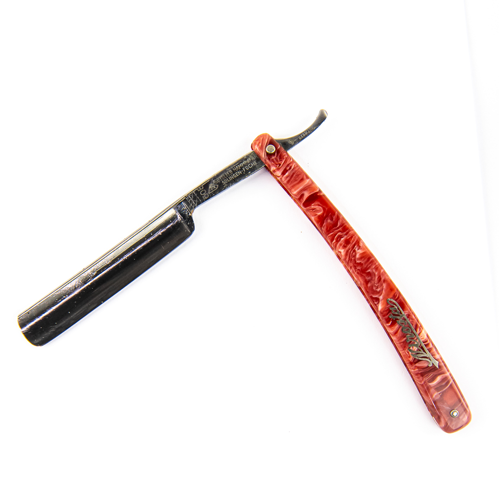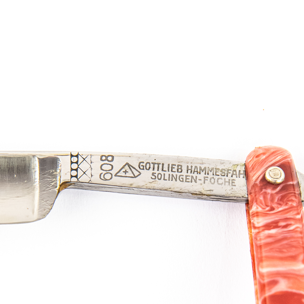 Vintage Straight Razor “608” by Gottlieb Hammesfah, with red/pink swirl plastic scales with metal “Nirosta” pressed in side. The face is blank, Tang reads “Gottlieb Hammesfah Solingen-Foche” with pyramid and “608”, and reverse reads “Nirosta” and tail reads “Germany”. Blade is in overall pristine condition, with shiny luster, has cosmoline protectant applied. Unoriginal Box IS included, reads Extra Hollow Ground Fully Warranted” and is in fair condition. See photos and bid accordingly.
