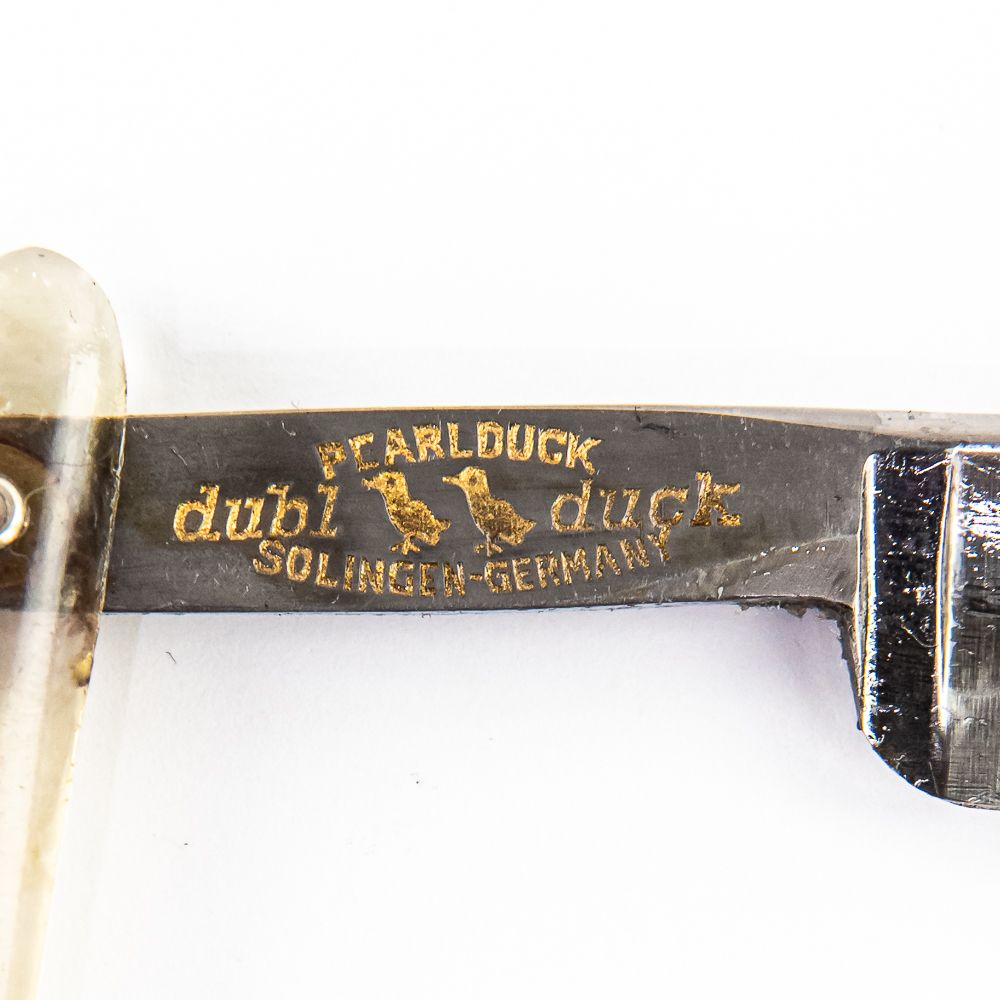Vintage Straight Razor “Satinedge” by Dubl Duck, with clear plastic scales, wiuth brass colored cap on end, with “Satinedge” pressed into side. The face is blank, Tang reads “dubl duck Satinedge” with two ducks, all in gold lettering, and reverse reads “dubl duck Pearlduck Solingen Germany” with two ducks, also in gold lettering. Blade is in overall pristine condition, with shiny luster, has cosmoline protectant applied. Potentially Original Box IS included, reads “dubl duck Goldedge razor” and is in great condition. See photos and bid accordingly.