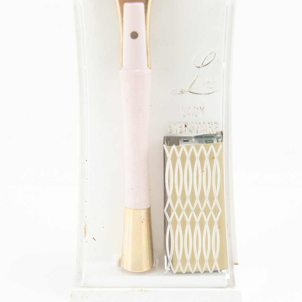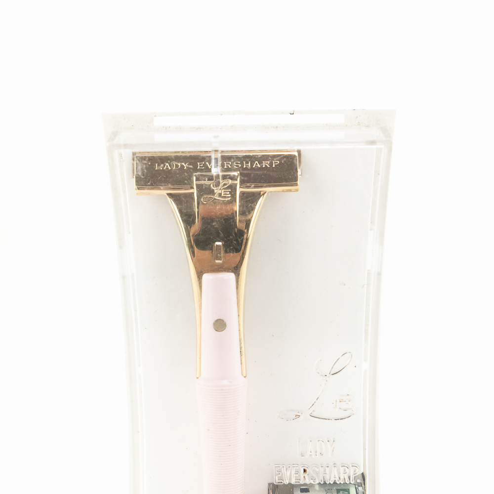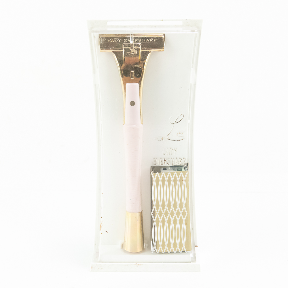 Vintage Lady Eversharp razor, has pink handle with gold finish. Set includes razor, Schick Injector, and instruction manual. Case is in fair condition with scratches from age and storage. See photos and bid accordingly.