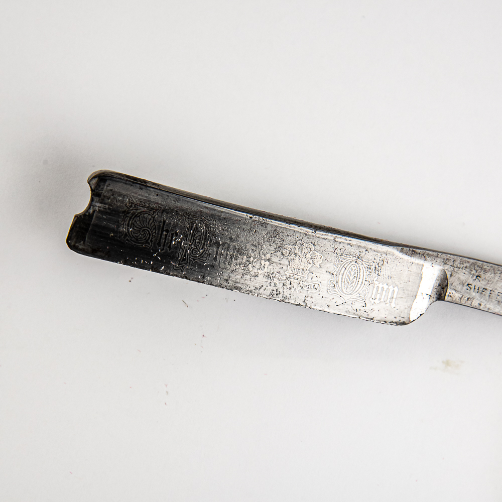 Vintage Straight Razor “The Prince’s Own”, with horn scales, is cracked and lose near pivot-pin, also has light scratches throughout. The face reads “The Prince’s Own”, Tang is unreadable, however “Sheffield” can be partially read, and reverse is blank. Maker is unknown, however may potentially be Frederick Reynolds due to similar blades by that make. Blade is in overall great condition, with nice luster, minor tarnish, has cosmoline protectant applied. Original Box NOT. See photos and bid accordingly.
