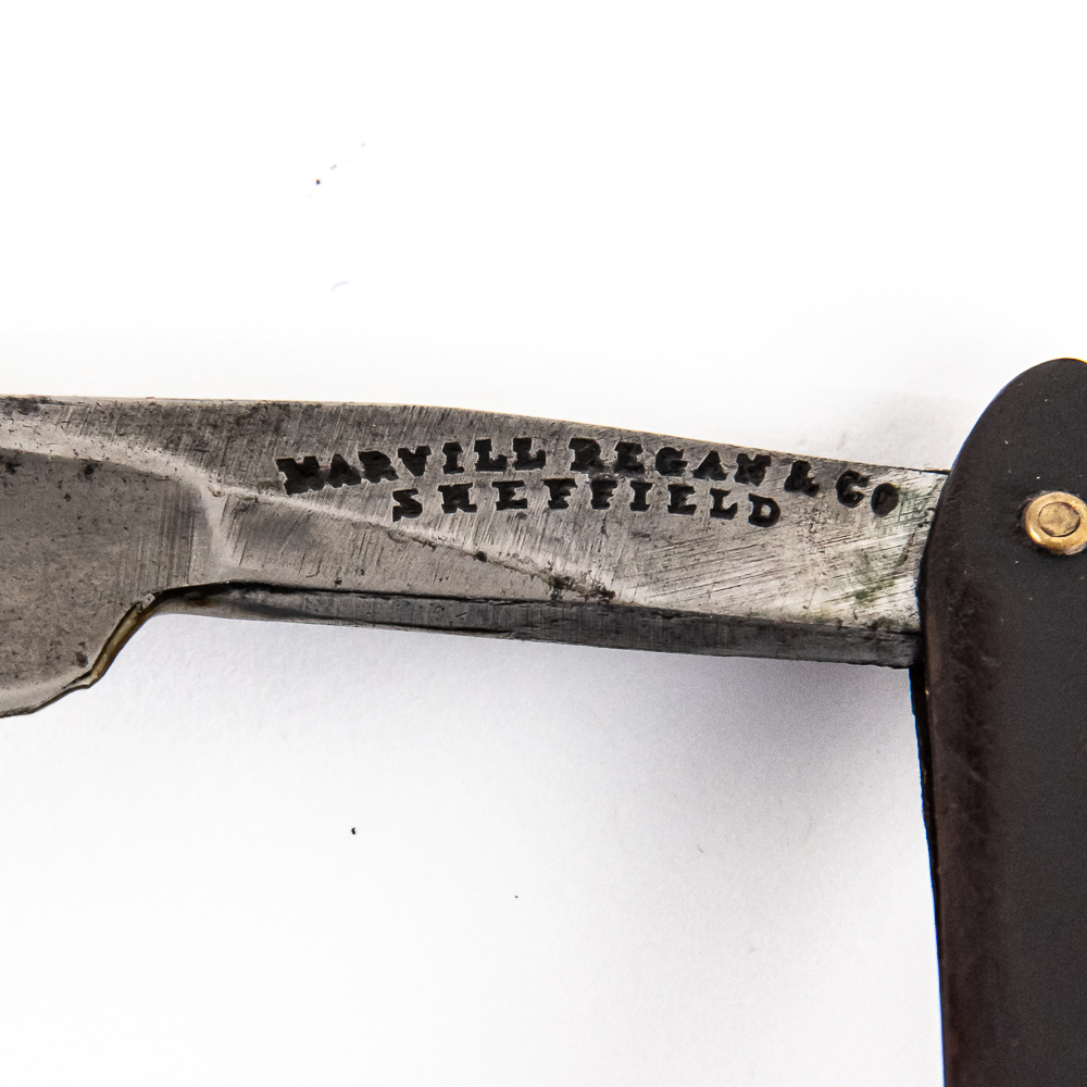 Vintage Straight Razor by Marvill Regan & Co, with black horn scales, with “The Old English Razor” engraved and painted gold. Scales also exhibit light scratches and a crack near wedge pin on front. The face is blank, Tang reads “Marvill Regan & Co Sheffield”, and reverse is blank. Blade is in overall great condition, however light tarnish and scuffing noted, has cosmoline protectant applied. Original Box NOT included. See photos and bid accordingly.