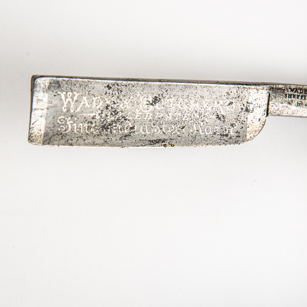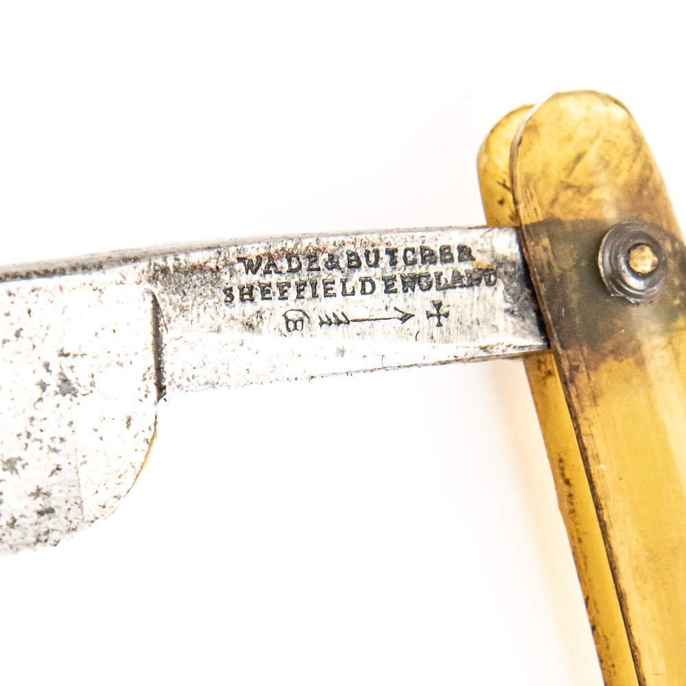*CONFIRM SCALE MATERIAL* Vintage Straight Razor “Celebrated Fine India Steel Razor” by Wade & Butcher, with translucent (HORN) scales that exhibit small chunks missing throughout. The face reads “Wade & Butchers Celebrated Fine India Steel Razor” , Tang reads “Wade & Butcher Sheffield England” with logo, and reverse is blank. Blade is in overall great condition, with nice luster, however spotty tarnish is present, has cosmoline protectant applied. Original Box __ included and is in __ condition. See photos and bid accordingly.